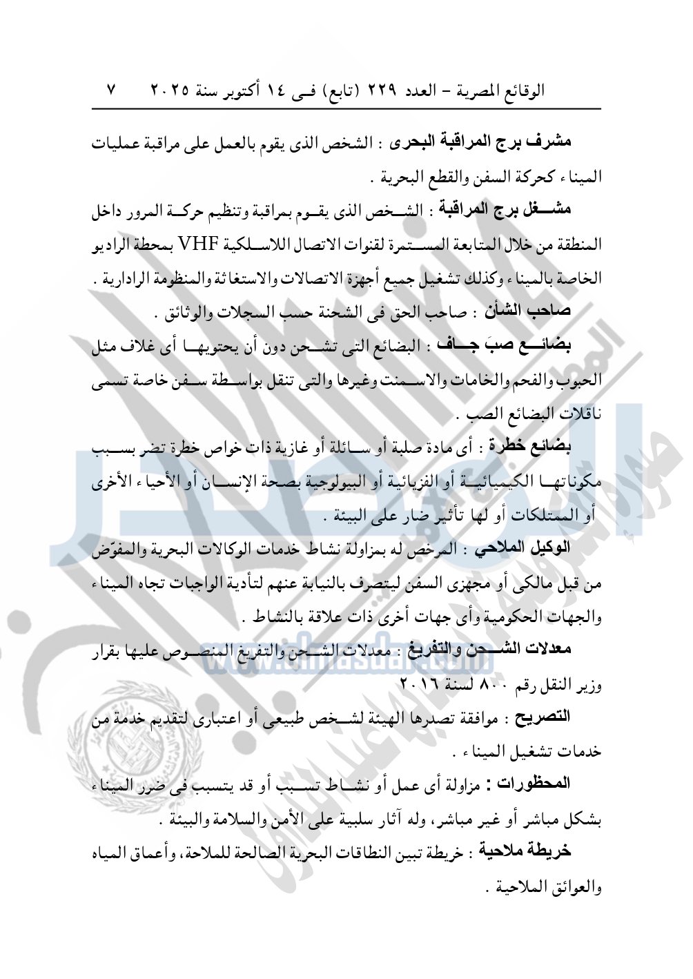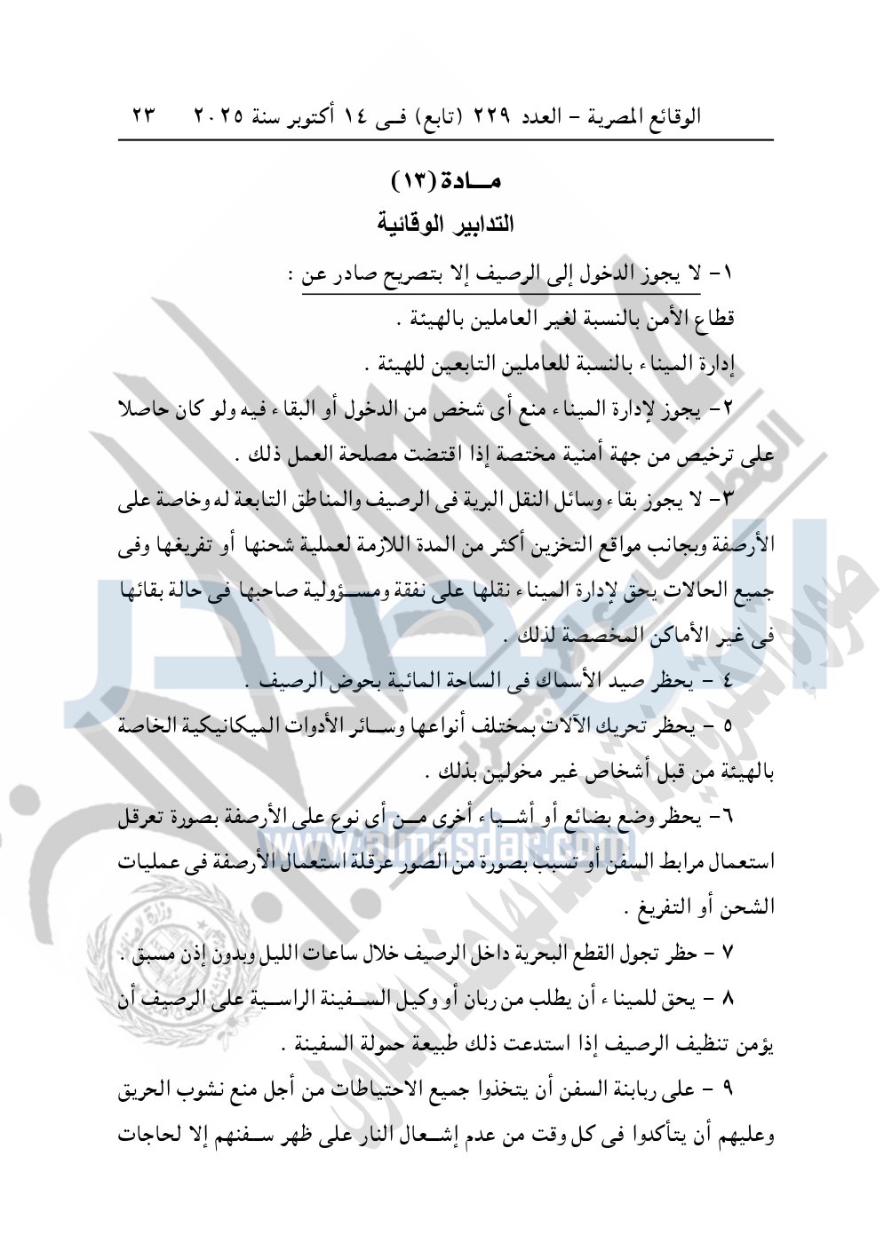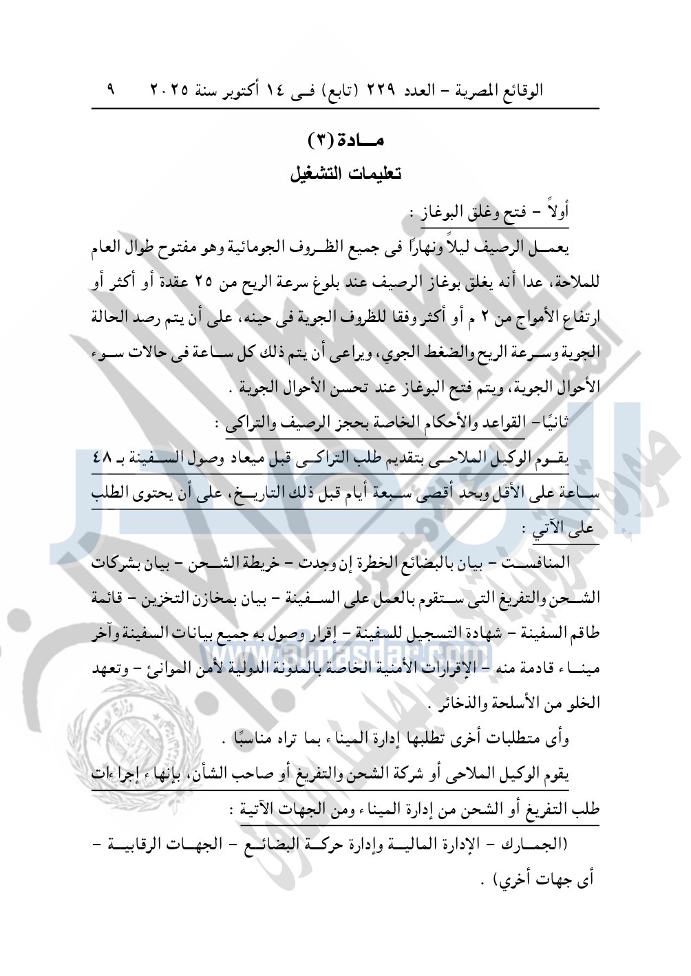 نشرت الوقائع المصرية في العدد 229 "تابع"، الصادر بتاريخ 14 أكتوبر 2025، قرار وزارة الكهرباء والطاقة المتجددة، رقم 94 لسنة 2025، صادر بتاريخ 2-8-2025، بشأن إصدار لائحة إدارة وتشغيل ميناء الضبعة التخصصي.