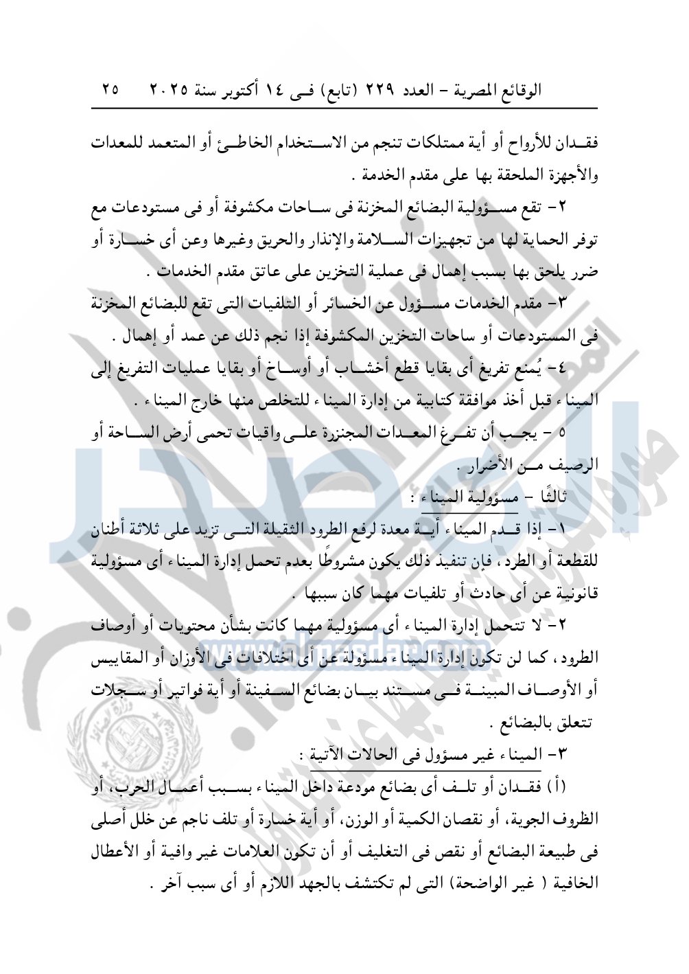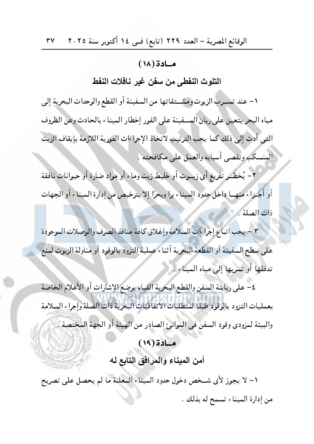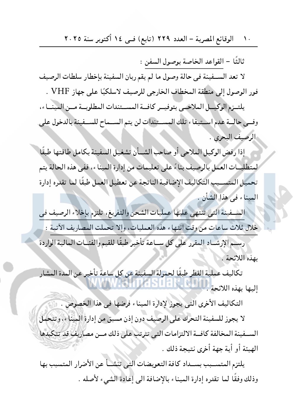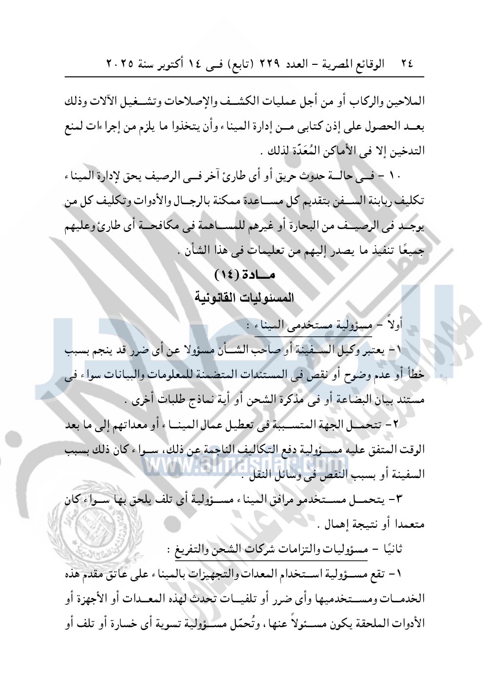نشرت الوقائع المصرية في العدد 229 "تابع"، الصادر بتاريخ 14 أكتوبر 2025، قرار وزارة الكهرباء والطاقة المتجددة، رقم 94 لسنة 2025، صادر بتاريخ 2-8-2025، بشأن إصدار لائحة إدارة وتشغيل ميناء الضبعة التخصصي.