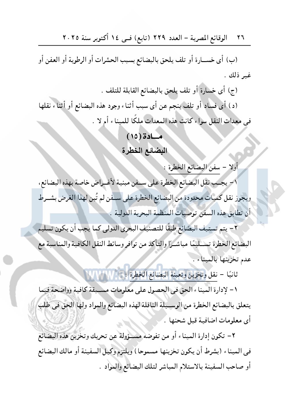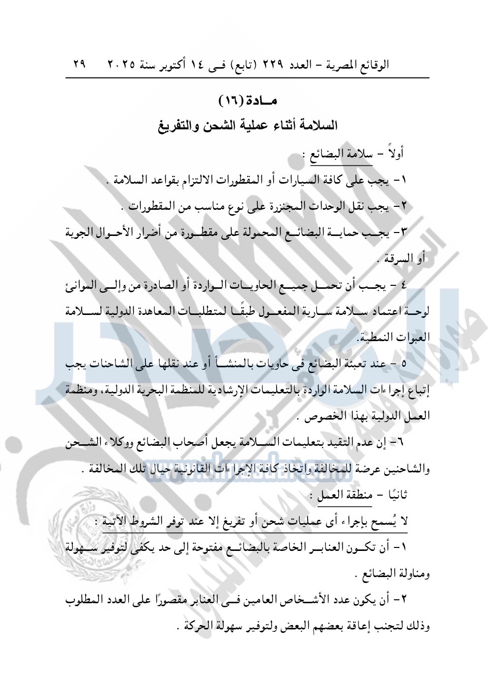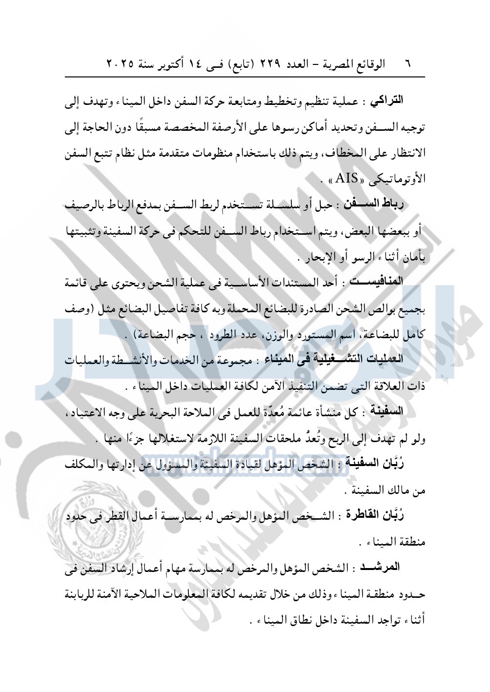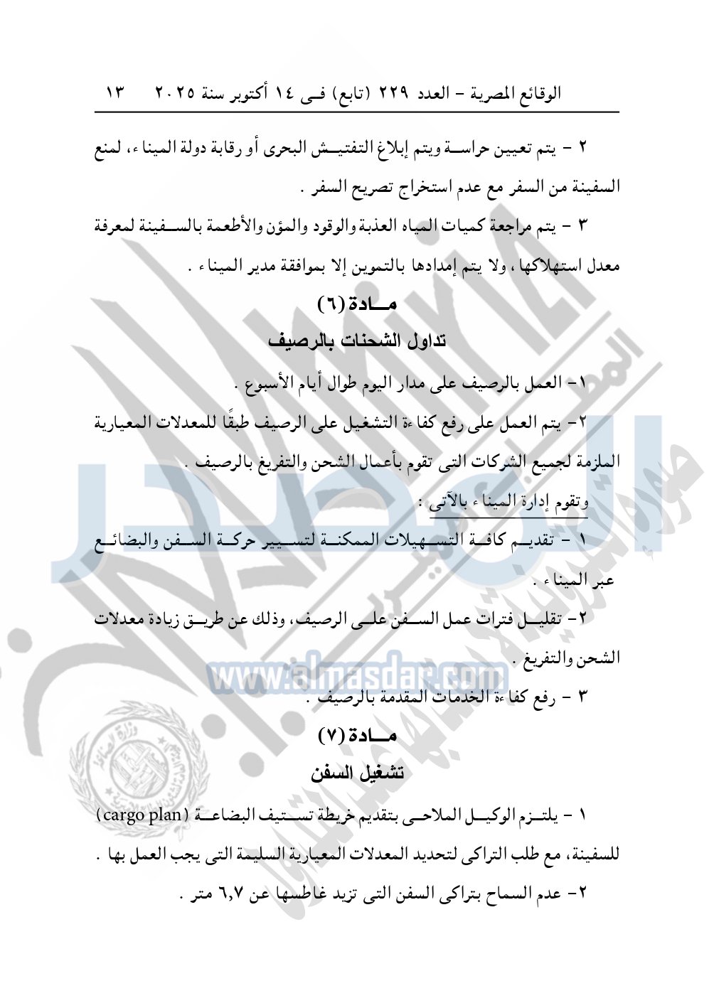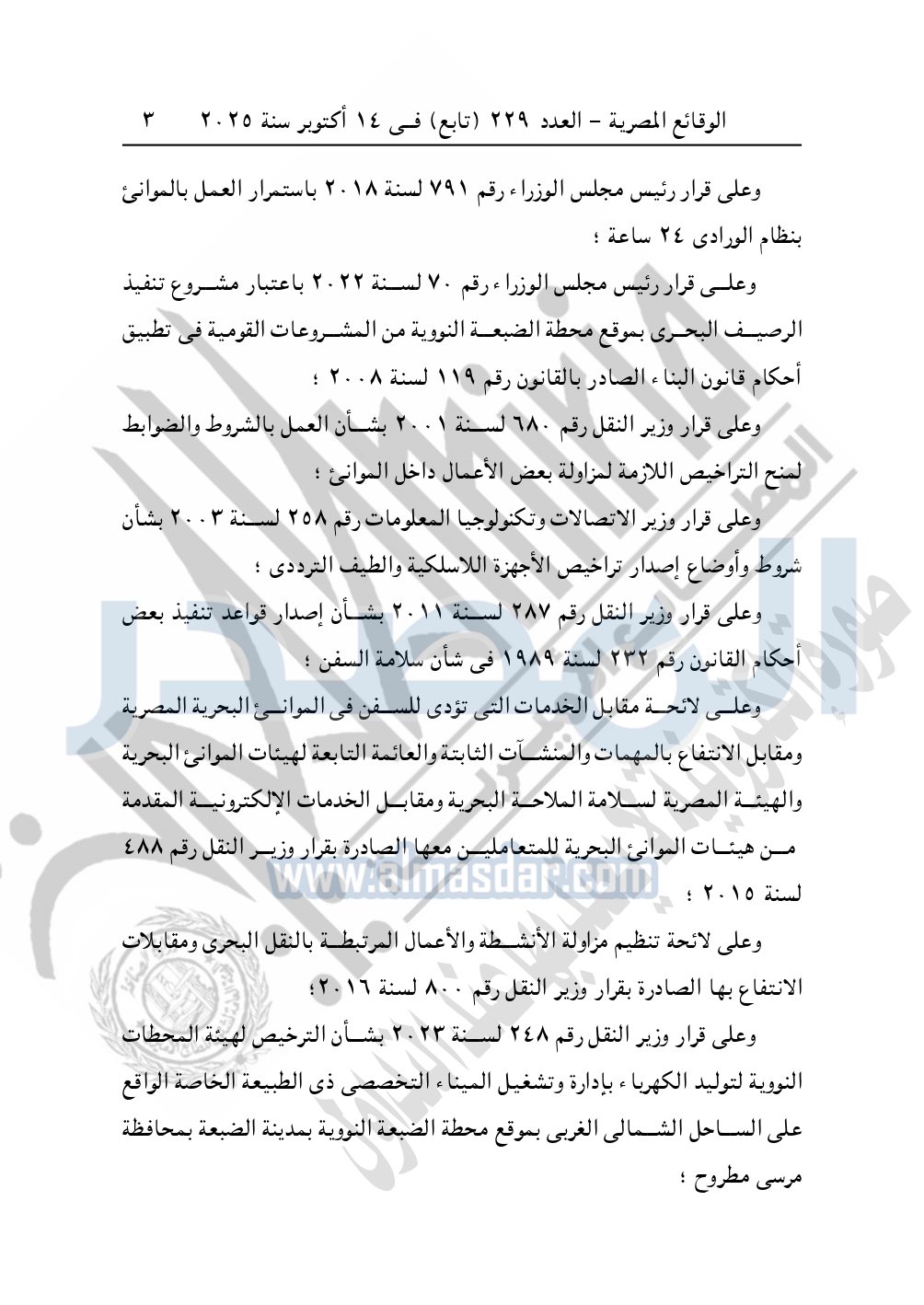 وأضافت الوقائع المصرية، أن القرار جاء بعد الاطلاع أيضاً على القانون رقم 1 لسنة 1996 في شأن الموانئ الجافة والتخصصية؛ وعلى قانون تنظيم الاتصالات الصادر بالقانون رقم 10 لسنة 2003؛ وعلى قانون الجمارك الصادر بالقانون رقم 207 لسنة 2020؛ وعلى قرار رئيس الجمهورية رقم 309 لسنة 1981 باعتبار مشروع إقامة المحطات النووية لتوليد الكهرباء بجهة الضبعة بمحافظة مرسى مطروح من أعمال المنفعة العامة؛ وعلى قرار رئيس الجمهورية رقم 57 لسنة 2002 بتنظيم وزارة النقل؛ وعلى قرار رئيس الجمهورية رقم 399 لسنة 2004 بشأن إنشاء الهيئة المصرية السلامة الملاحة البحرية.