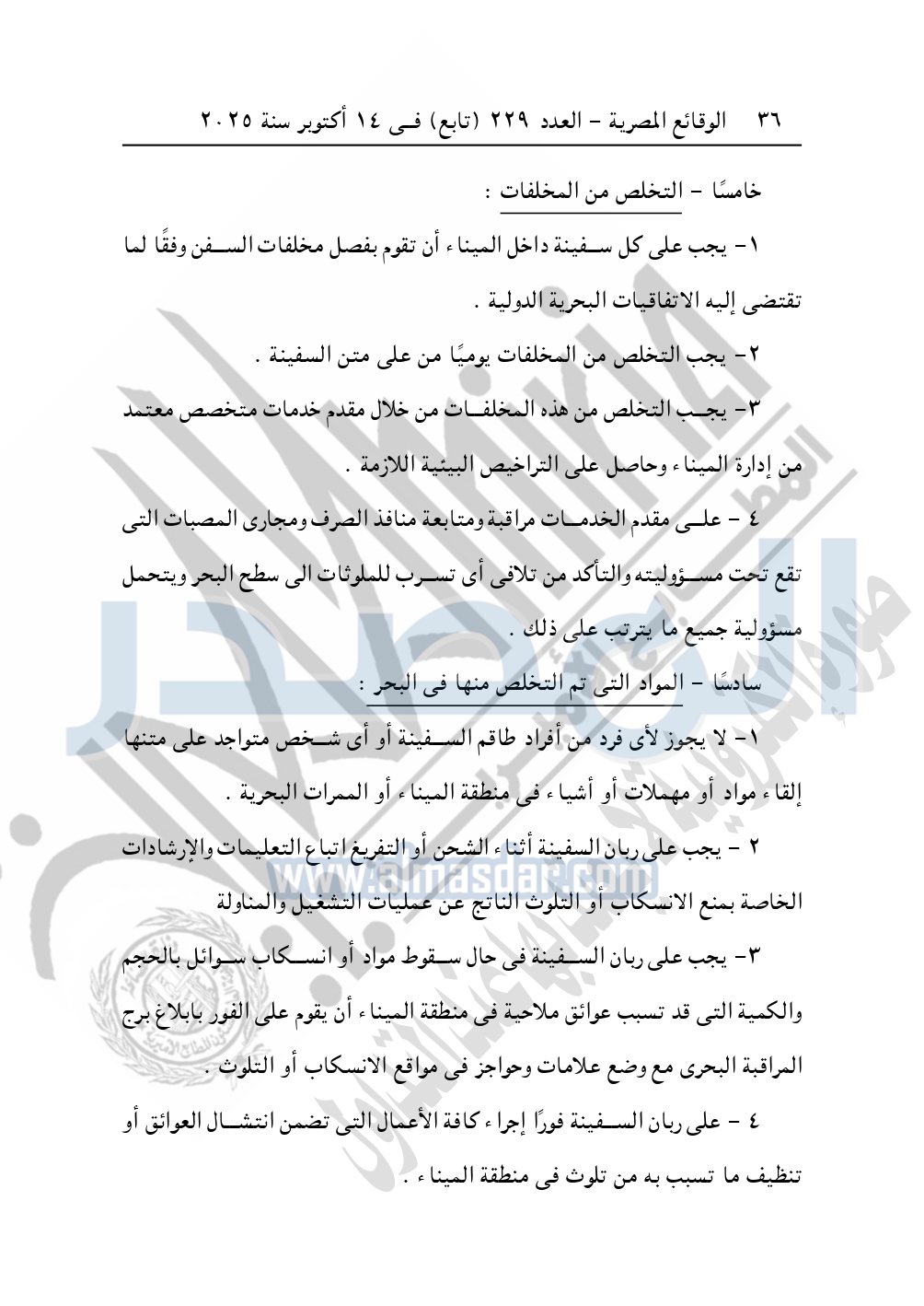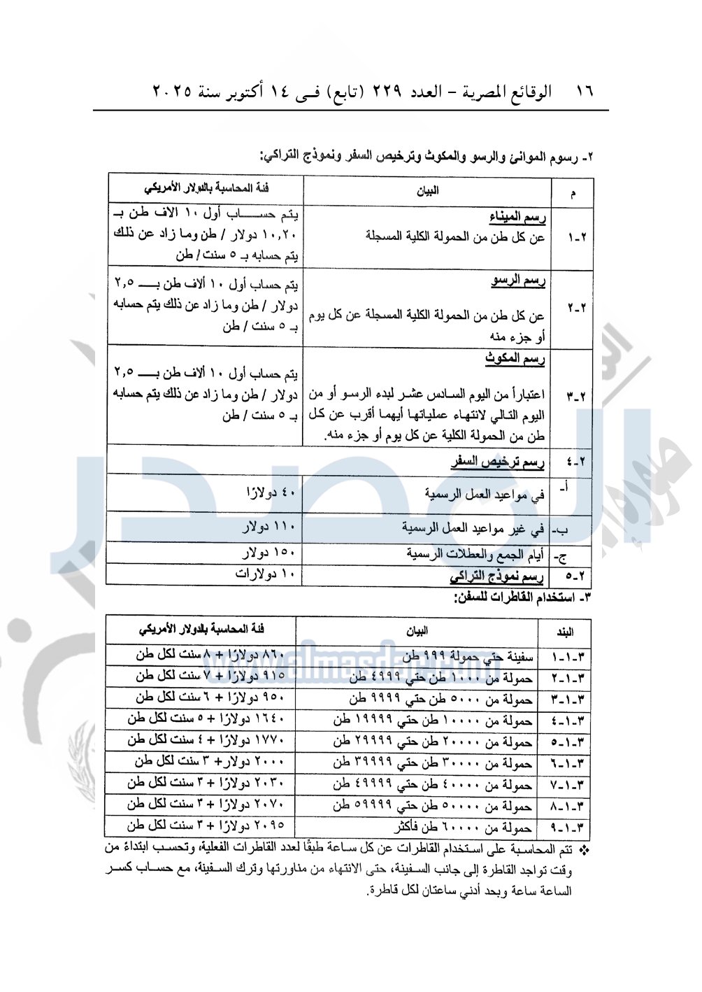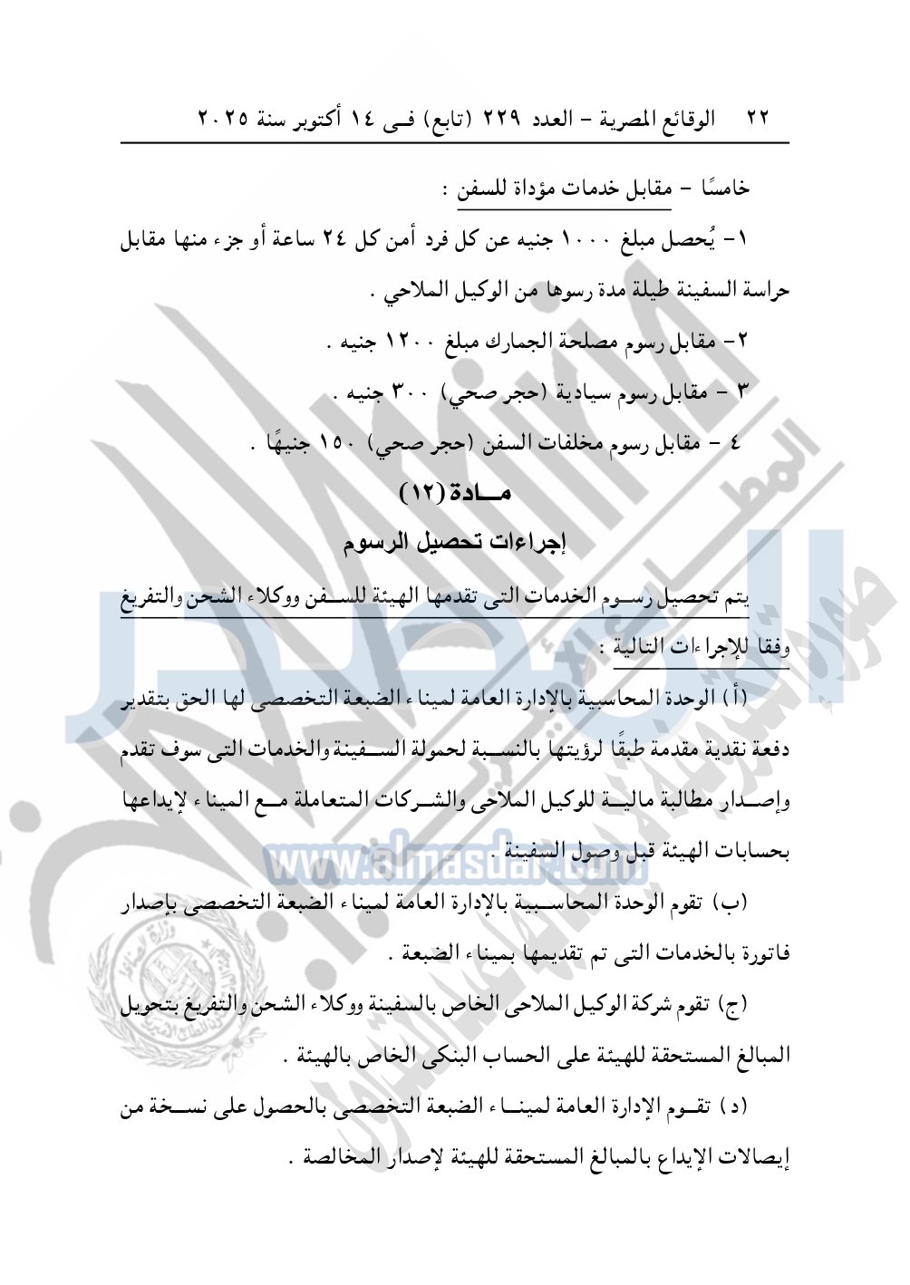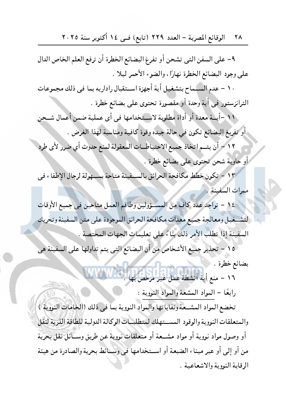 وأوضحت الوقائع المصرية، أن القرار جاء بعد الاطلاع على القانون رقم 44 لسنة 1955 في شأن إجراءات الحجر الصحي؛ وعلى القانون رقم 13 لسنة 1976 بإنشاء هيئة المحطات النووية لتوليد الكهرباء؛ وعلى قانون رسوم الإرشاد والتعويضات ورسوم الموانئ والمنائر والرسو والمكوث الصادر بالقانون رقم 24 لسنة 1983؛ وعلى القانون رقم 232 لسنة 1989 في شأن سلامة السفن؛ وعلى قانون التجارة البحرية الصادر بالقانون رقم 8 لسنة 1990؛ وعلى قانون البيئة الصادر بالقانون رقم 4 لسنة 1994.