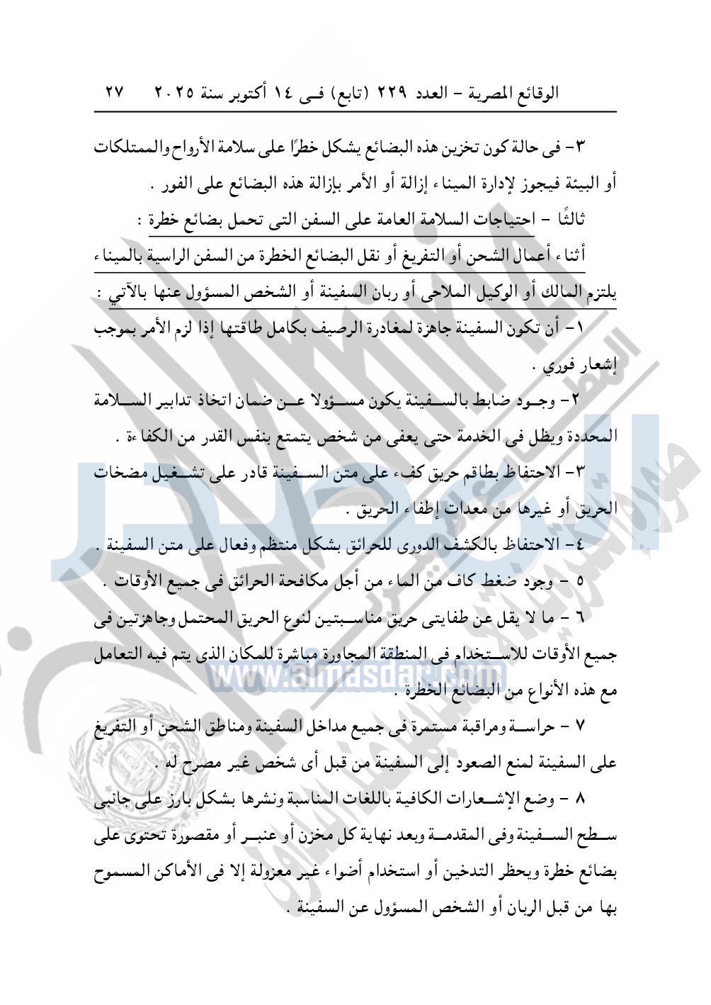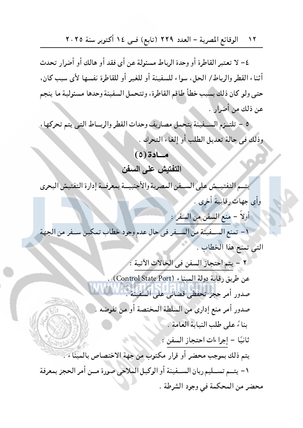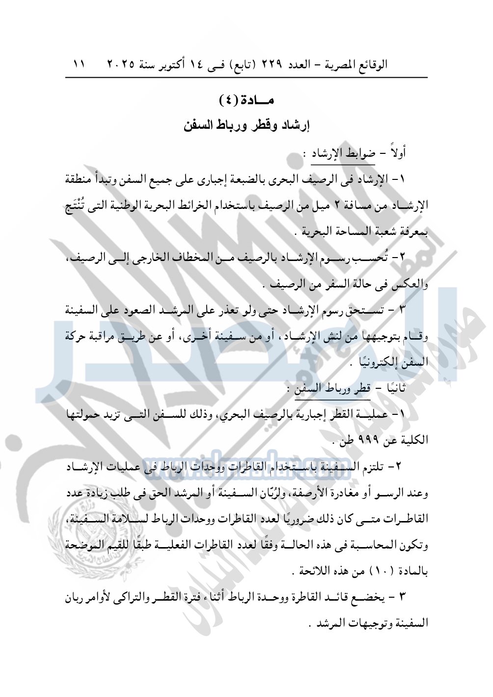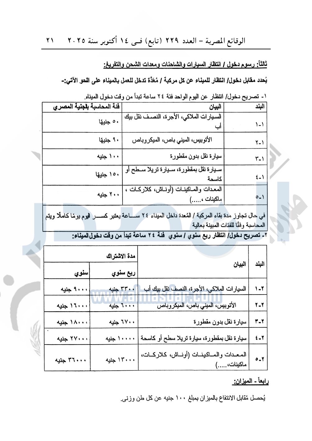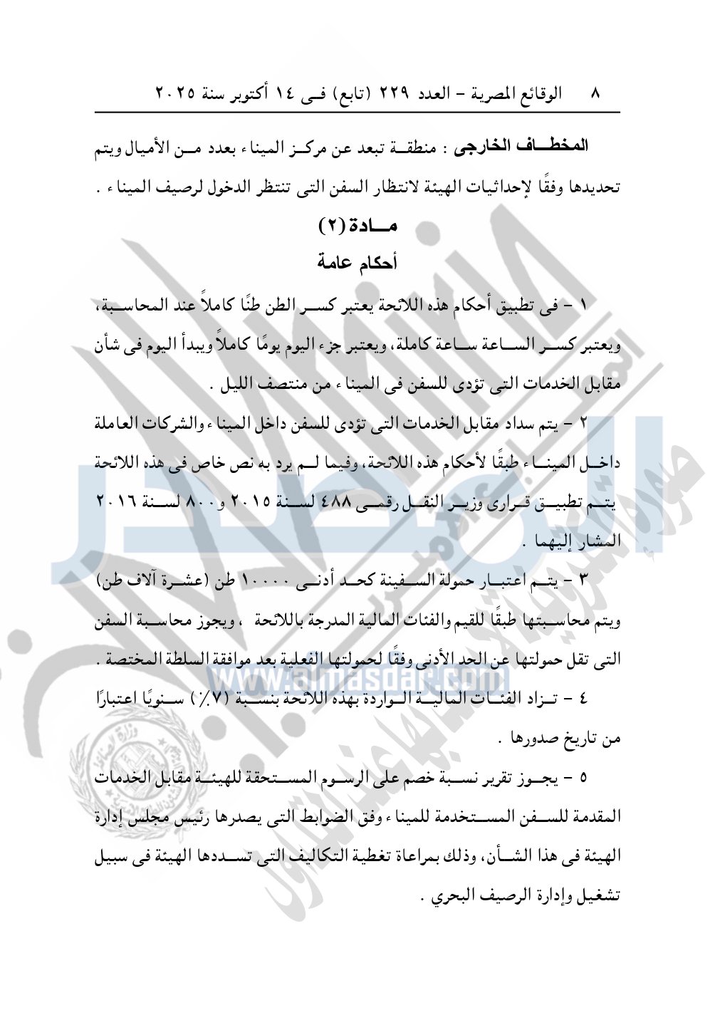 وأوضحت الوقائع المصرية، أن القرار جاء بعد الاطلاع على القانون رقم 44 لسنة 1955 في شأن إجراءات الحجر الصحي؛ وعلى القانون رقم 13 لسنة 1976 بإنشاء هيئة المحطات النووية لتوليد الكهرباء؛ وعلى قانون رسوم الإرشاد والتعويضات ورسوم الموانئ والمنائر والرسو والمكوث الصادر بالقانون رقم 24 لسنة 1983؛ وعلى القانون رقم 232 لسنة 1989 في شأن سلامة السفن؛ وعلى قانون التجارة البحرية الصادر بالقانون رقم 8 لسنة 1990؛ وعلى قانون البيئة الصادر بالقانون رقم 4 لسنة 1994.