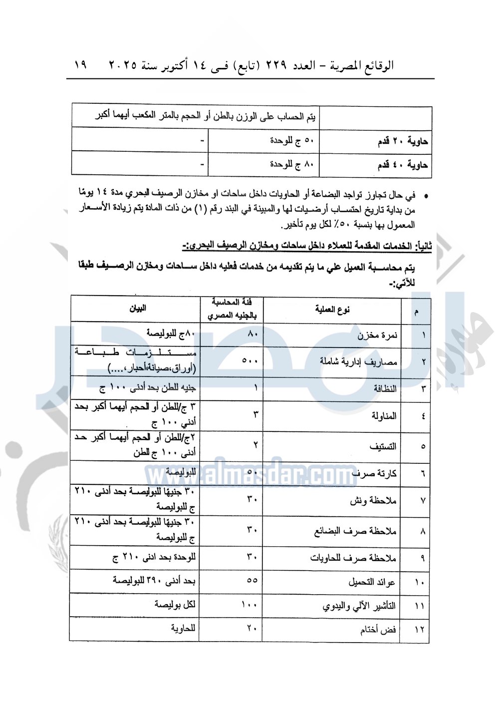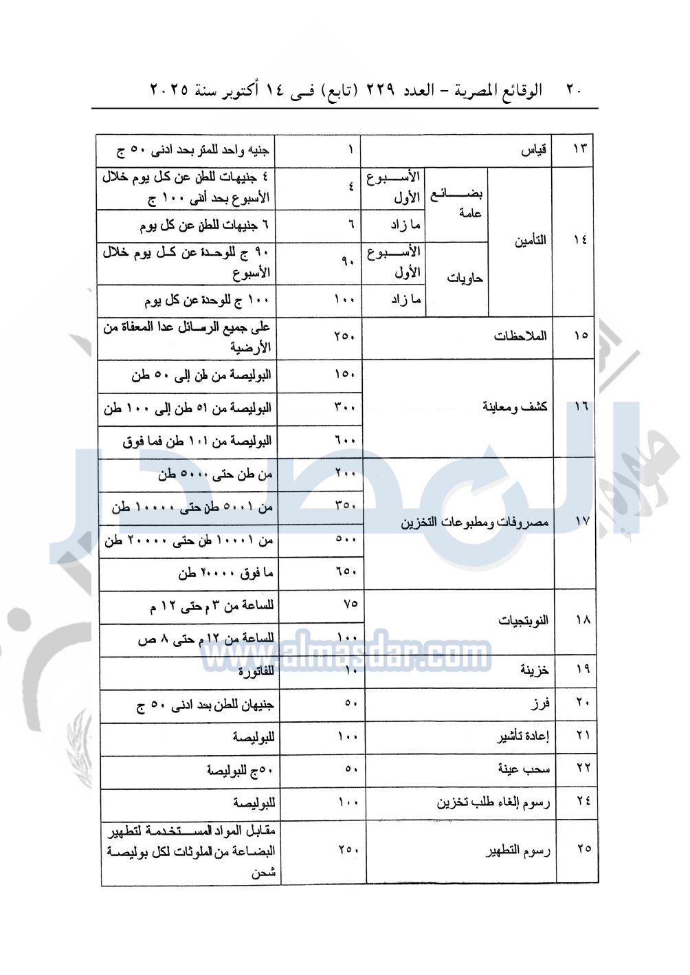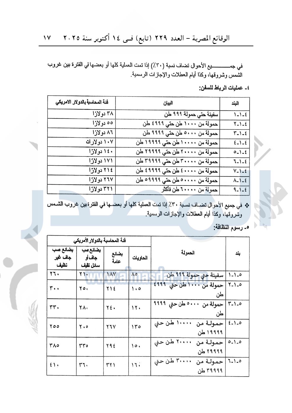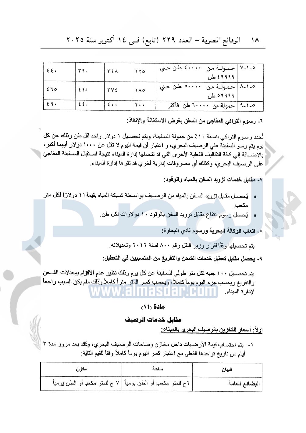 وأوضحت الوقائع المصرية، أن القرار جاء بعد الاطلاع على القانون رقم 44 لسنة 1955 في شأن إجراءات الحجر الصحي؛ وعلى القانون رقم 13 لسنة 1976 بإنشاء هيئة المحطات النووية لتوليد الكهرباء؛ وعلى قانون رسوم الإرشاد والتعويضات ورسوم الموانئ والمنائر والرسو والمكوث الصادر بالقانون رقم 24 لسنة 1983؛ وعلى القانون رقم 232 لسنة 1989 في شأن سلامة السفن؛ وعلى قانون التجارة البحرية الصادر بالقانون رقم 8 لسنة 1990؛ وعلى قانون البيئة الصادر بالقانون رقم 4 لسنة 1994.