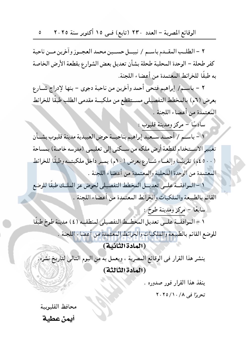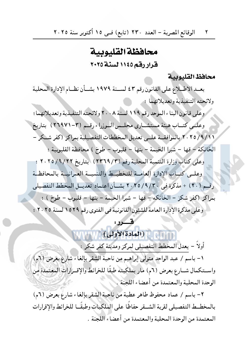 نشرت الوقائع المصرية في العدد 230 "تابع"، الصادر بتاريخ 15 أكتوبر 2025، قرار محافظة القليوبية، رقم 1145 لسنة 2025، بشأن اعتماد وتعديل المخططات التفصيلية لـ 6 مدن بالقليوبية.