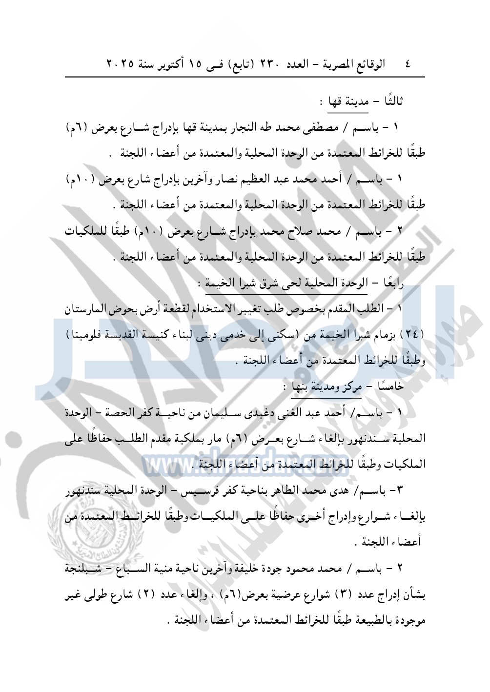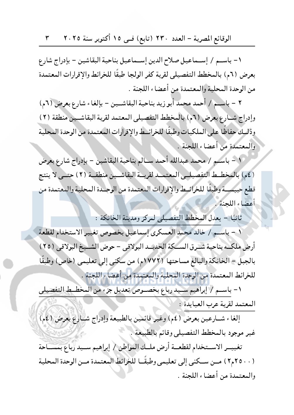 4- أحمد محمد أبو زيد بناحية البقاشين – بإلغاء شارع بعرض "6" وإدراج شارع بعرض "6م" بالمخطط التفصيلي المعتمد لقرية البقاشين منطقة "2" وذلك حفاظا على الملكيات وطبقًا للخرائط والإقرارات المعتمدة من الوحدة المحلية والمعتمدة من أعضاء اللجنة.