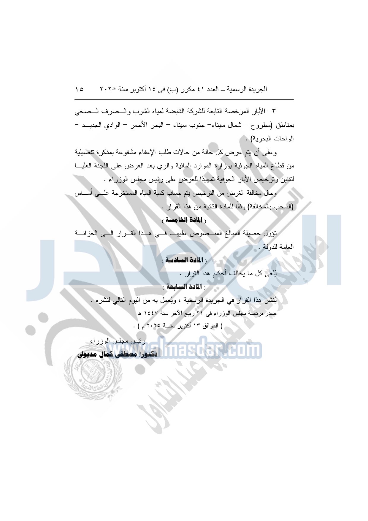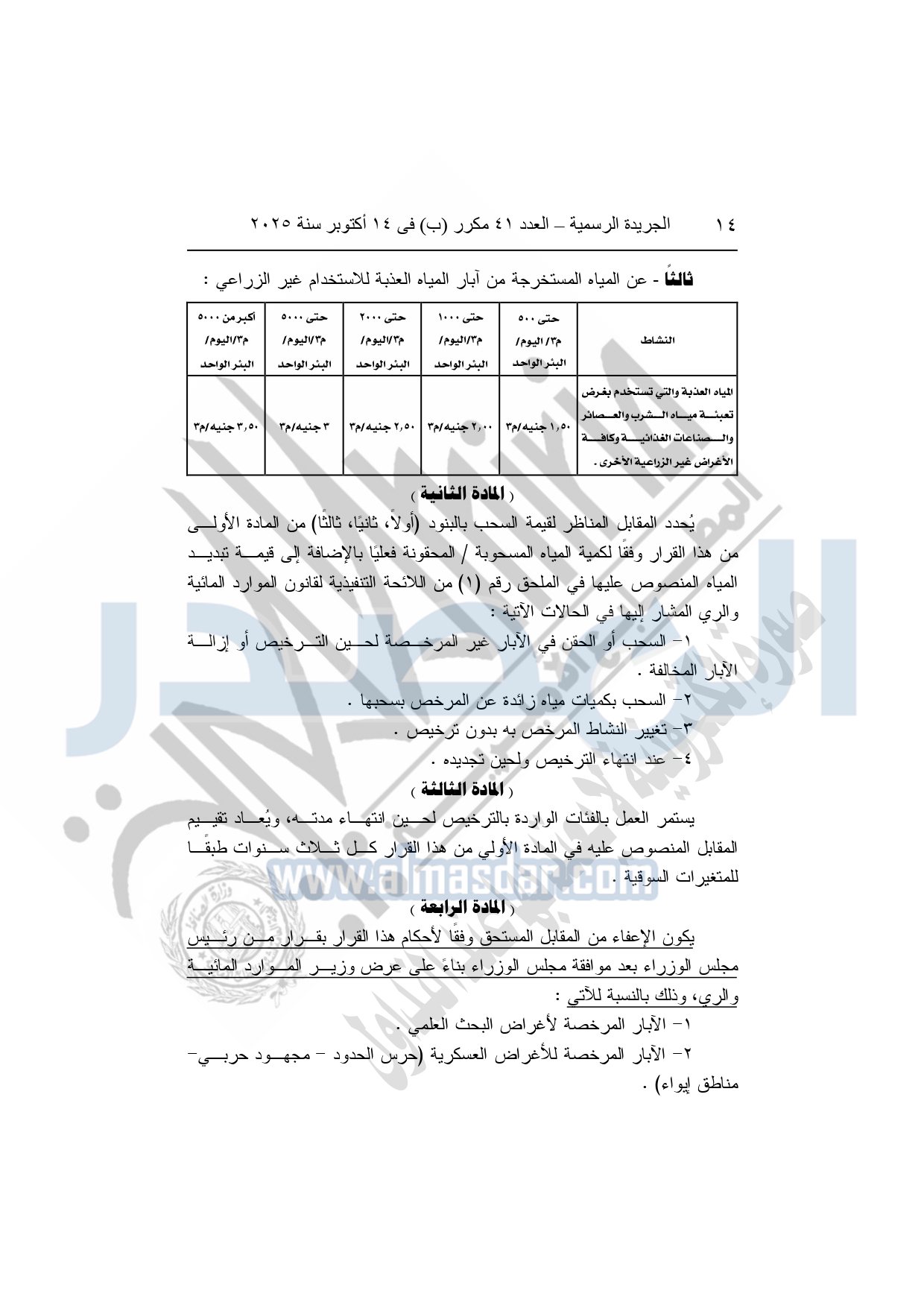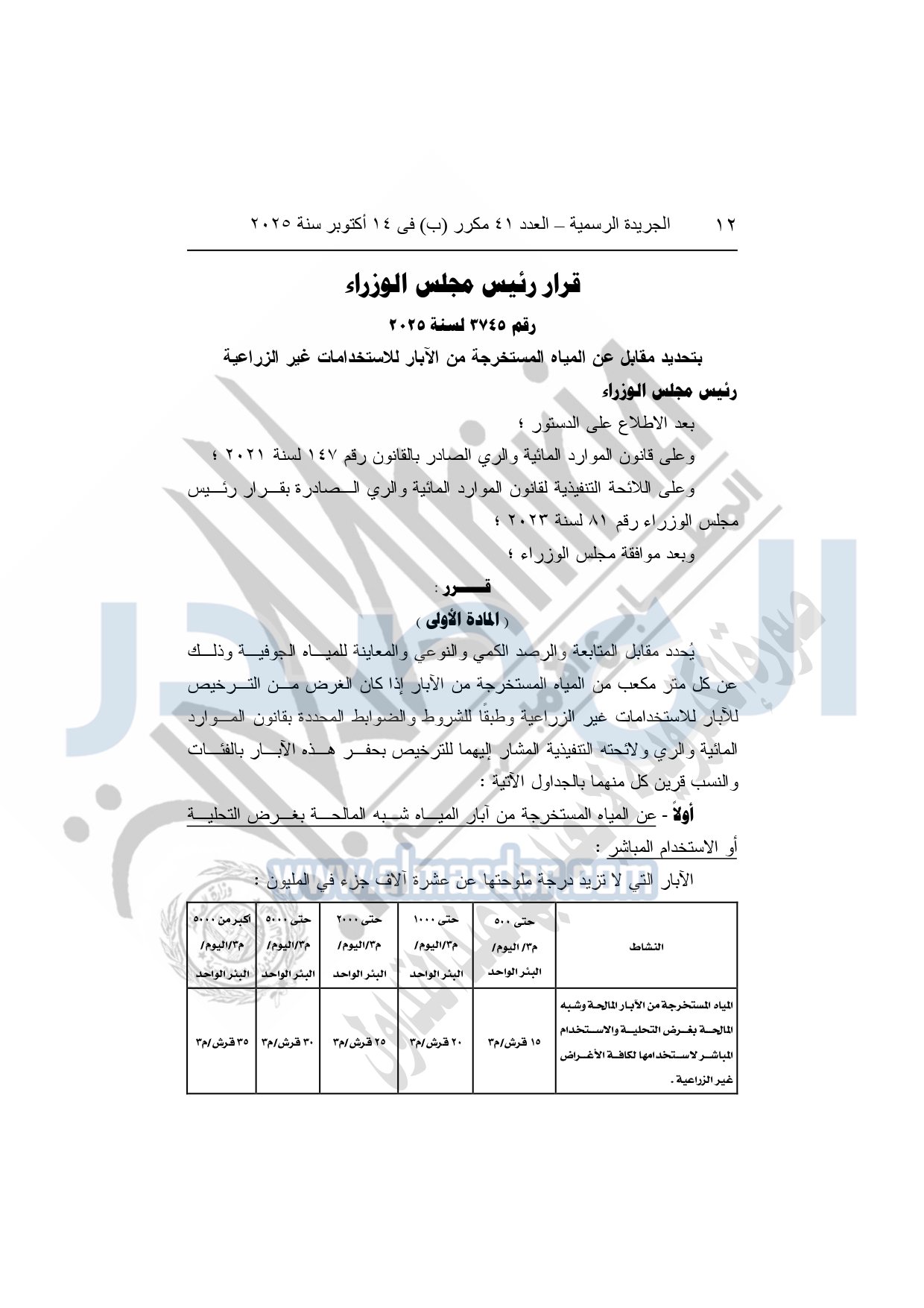 نشرت الجريدة الرسمية في العدد 41 مكرر "ب"، الصادر بتاريخ 14 أكتوبر 2025، قرار رئيس مجلس الوزراء، رقم 3745 لسنة 2025، بشأن تحديد مقابل عن المياه المستخرجة من الآبار للاستخدامات غير الزراعية.