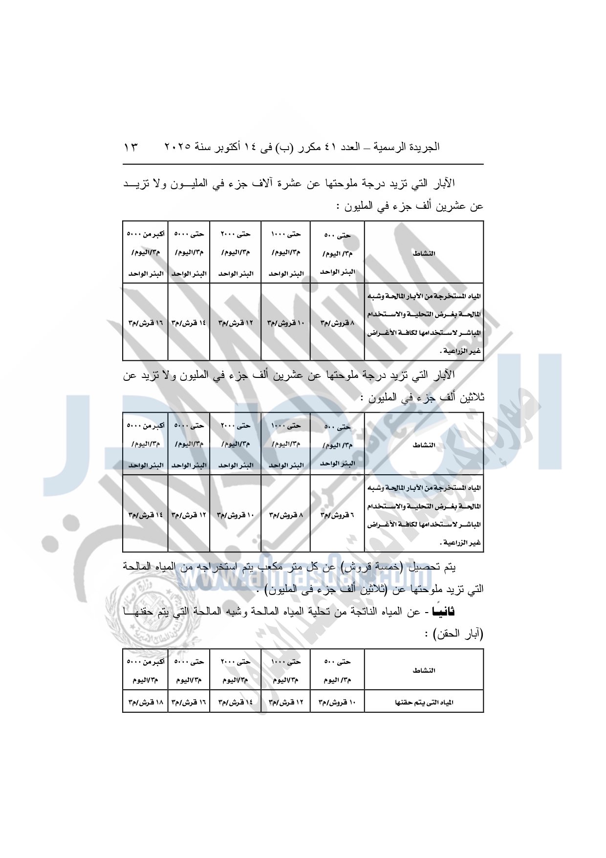 يُحدد مقابل المتابعة والرصد الكمي والنوعي والمعاينة للمياه الجوفية وذلك عن كل متر مكعب من المياه المستخرجة من الآبار إذا كان الغرض من الترخيص للآبار للاستخدامات غير الزراعية وطبقا للشروط والضوابط المحددة بقانون الموارد المائية والري ولائحته التنفيذية المشار إليهما للترخيص بحفر هذه الآبار بالفئات والنسب قرين كل منهما بالجداول الآتية: