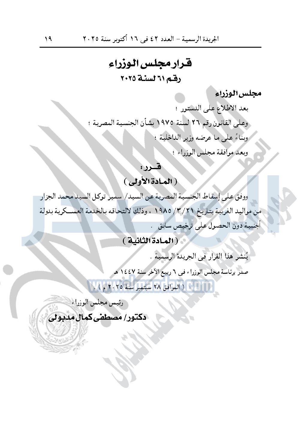 نشرت الجريدة الرسمية في العدد 42، بتاريخ 16 أكتوبر 2025، قرار مجلس الوزراء، رقم 61 لسنة 2025، بشأن الموافقة على إسقاط الجنسية المصرية عن سمير توكل السيد محمد الجزار.