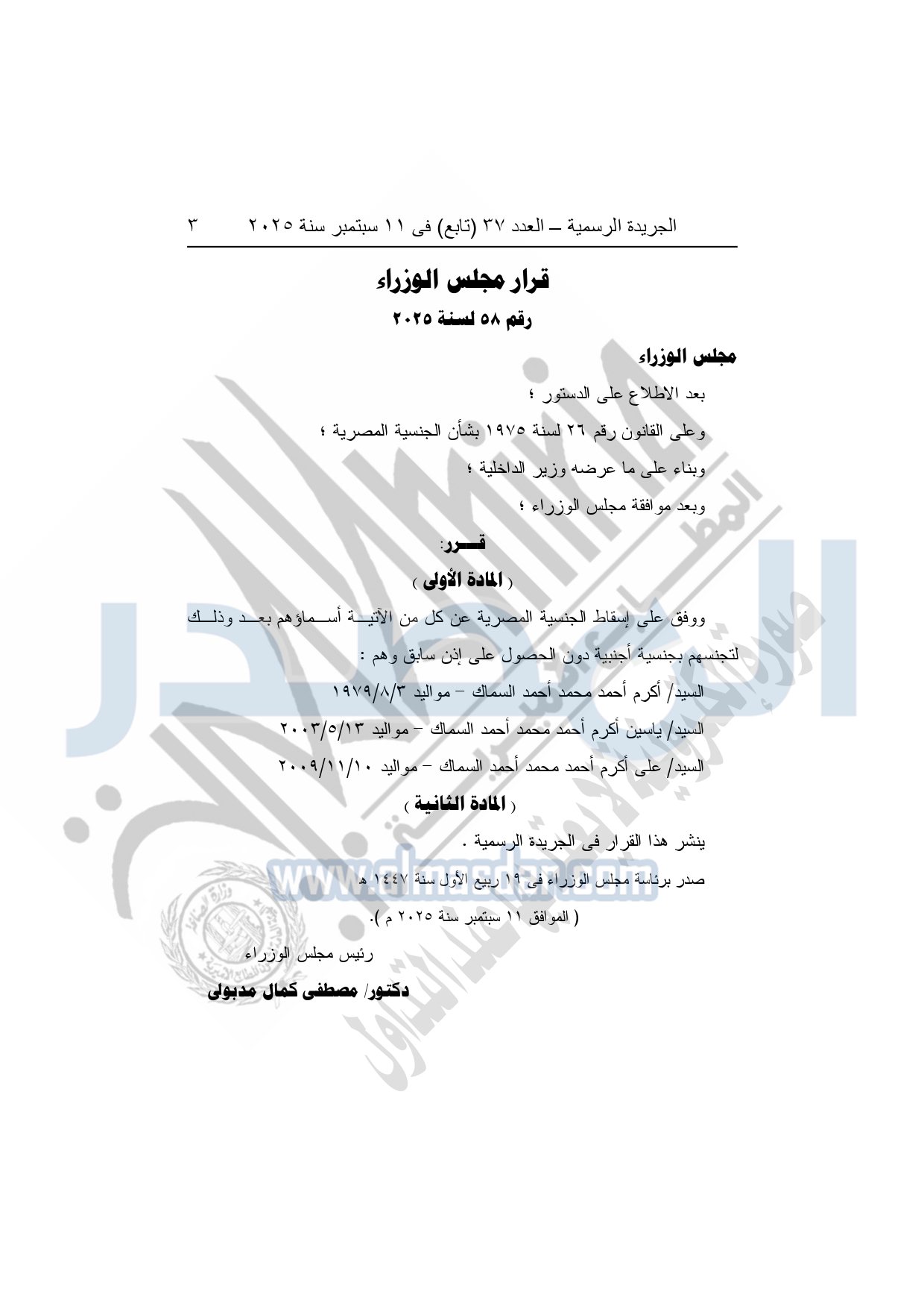 كما نشرت الجريدة الرسمية في العدد 37 "تابع"، بتاريخ 11 سبتمبر2025، قرار مجلس الوزراء، رقم 58 لسنة 2025، بشأن الموافقة على إسقاط لـ3 أشخاص.