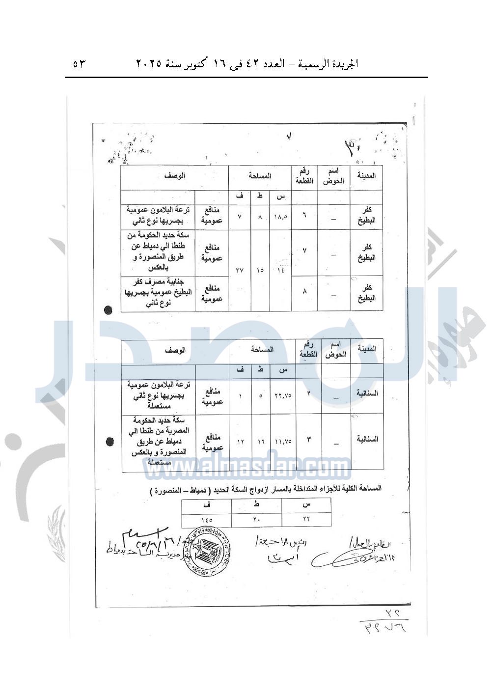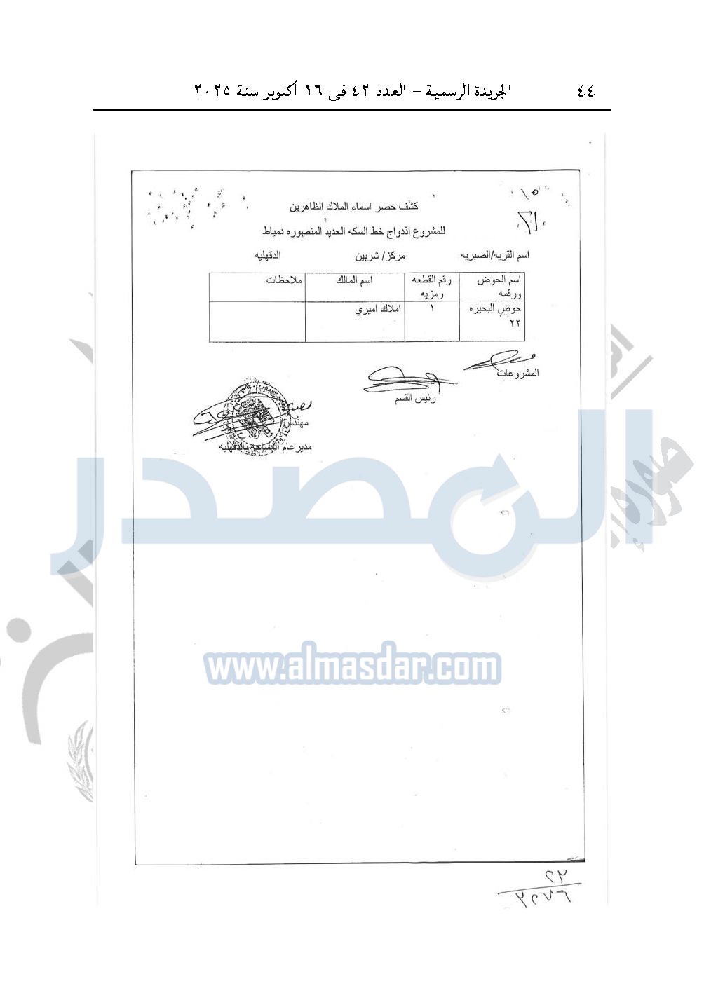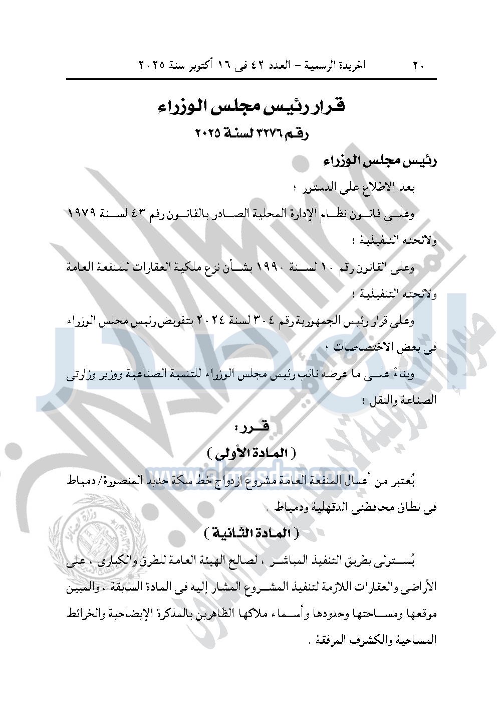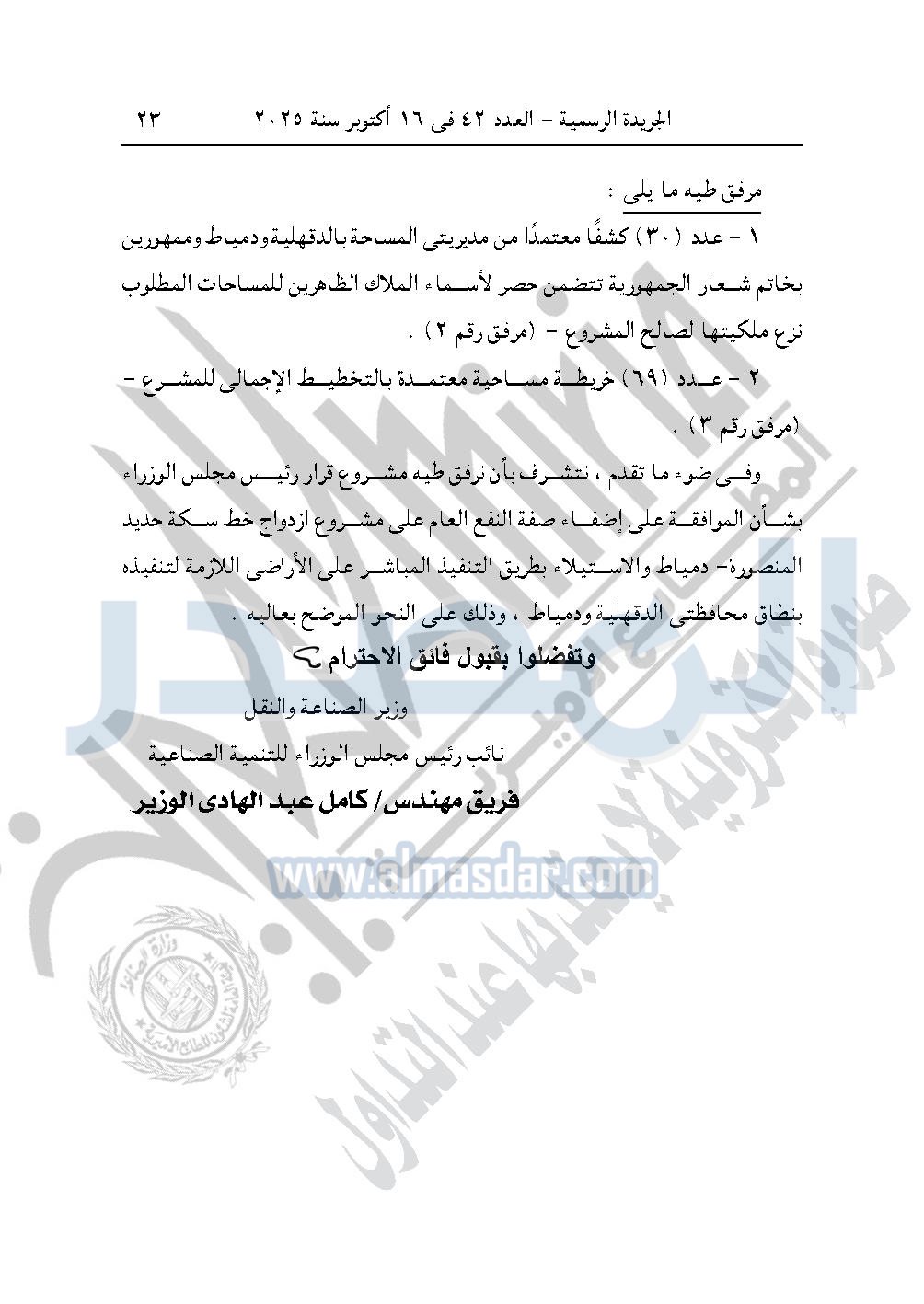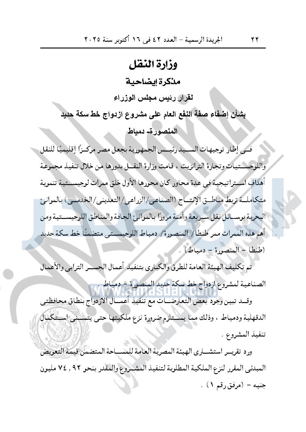 نشرت الجريدة الرسمية في العدد 42، بتاريخ 16 أكتوبر 2025، قرار رئيس مجلس الوزراء، رقم 3276 لسنة 2025، بشأن نزع ملكية قطعة أرض لإقامة مشروع إزدواج خط سكة حديد المنصورة – دمياط في نطاق محافظتى الدقهلية ودمياط.
