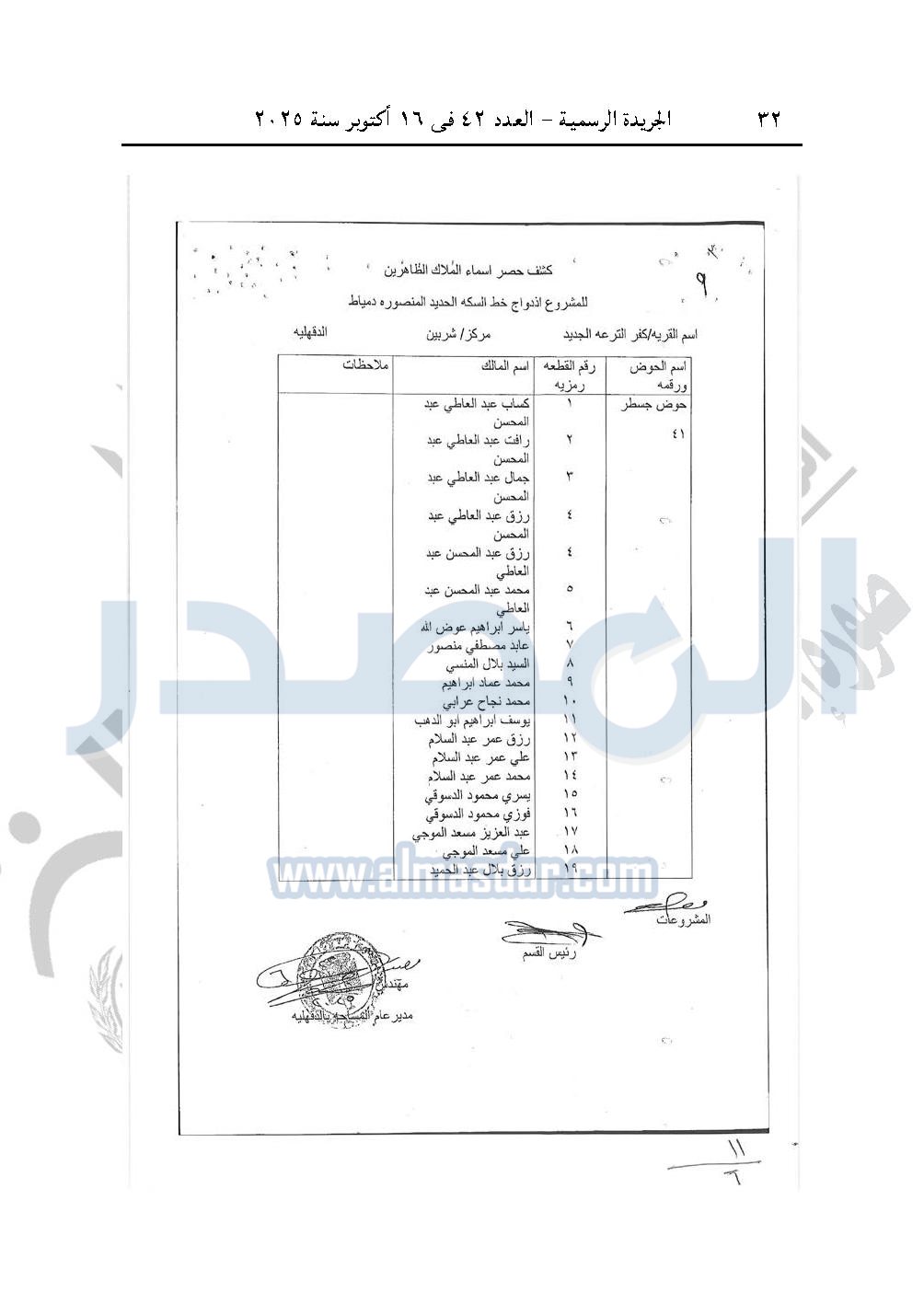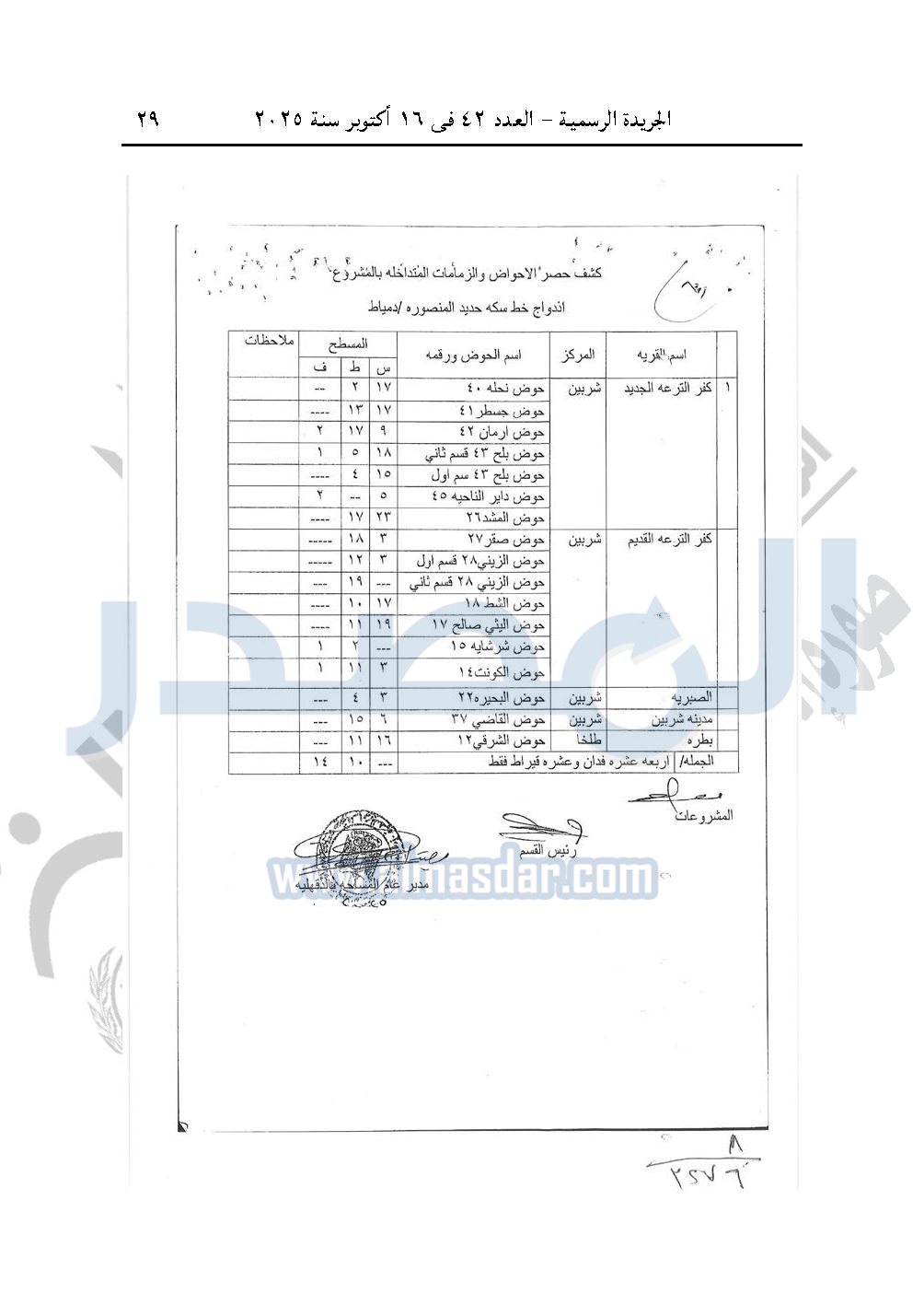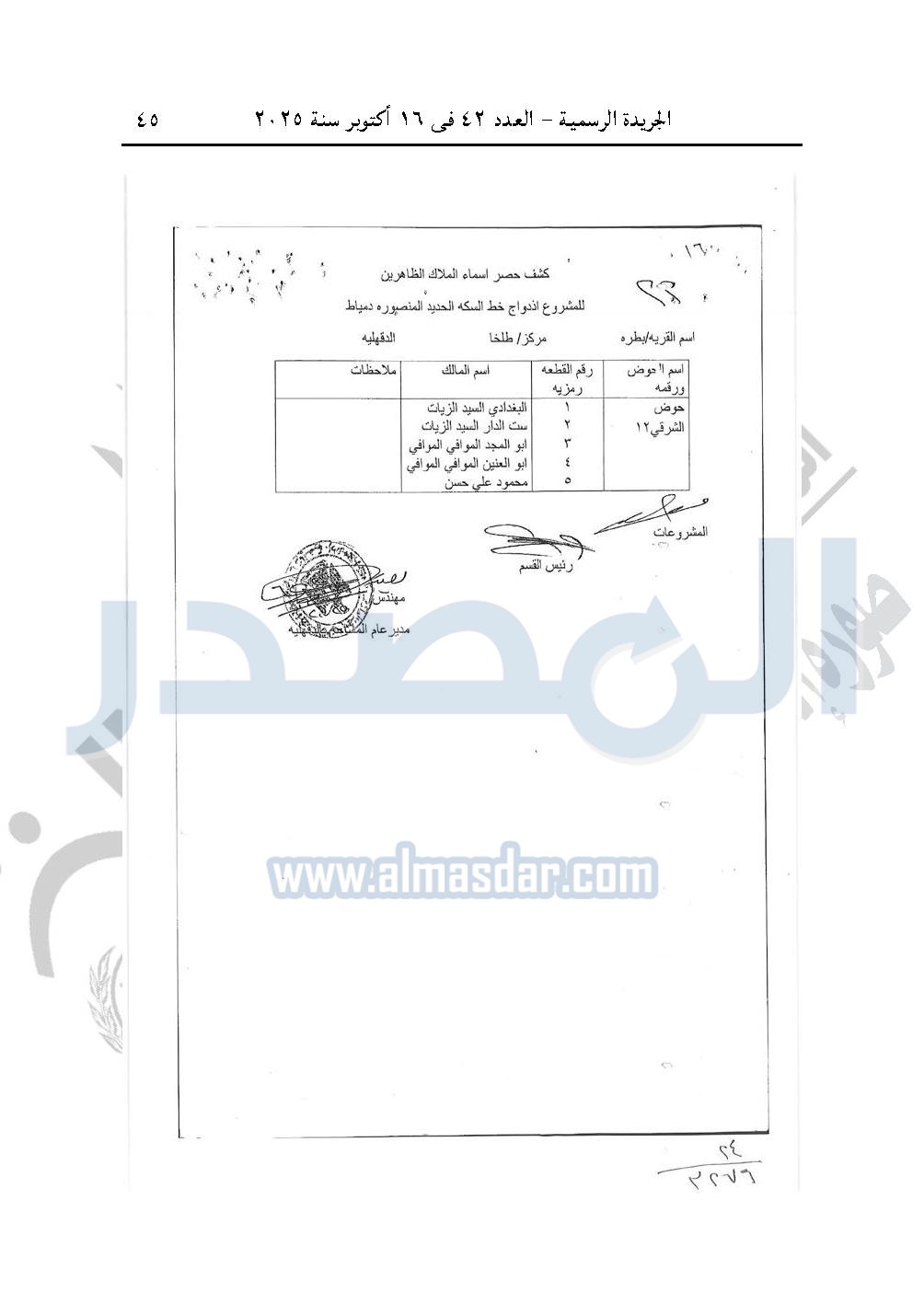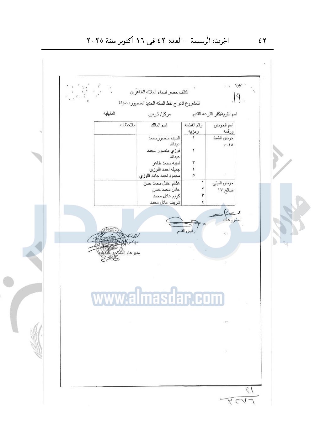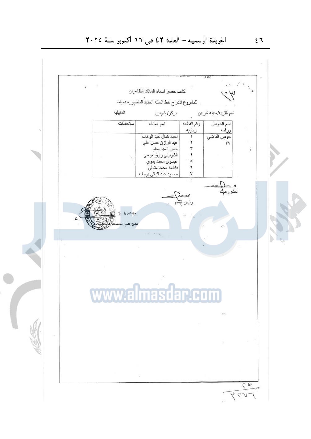نشرت الجريدة الرسمية في العدد 42، بتاريخ 16 أكتوبر 2025، قرار رئيس مجلس الوزراء، رقم 3276 لسنة 2025، بشأن نزع ملكية قطعة أرض لإقامة مشروع إزدواج خط سكة حديد المنصورة – دمياط في نطاق محافظتى الدقهلية ودمياط.