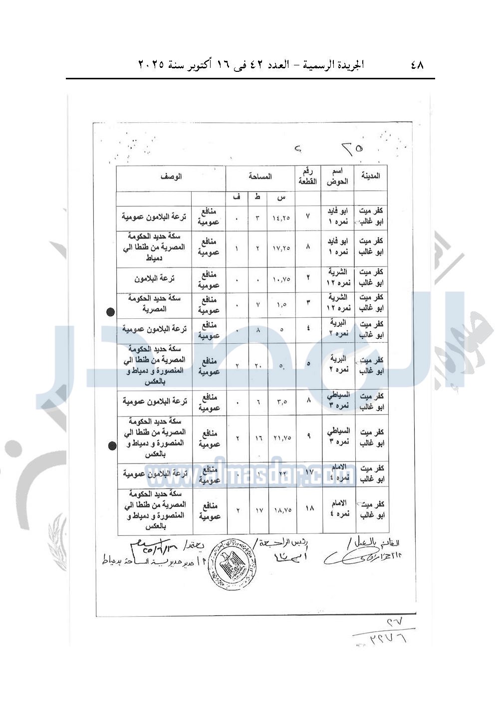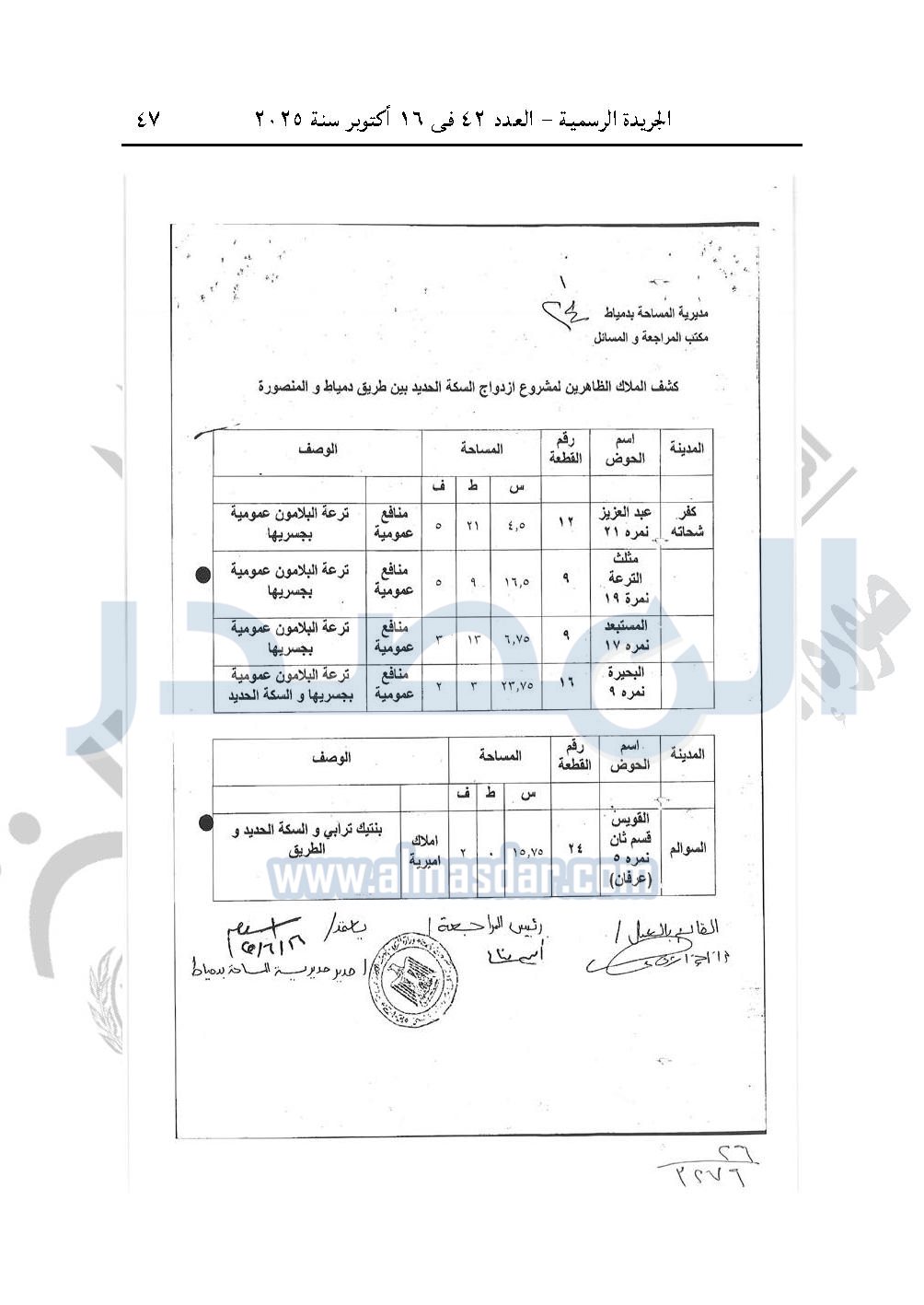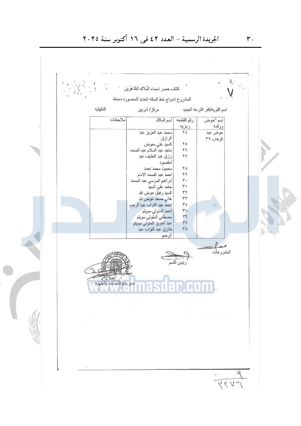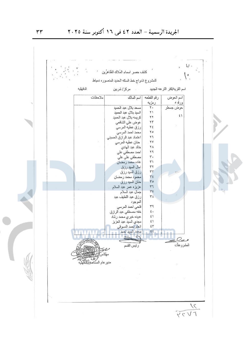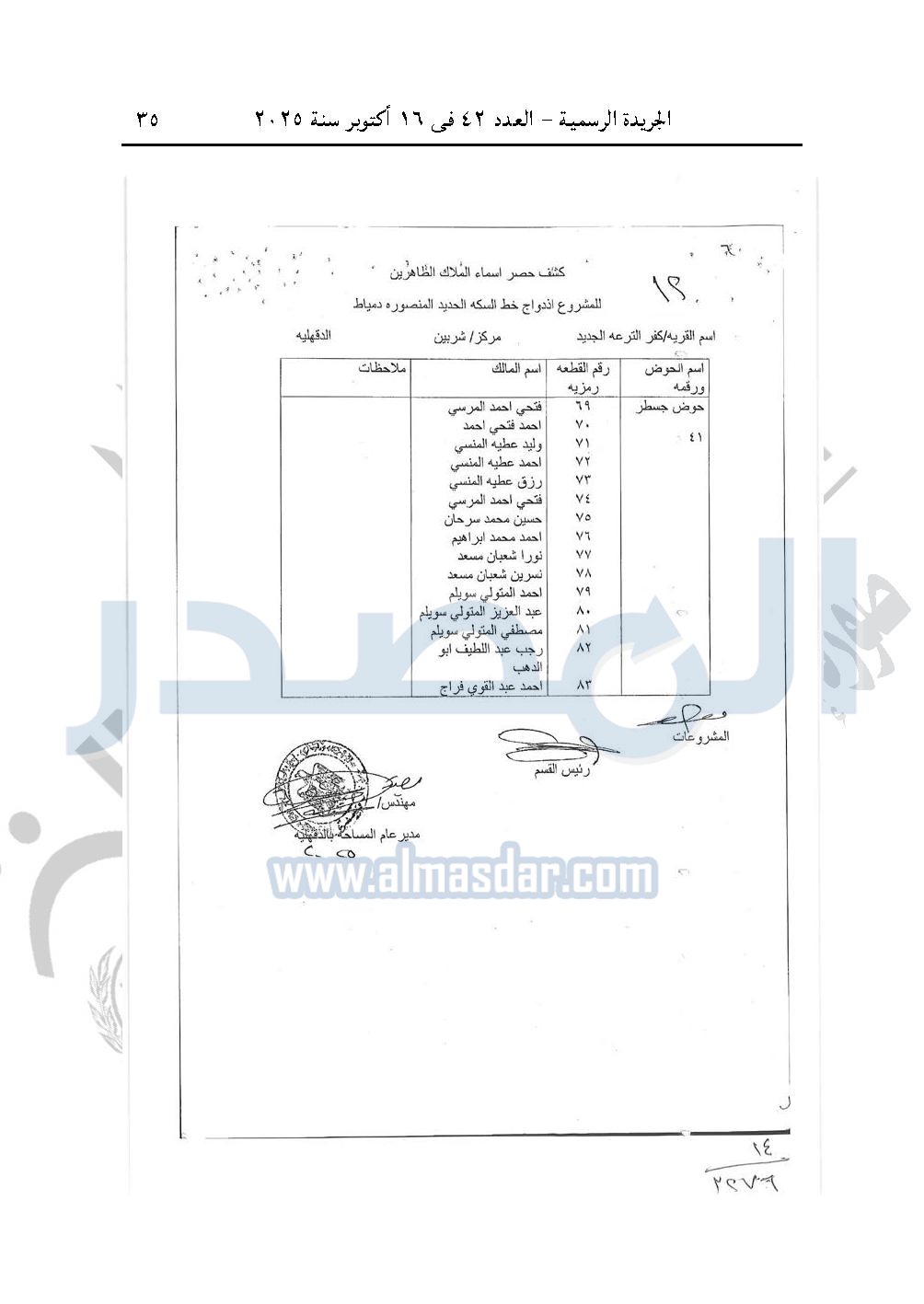 نشرت الجريدة الرسمية في العدد 42، بتاريخ 16 أكتوبر 2025، قرار رئيس مجلس الوزراء، رقم 3276 لسنة 2025، بشأن نزع ملكية قطعة أرض لإقامة مشروع إزدواج خط سكة حديد المنصورة – دمياط في نطاق محافظتى الدقهلية ودمياط.