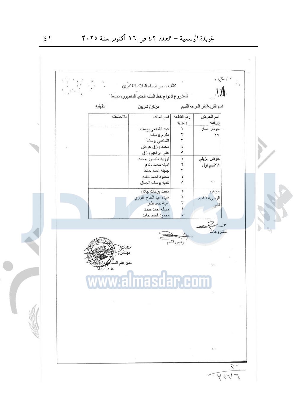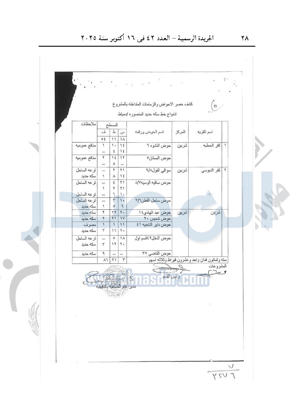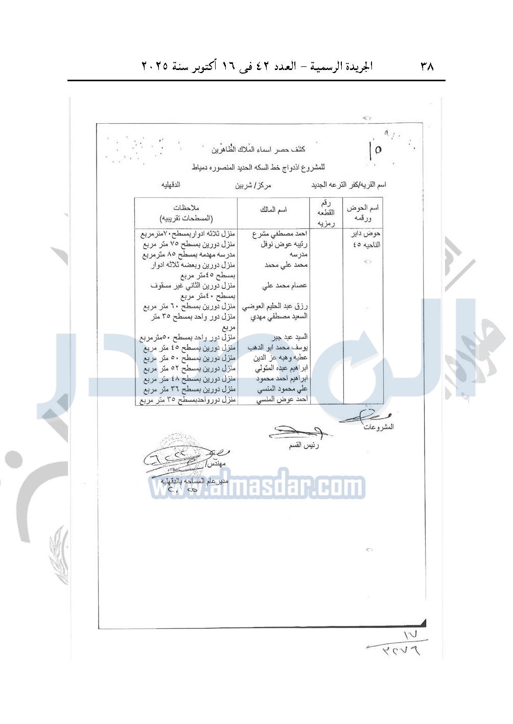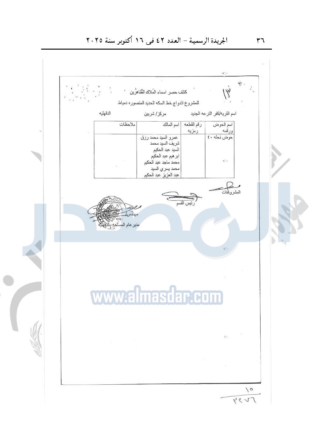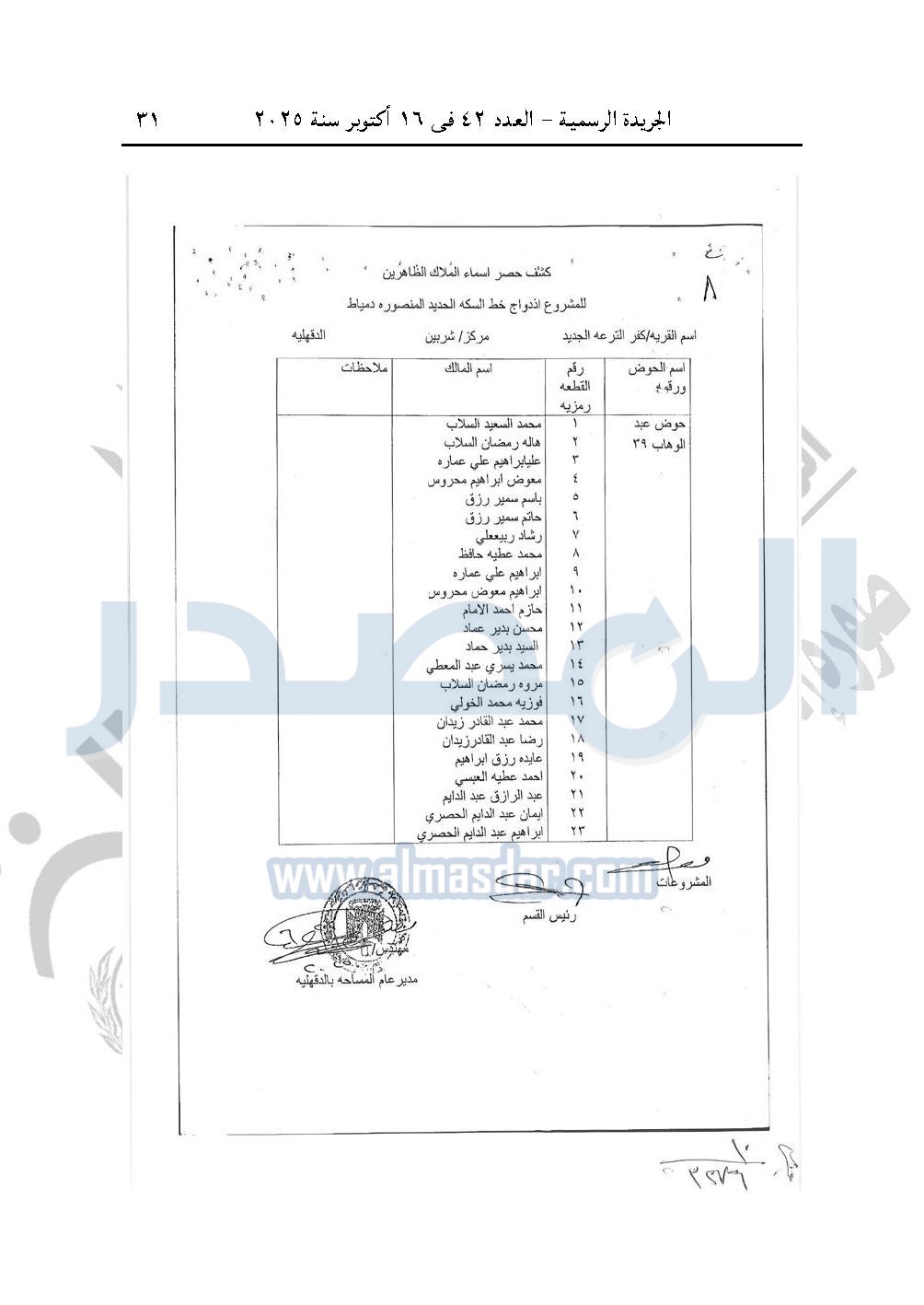 نشرت الجريدة الرسمية في العدد 42، بتاريخ 16 أكتوبر 2025، قرار رئيس مجلس الوزراء، رقم 3276 لسنة 2025، بشأن نزع ملكية قطعة أرض لإقامة مشروع إزدواج خط سكة حديد المنصورة – دمياط في نطاق محافظتى الدقهلية ودمياط.