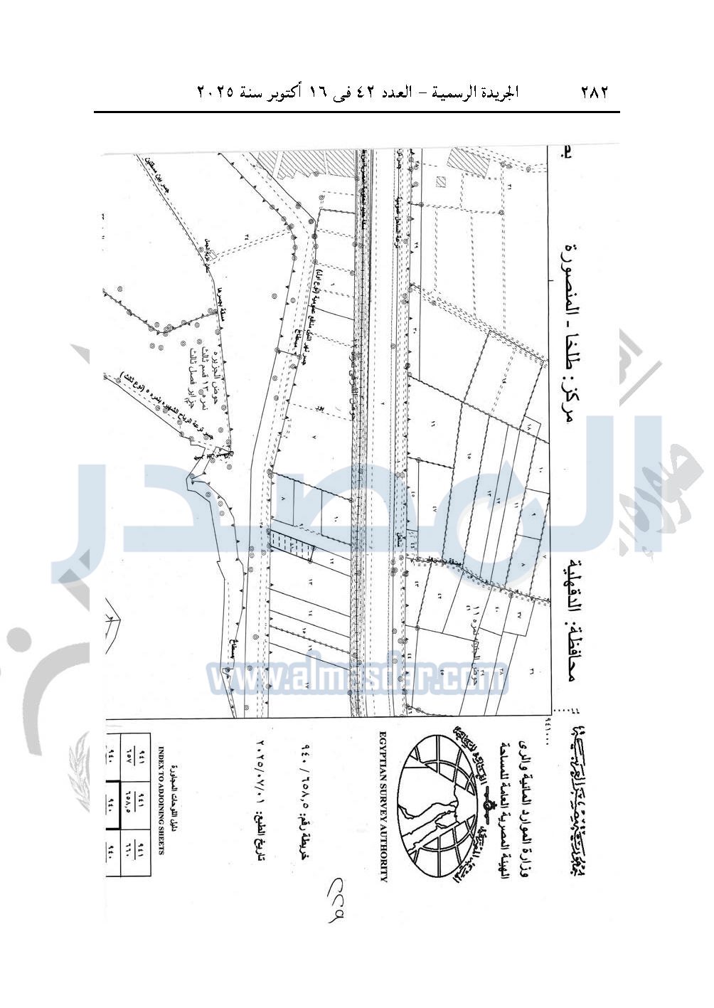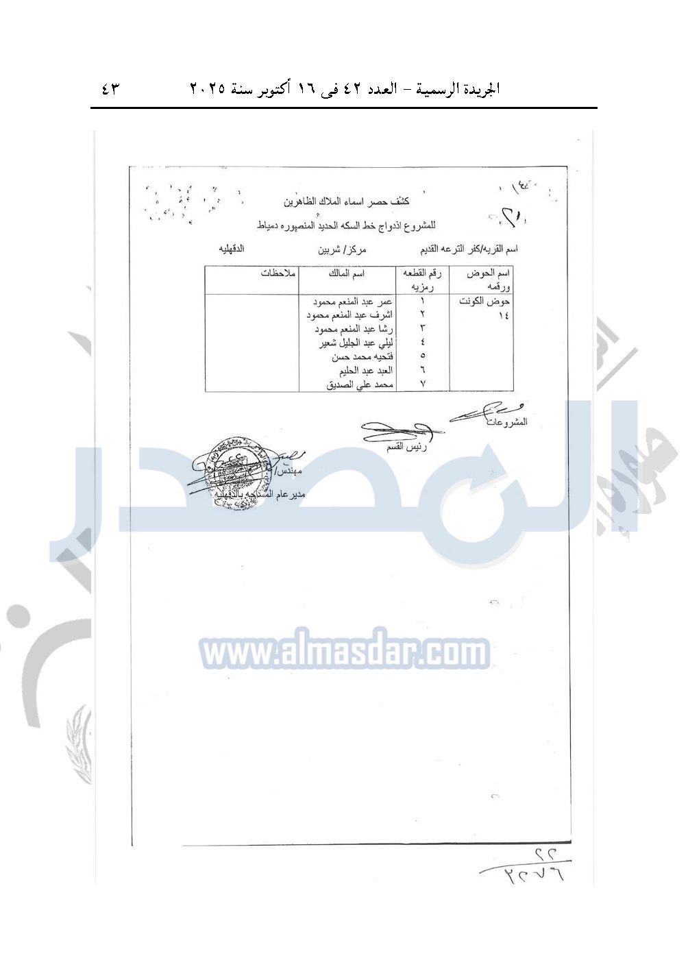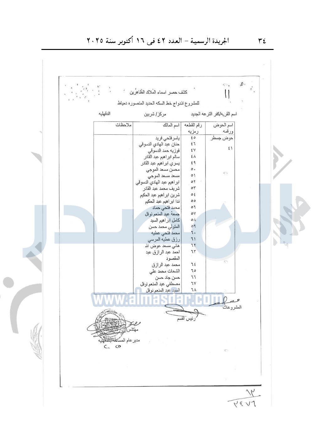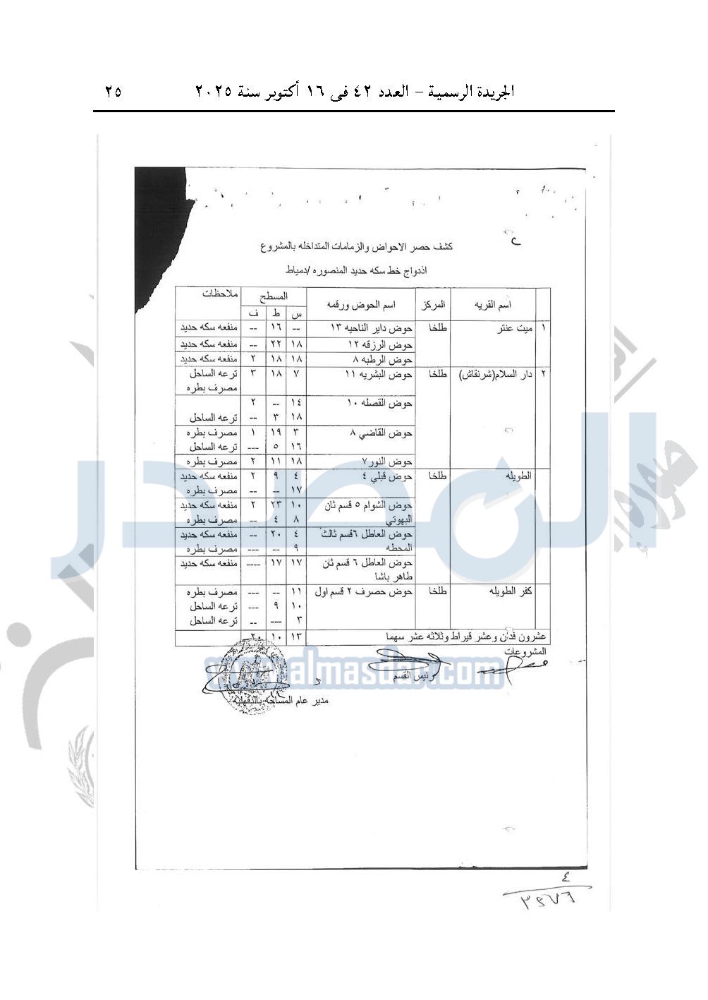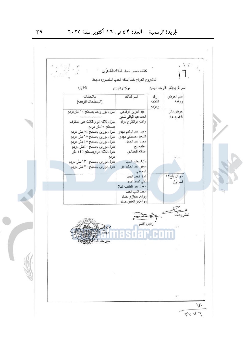 نشرت الجريدة الرسمية في العدد 42، بتاريخ 16 أكتوبر 2025، قرار رئيس مجلس الوزراء، رقم 3276 لسنة 2025، بشأن نزع ملكية قطعة أرض لإقامة مشروع إزدواج خط سكة حديد المنصورة – دمياط في نطاق محافظتى الدقهلية ودمياط.