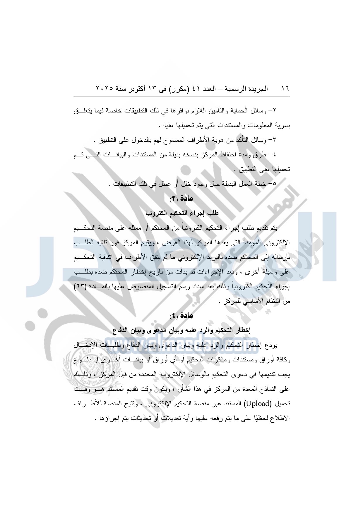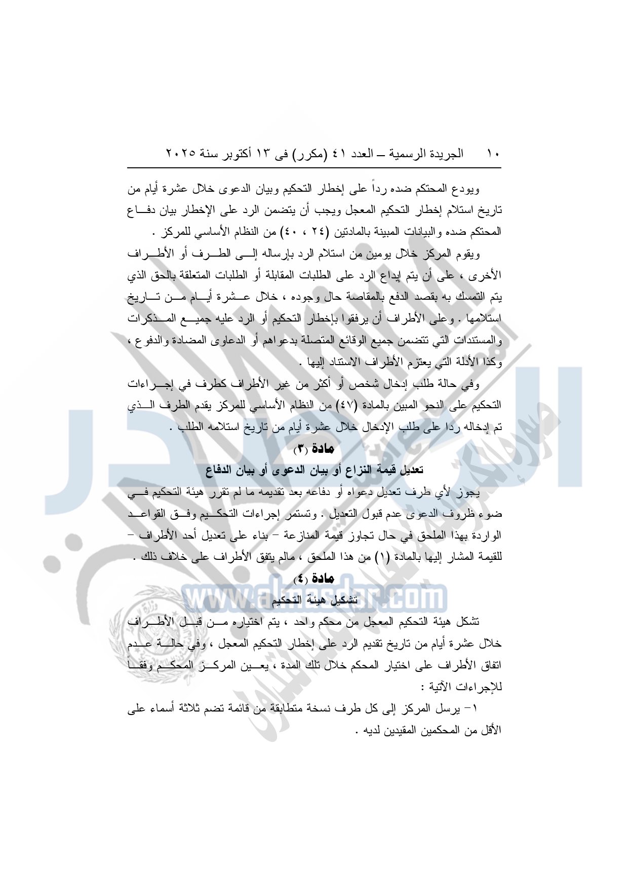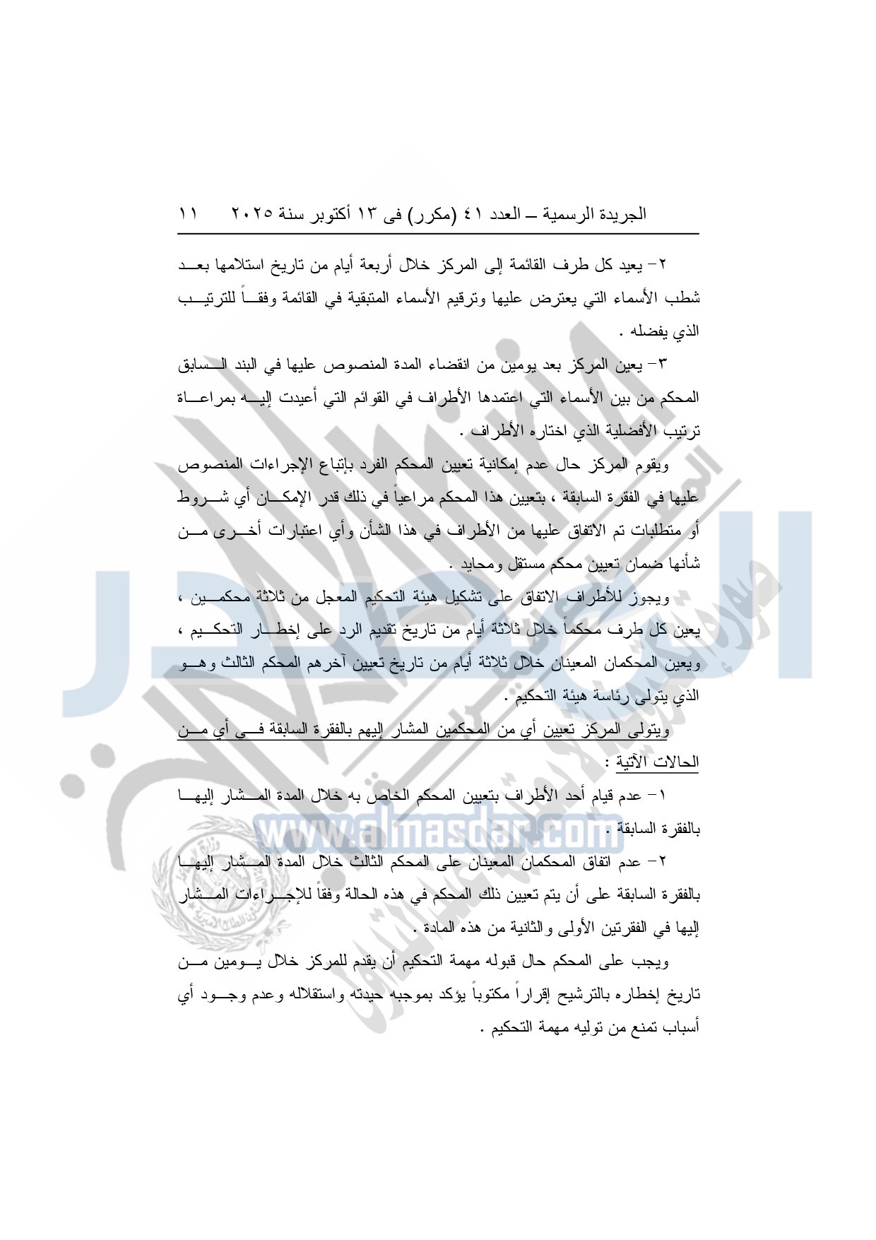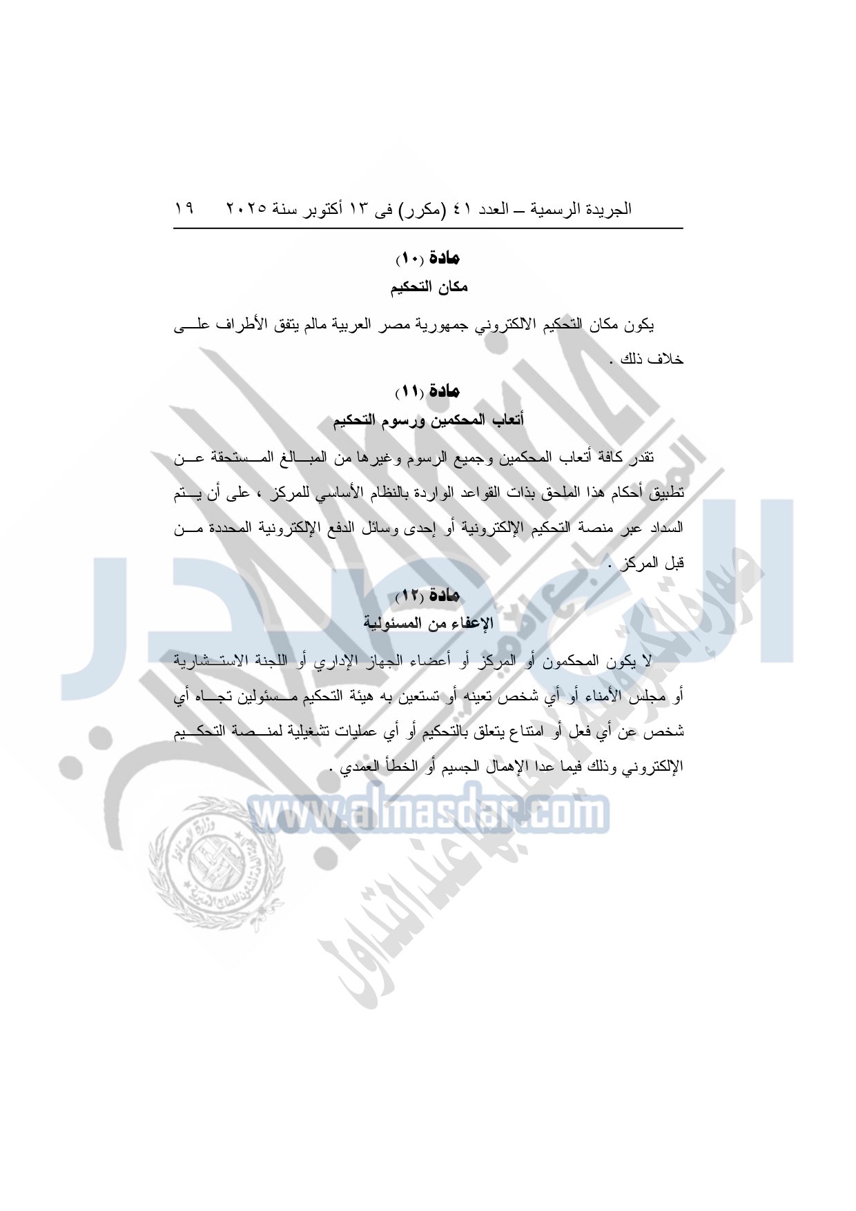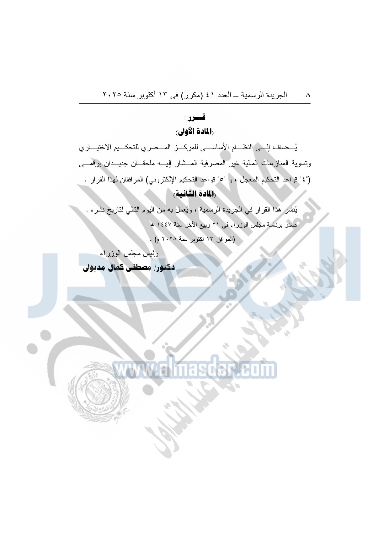 نشرت الجريدة الرسمية في العدد 41 "مكرر"، بتاريخ 13 أكتوبر 2025، قرار رئيس مجلس الوزراء، رقم 3723 لسنة 2025، بشأن تعديل النظام الأساسي للمركز المصري للتحكيم الاختياري وتسوية المنازعات المالية غير المصرفية وقواعد وإجراءات تنظيم العمل به.