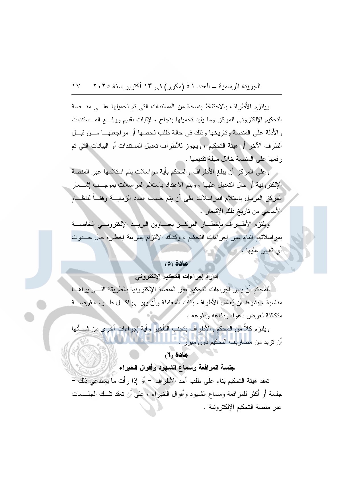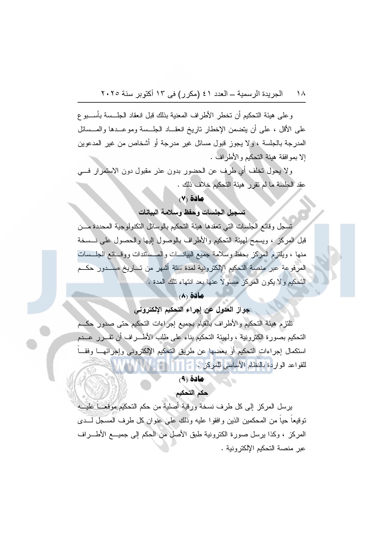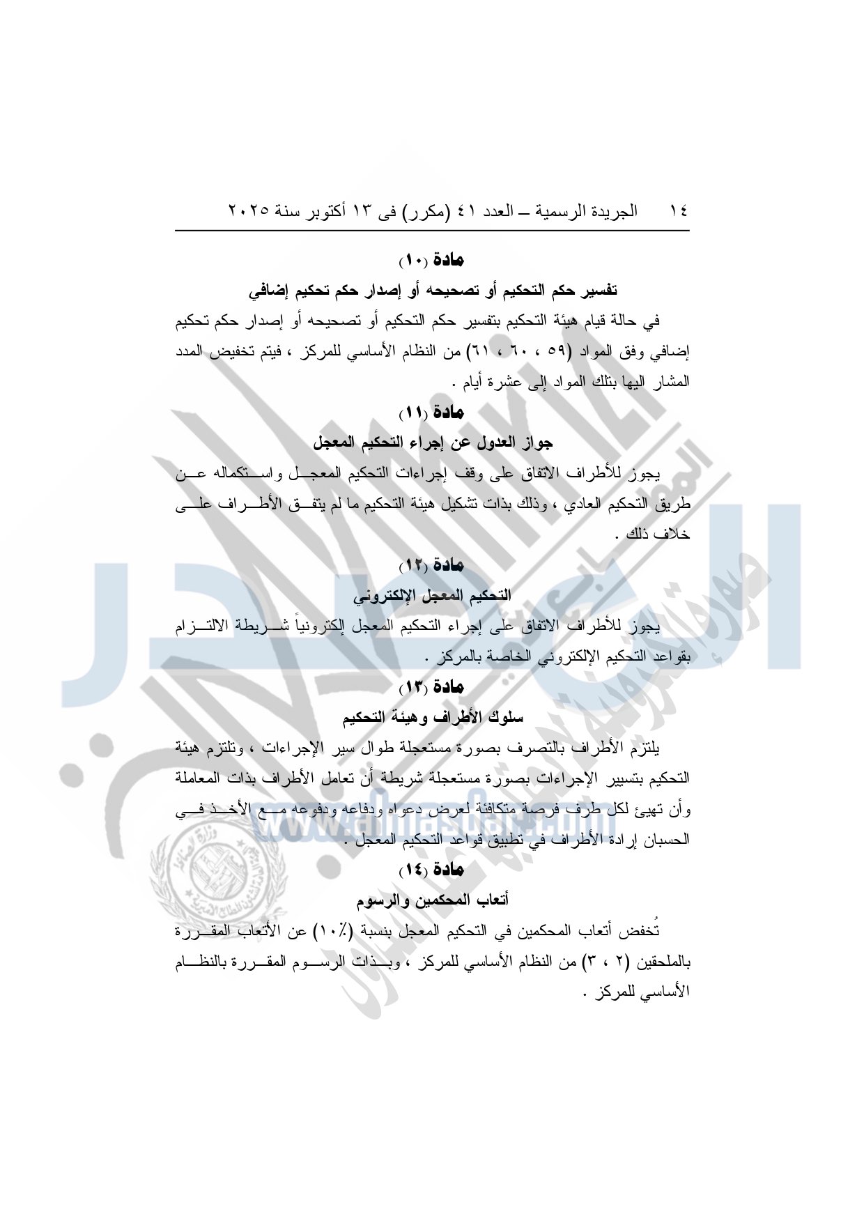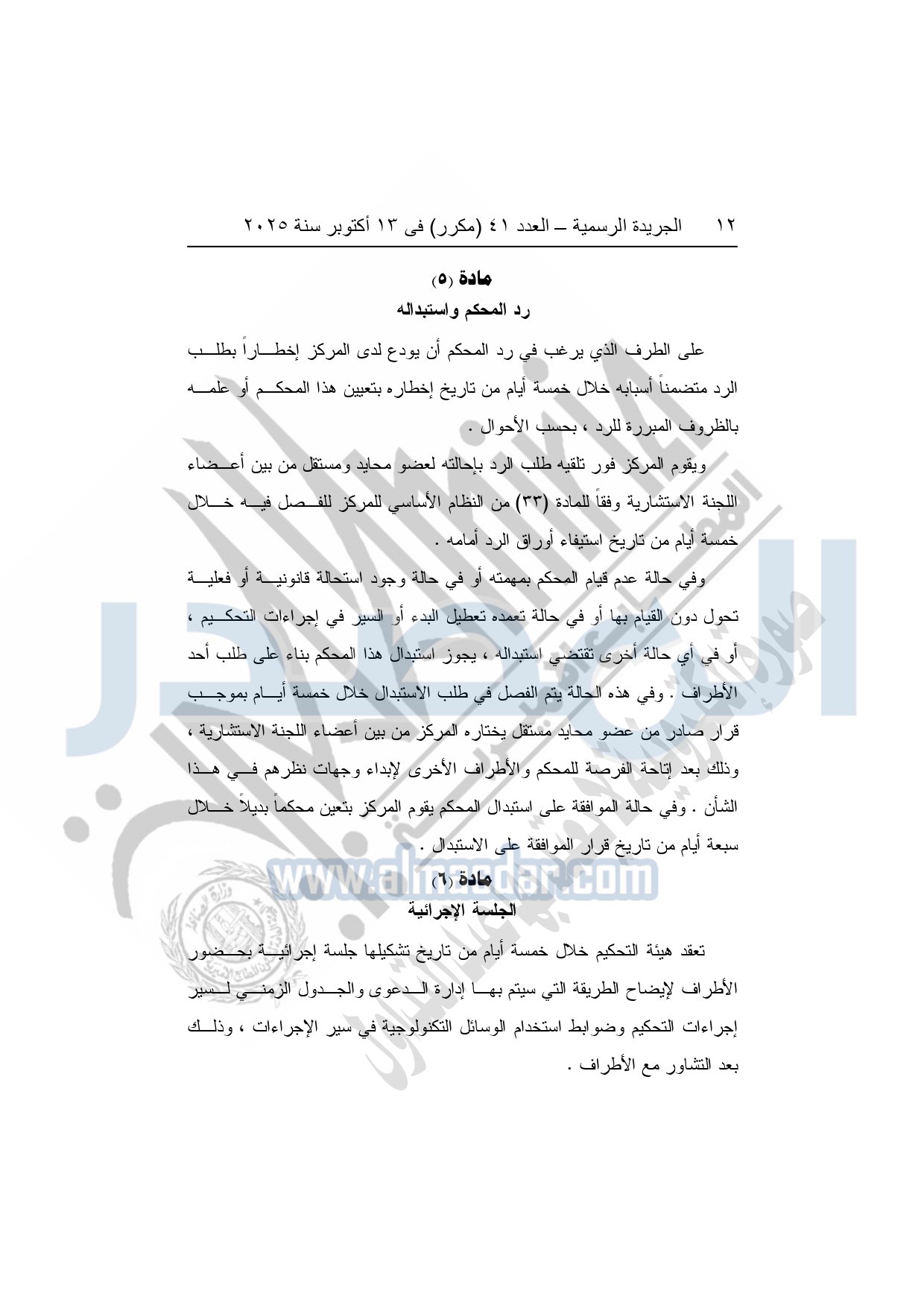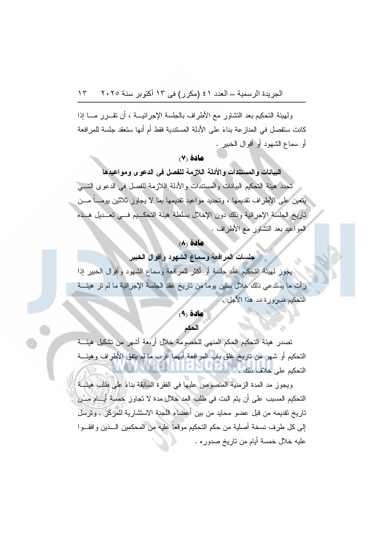 نشرت الجريدة الرسمية في العدد 41 "مكرر"، بتاريخ 13 أكتوبر 2025، قرار رئيس مجلس الوزراء، رقم 3723 لسنة 2025، بشأن تعديل النظام الأساسي للمركز المصري للتحكيم الاختياري وتسوية المنازعات المالية غير المصرفية وقواعد وإجراءات تنظيم العمل به.
