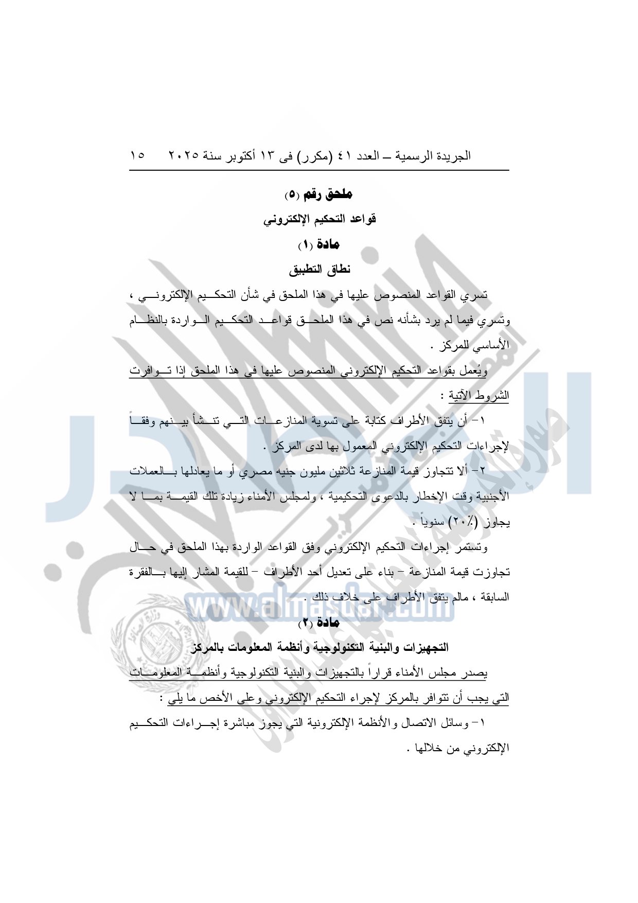 يُضاف إلى النظام الأساسي للمركز المصري للتحكیم الاختياري وتسوية المنازعات المالية غير المصرفية المشار إليه ملحقـان جديدان برقمي «"4" قواعد التحكيم المعجل، و"5" قواعد التحكيم الإلكتروني» المرافقان لهذا القرار.