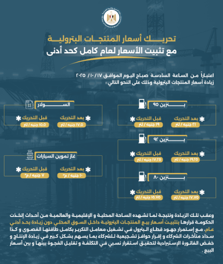 ونوهت، إلى أنه اعتباراً من الساعة السادسة صباح اليوم الموافق 17-10-2025 تم زيادة أسعار المنتجات البترولية وذلك على النحو التالي: