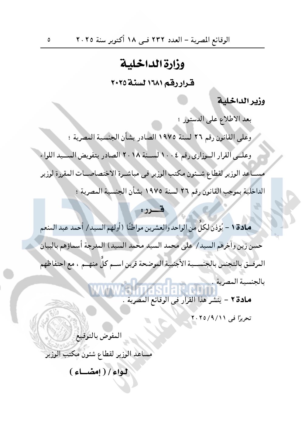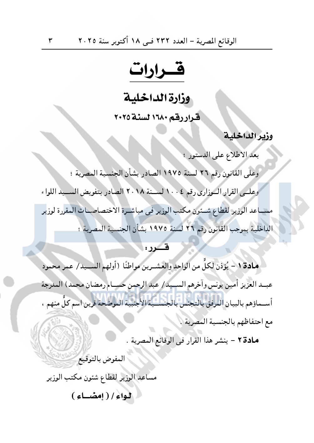 نشرت الوقائع المصرية في العدد 232 الصادر في 18 أكتوبر سنة 2025، قرار وزارة الداخلية، رقم 1680 لسنة 2025، بشأن الإذن للواحد والعشرين مواطن بالحصول على الجنسية الأجنبية مع احتفاظهم بالجنسية المصرية.