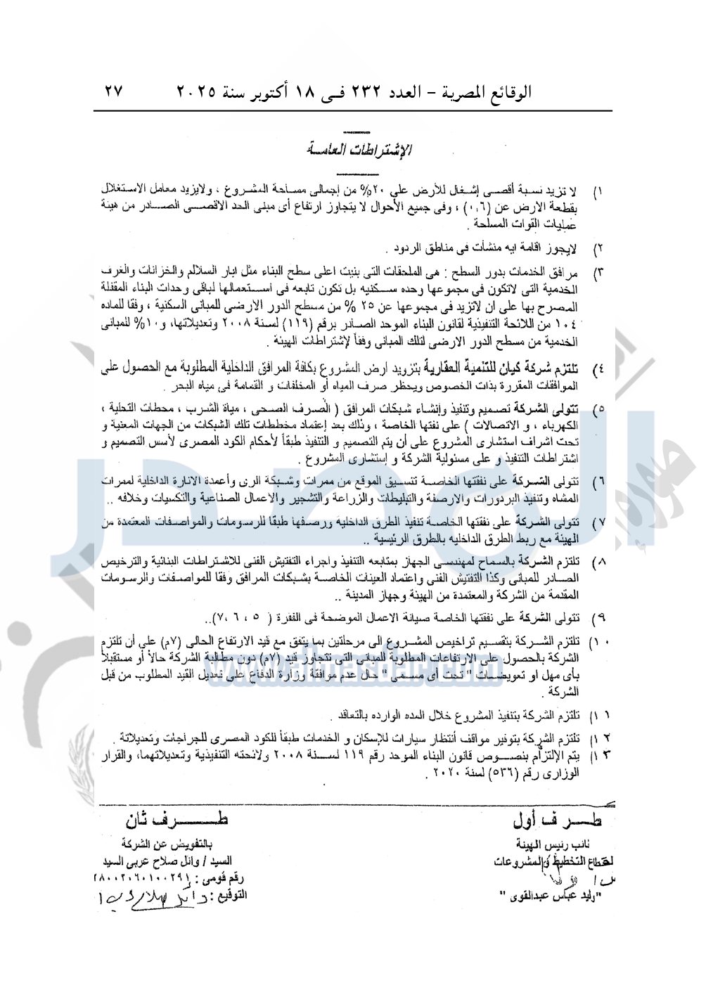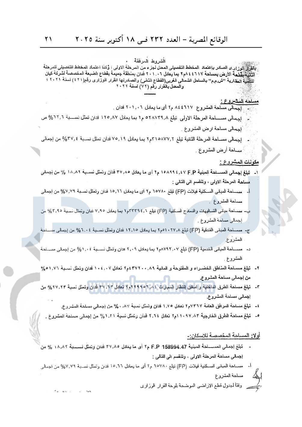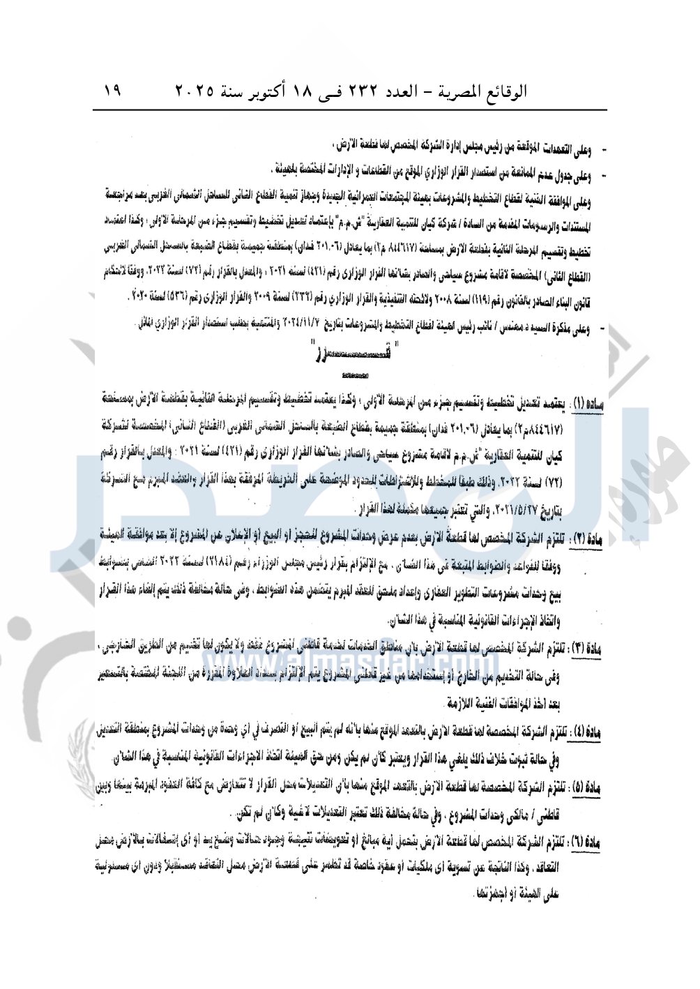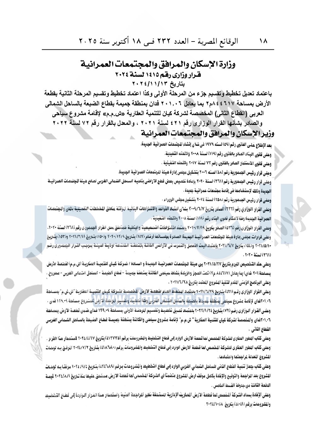 نشرت الوقائع المصرية في العدد 232 الصادر في 18 أكتوبر سنة 2025، قرار وزارة الإسكان والمرافق والمجتمعات العمرانية، رقم 1415 لسنة 2024، بتاريخ 13-11-2024، بشأن اعتماد تعديل تخطيط وتقسيم قطعة أرض بالساحل الشمالي الغربي لشركة كيان للتنمية العقارية لإقامة مشروع سياحي.