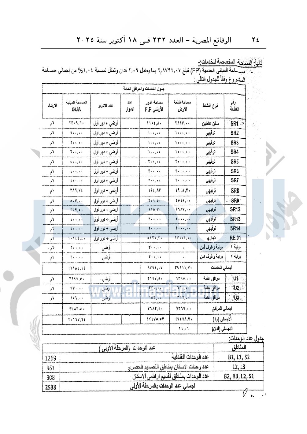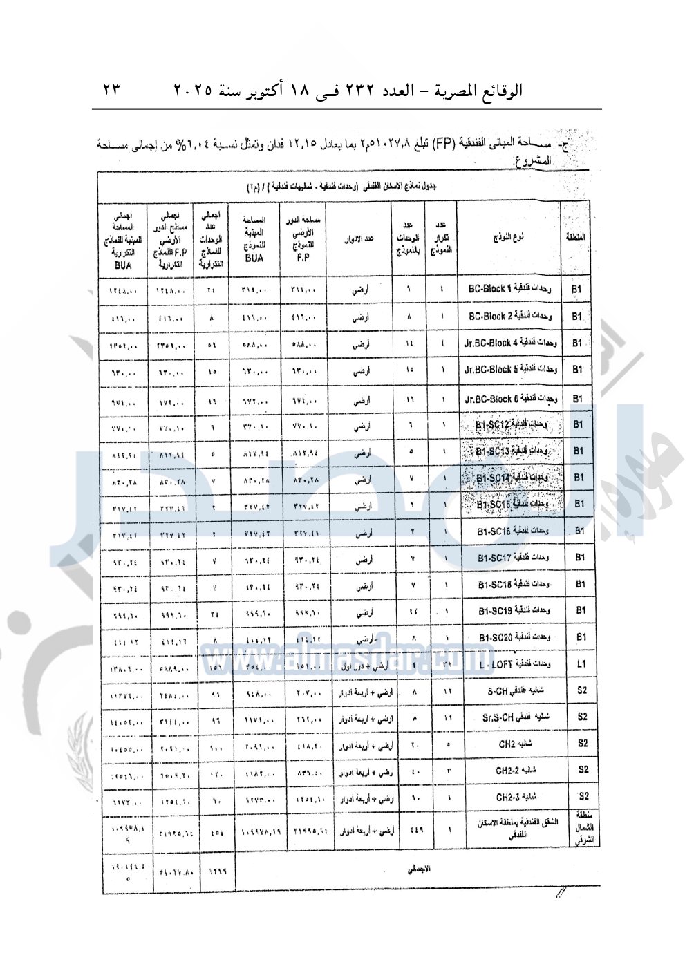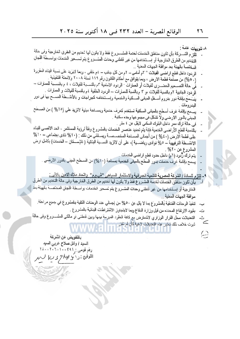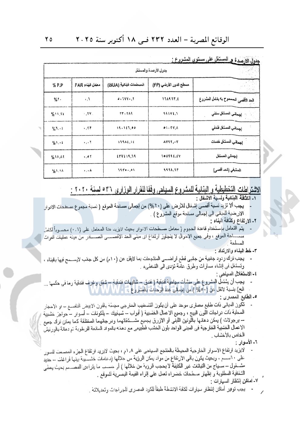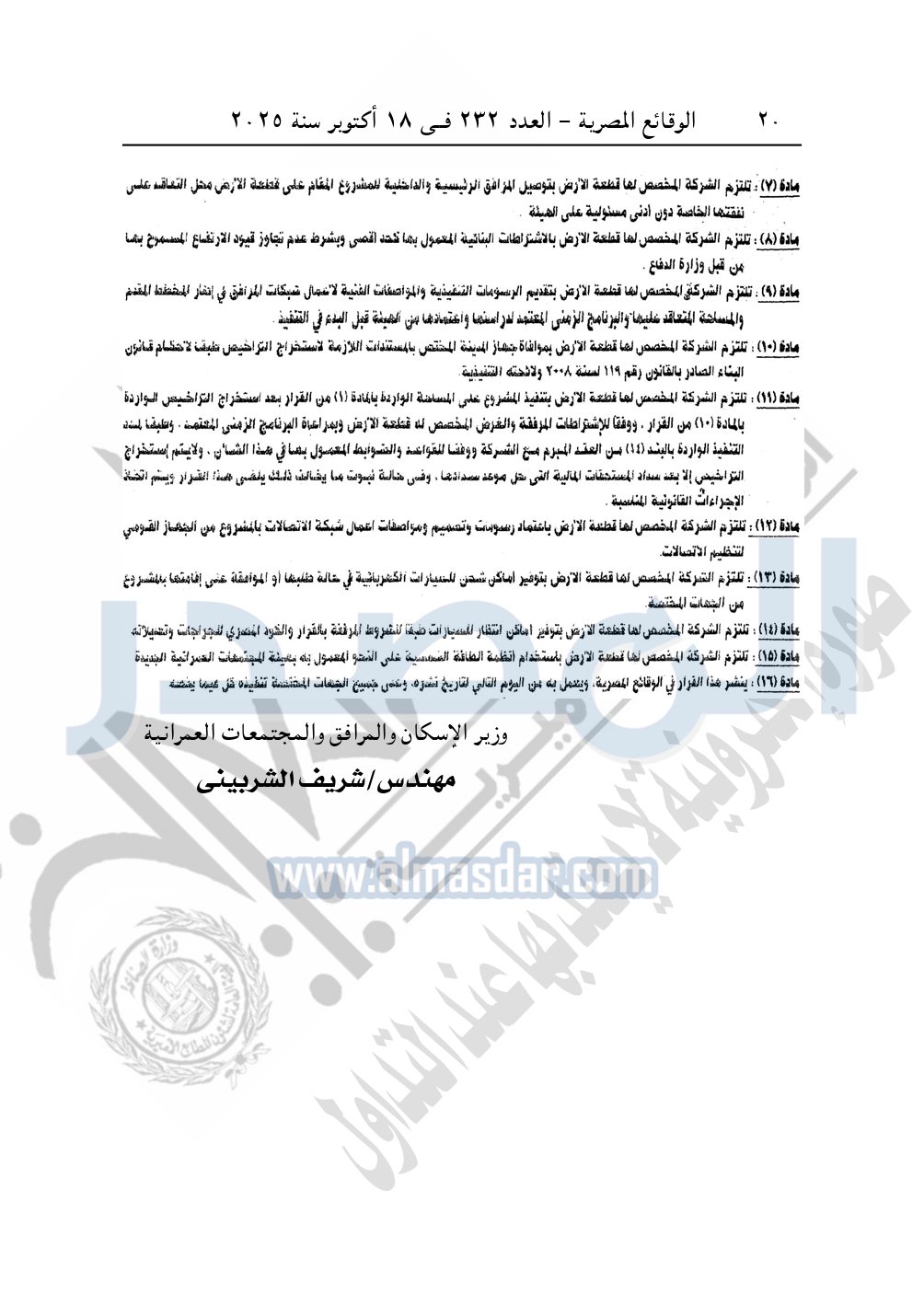 نشرت الوقائع المصرية في العدد 232 الصادر في 18 أكتوبر سنة 2025، قرار وزارة الإسكان والمرافق والمجتمعات العمرانية، رقم 1415 لسنة 2024، بتاريخ 13-11-2024، بشأن اعتماد تعديل تخطيط وتقسيم قطعة أرض بالساحل الشمالي الغربي لشركة كيان للتنمية العقارية لإقامة مشروع سياحي.