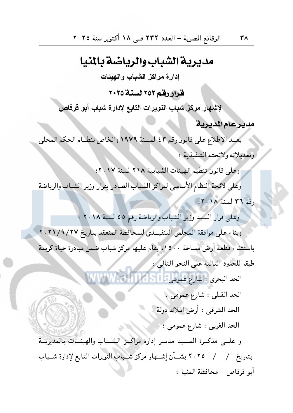 نشرت الوقائع المصرية في العدد 232، الصادر بتاريخ 18 أكتوبر 2025، قرار مديرية الشباب والرياضة بالمنيا، إدارة مراكز الشباب والهيئات، قرار رقم 252 لسنة 2025، بشأن إشهار مركز شباب النويرات التابع لإدارة شباب أبو قرقاص.