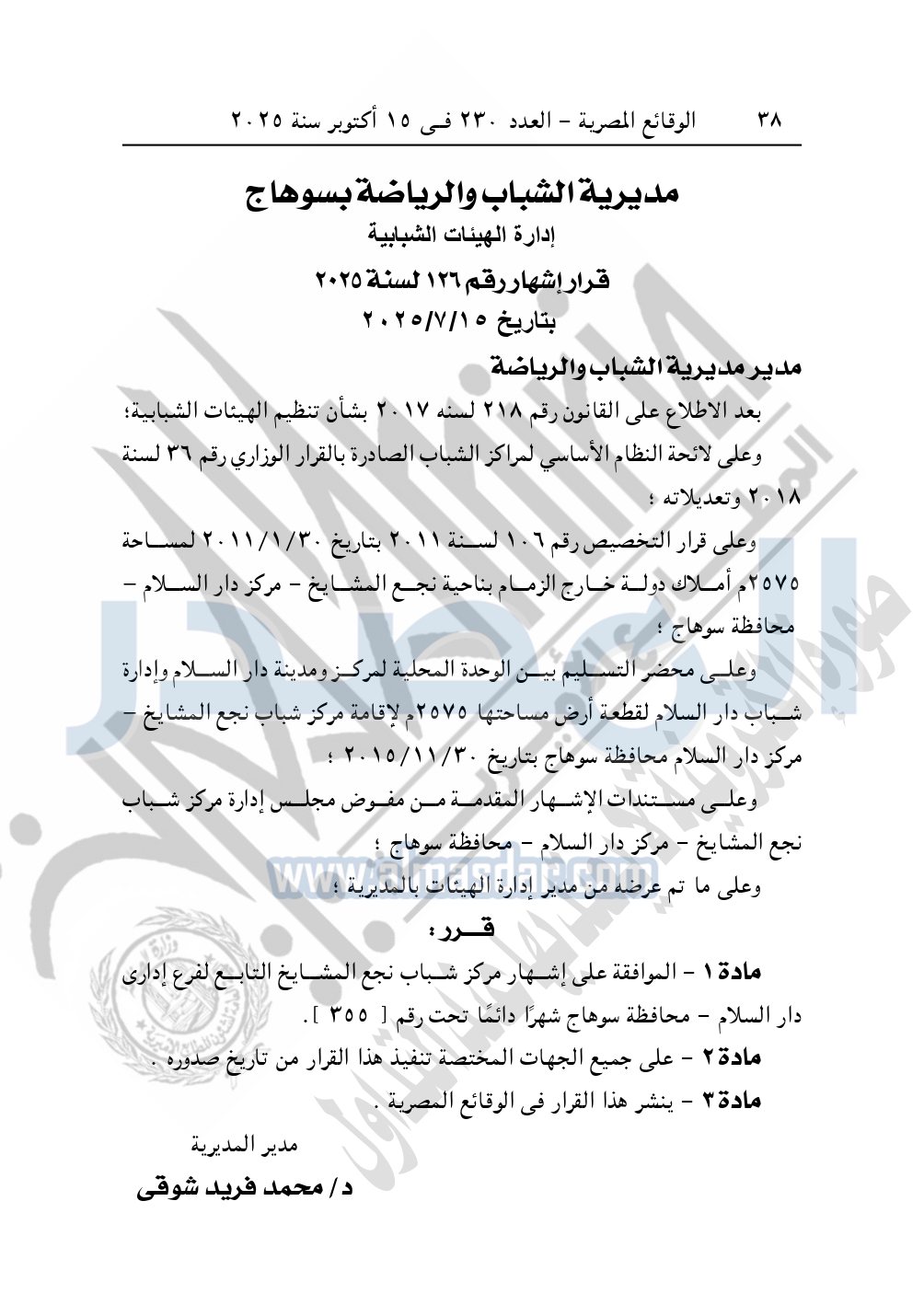 كما نشرت الوقائع المصرية في العدد 230، الصادر بتاريخ 15 أكتوبر 2025، قرار مديرية الشباب والرياضة بسوهاج، إدارة الهيئات الشبابية، قرار إشهار رقم 126 لسنة 2025، بتاريخ 15-7-2025، بشأن الموافقة على إشهار مركز شباب نجع المشايخ بمحافظة سوهاج.