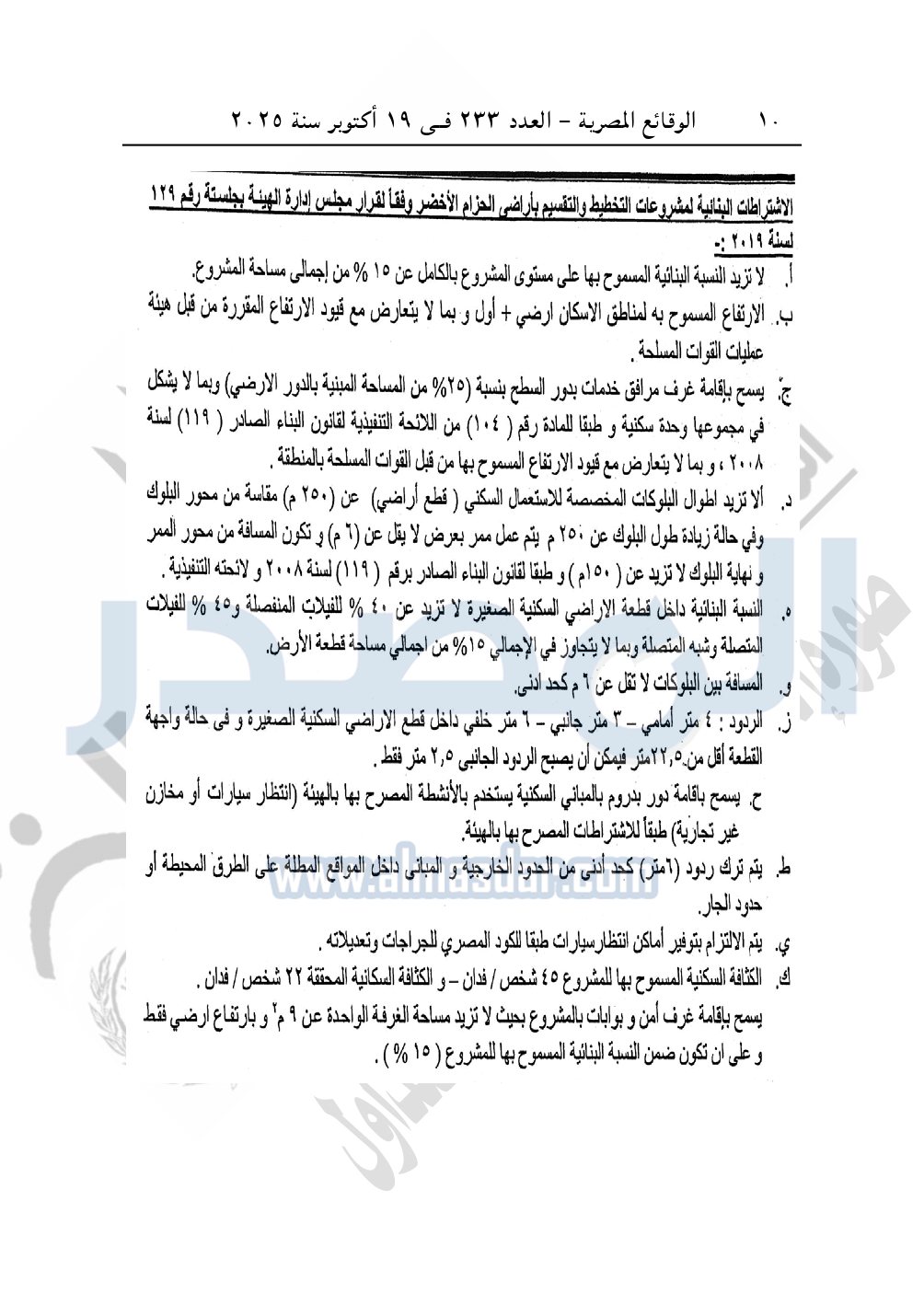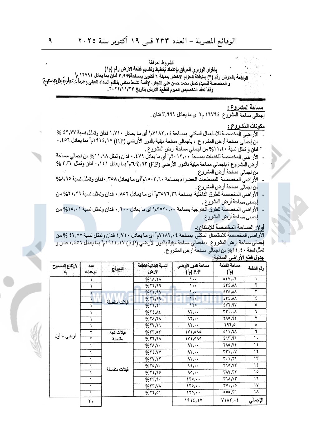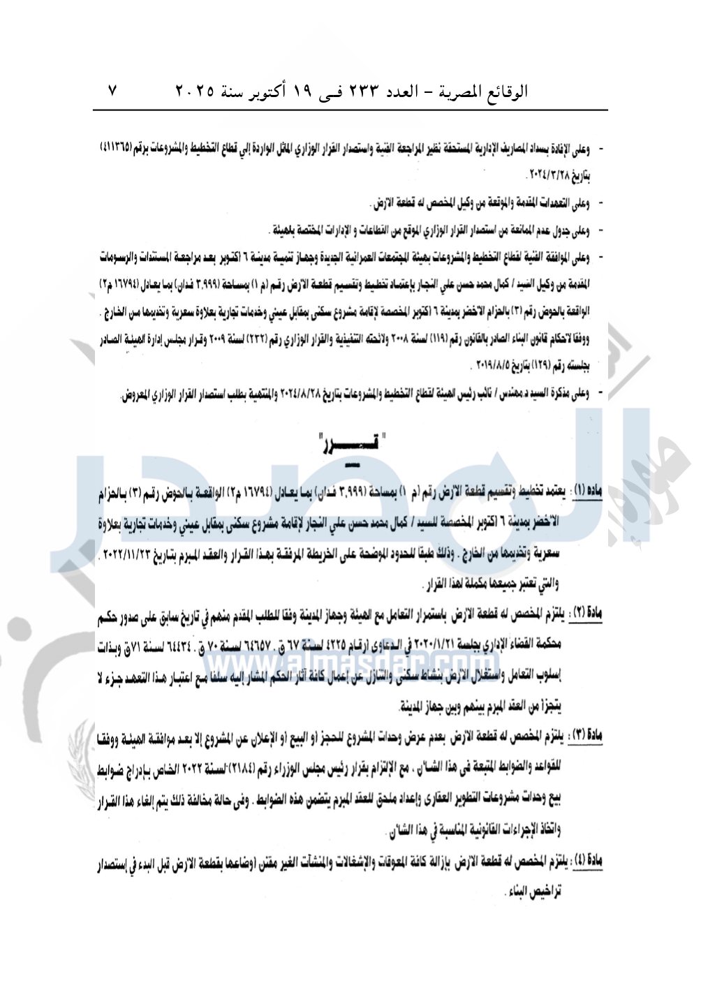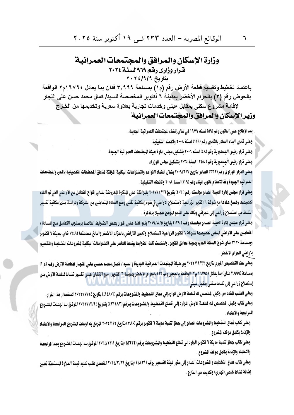 نشرت الوقائع المصرية في العدد 233، الصادر بتاريخ 19 أكتوبر 2025، قرار وزارة الإسكان والمرافق والمجتمعات العمرانية، قرار رقم 969 لسنة 2024، بتاريخ 9-9-2024، بشأن اعتماد تخطيط وتقسيم قطعة أرض بمساحة 3.999 فدان بالحزام الأخضر بمدينة 6 أكتوبر لإقامة مشروع سكنى بمقابل عينى وخدمات تجارية بعلاوة سعرية وتخديمها من الخارج.