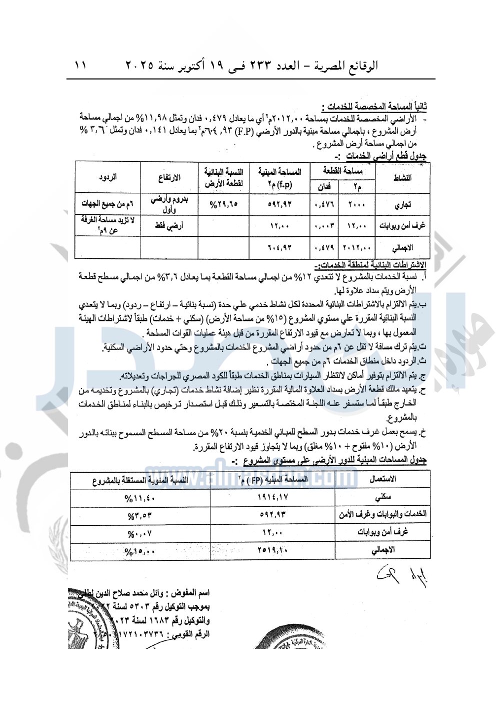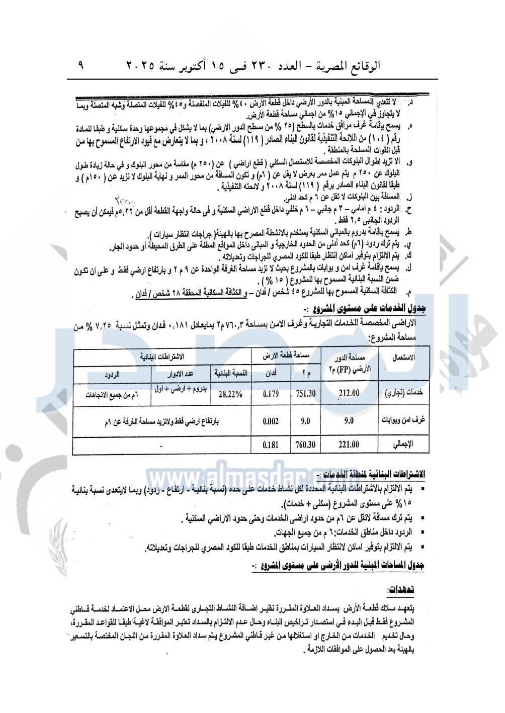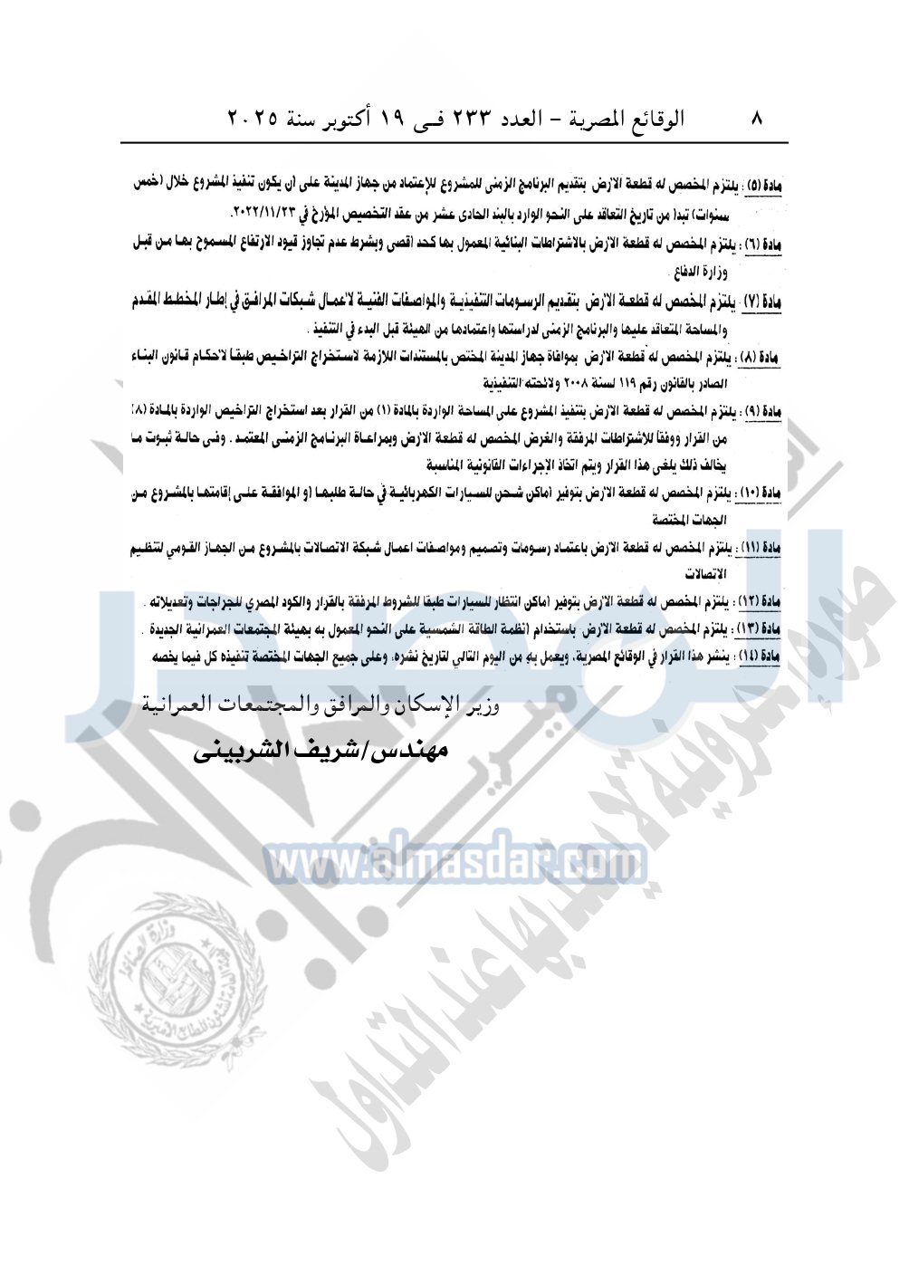 نشرت الوقائع المصرية في العدد 233، الصادر بتاريخ 19 أكتوبر 2025، قرار وزارة الإسكان والمرافق والمجتمعات العمرانية، قرار رقم 969 لسنة 2024، بتاريخ 9-9-2024، بشأن اعتماد تخطيط وتقسيم قطعة أرض بمساحة 3.999 فدان بالحزام الأخضر بمدينة 6 أكتوبر لإقامة مشروع سكنى بمقابل عينى وخدمات تجارية بعلاوة سعرية وتخديمها من الخارج.