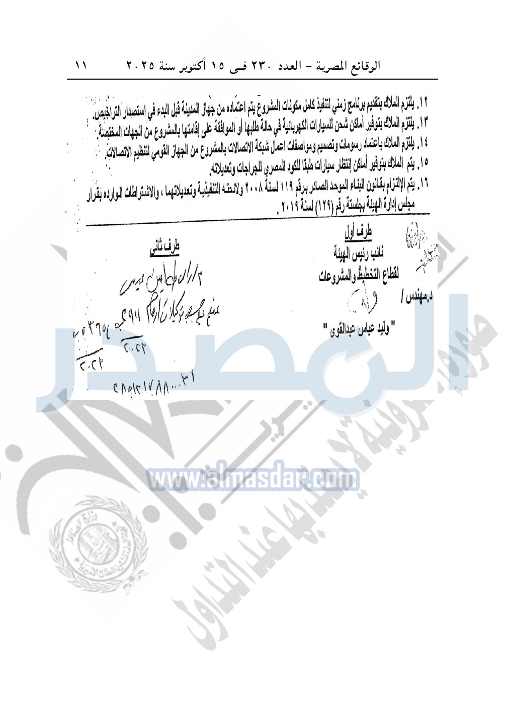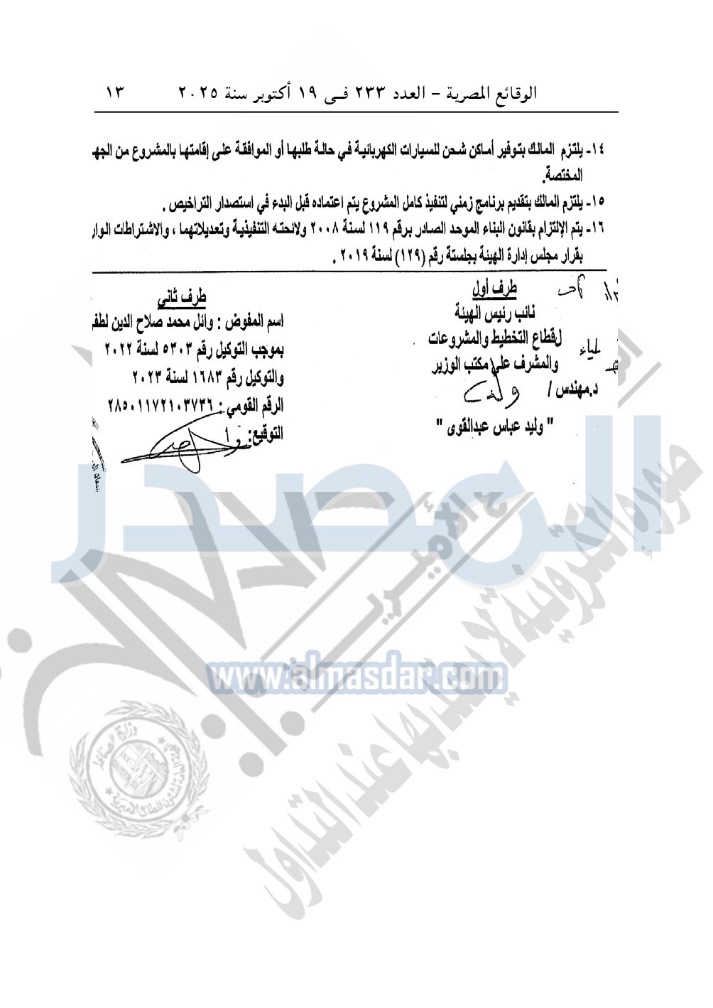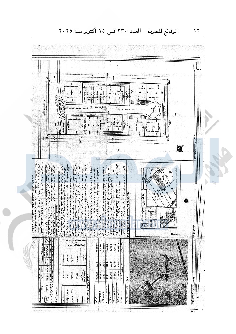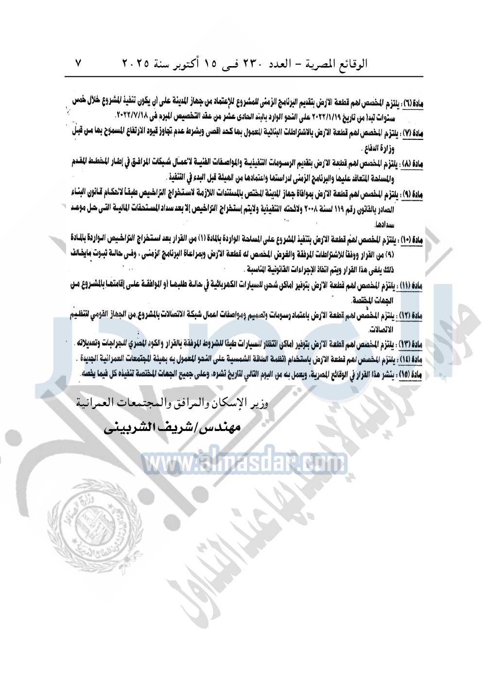 نشرت الوقائع المصرية في العدد 233، الصادر بتاريخ 19 أكتوبر 2025، قرار وزارة الإسكان والمرافق والمجتمعات العمرانية، قرار رقم 969 لسنة 2024، بتاريخ 9-9-2024، بشأن اعتماد تخطيط وتقسيم قطعة أرض بمساحة 3.999 فدان بالحزام الأخضر بمدينة 6 أكتوبر لإقامة مشروع سكنى بمقابل عينى وخدمات تجارية بعلاوة سعرية وتخديمها من الخارج.