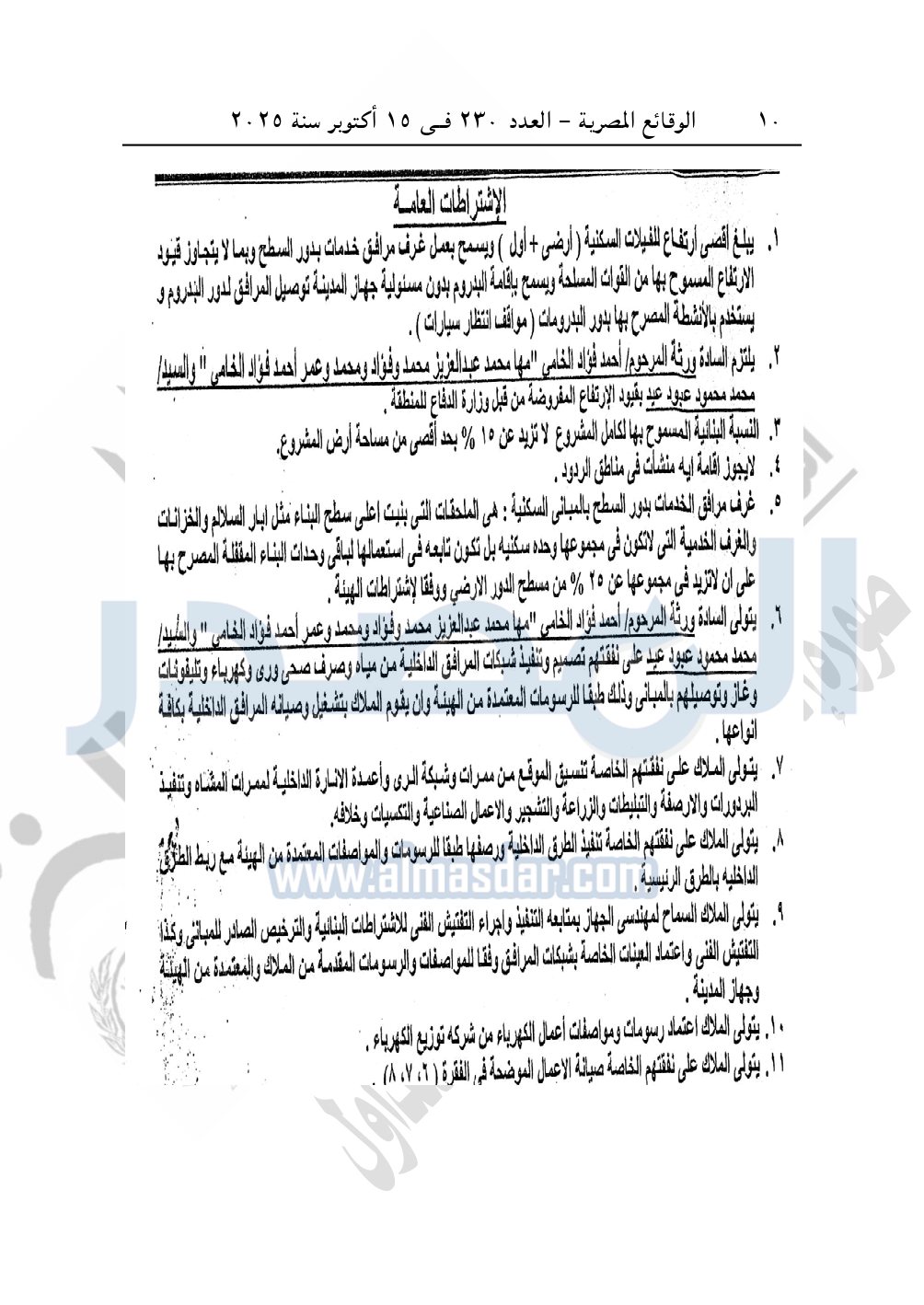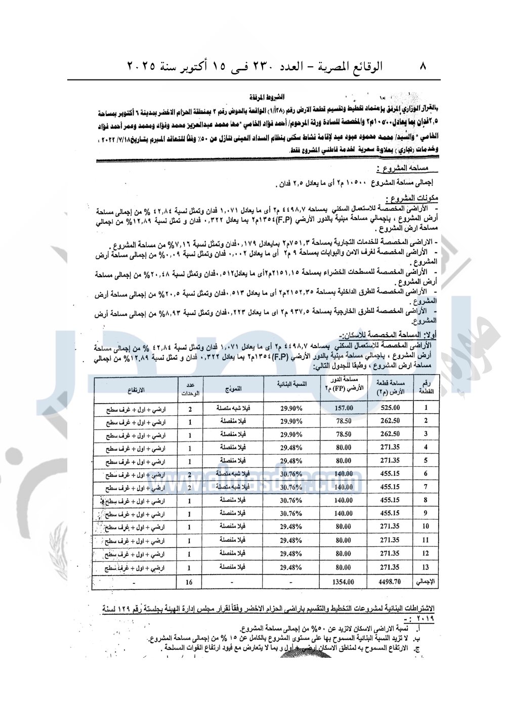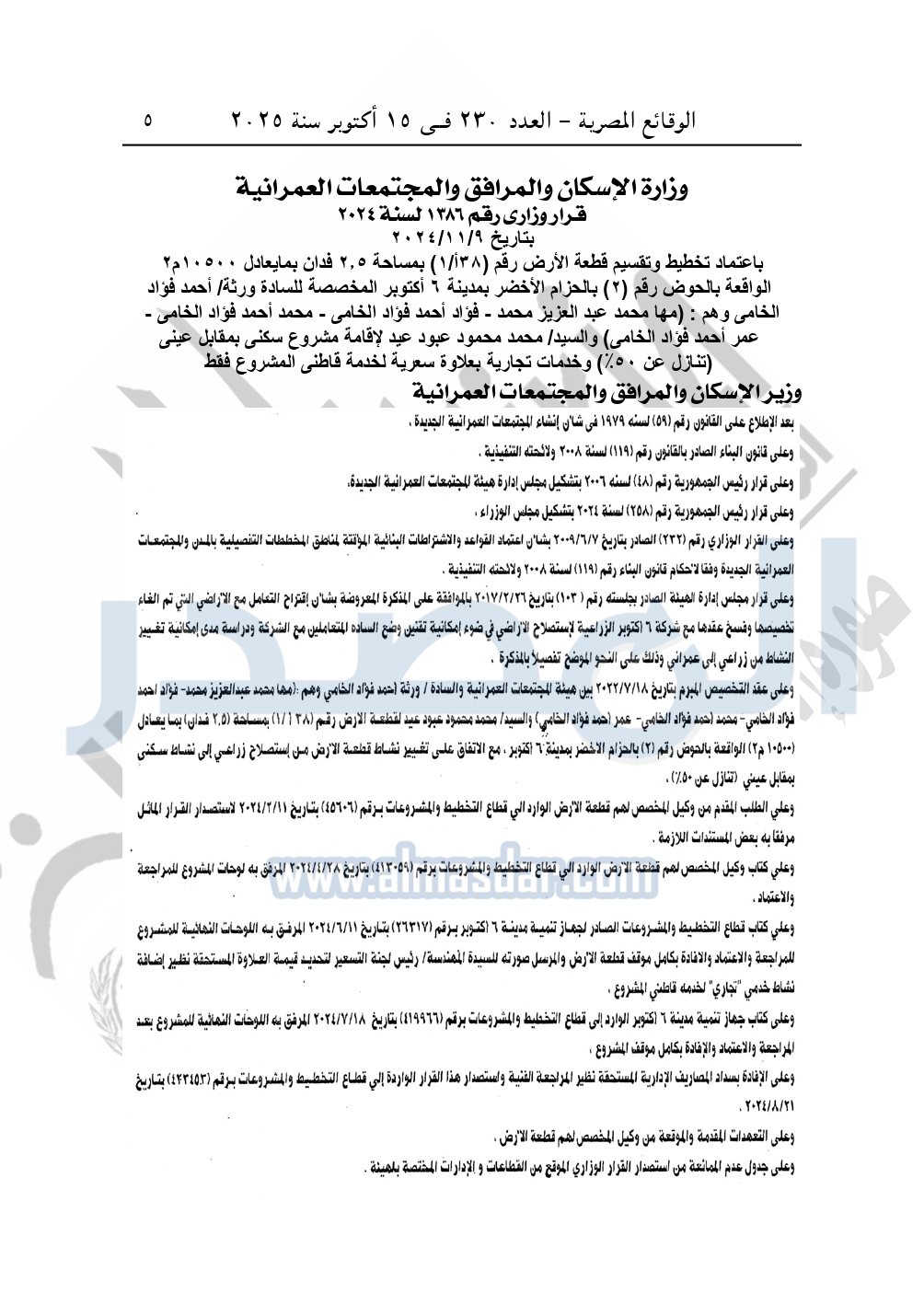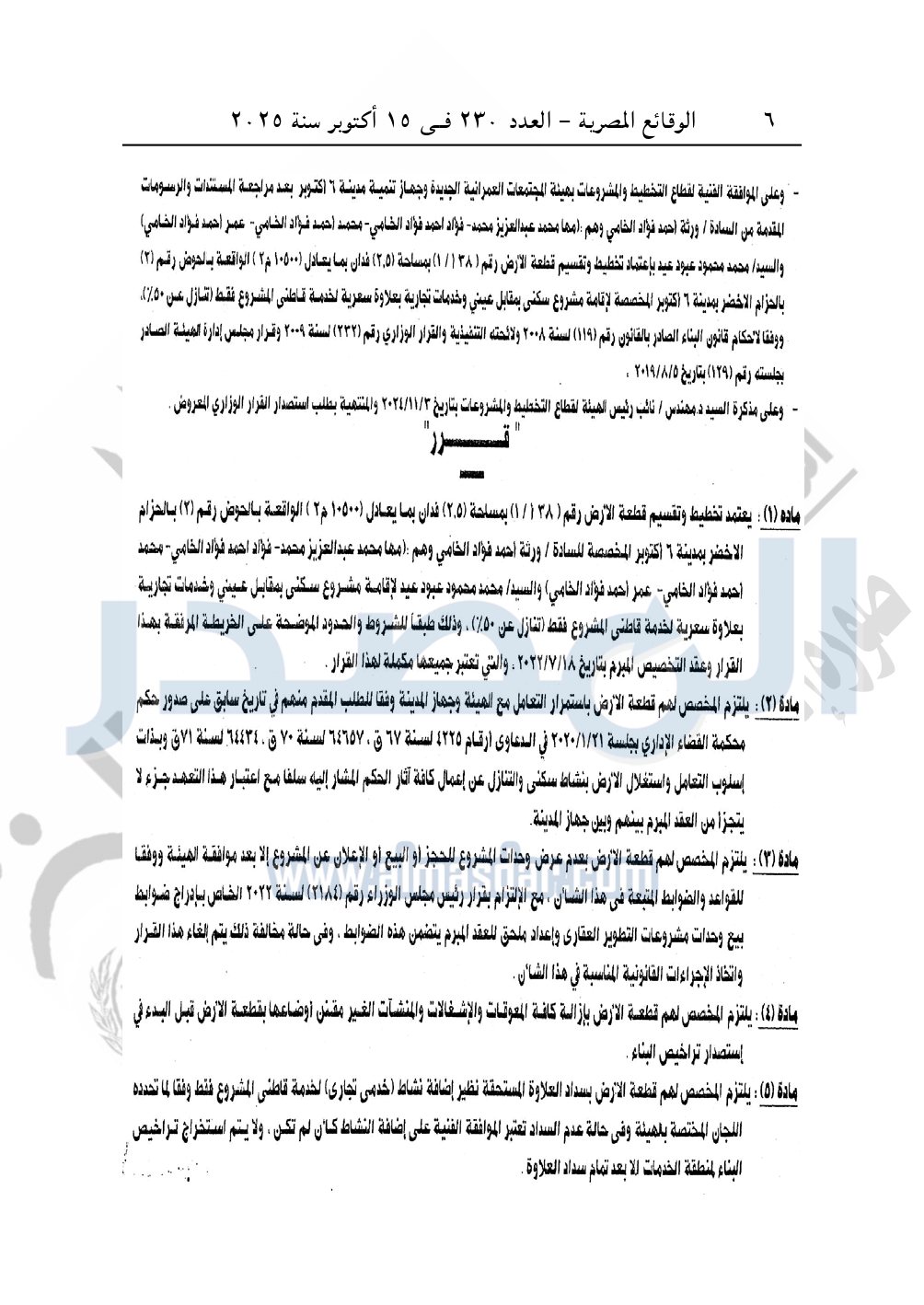 كما نشرت الوقائع المصرية في العدد 230 الصادر بتاريخ 15 أكتوبر 2025، قرار وزارة الإسكان والمرافق والمجتمعات العمرانية، قرار رقم 1386 لسنة 2024، بتاريخ 9-11-2024، بشأن اعتماد تخطيط وتقسيم قطعة الأرض رقم "38أ / 1" بمساحة 2.5 فدان بمايعادل 10500م2 الواقعة بالحوض رقم "2" بالحزام الأخضر بمدينة 6 أكتوبر المخصصة لـ ورثة أحمد فؤاد الخامى وهم: "مها محمد عبد العزيز محمد - فؤاد أحمد فؤاد الخامى - محمد أحمد فؤاد الخامى - عمر أحمد فؤاد الخامي" ومحمد محمود عبود عيد لإقامة مشروع سكنى بمقابل عينى "تنازل عن "50%" وخدمات تجارية بعلاوة سعرية لخدمة قاطني المشروع فقط.