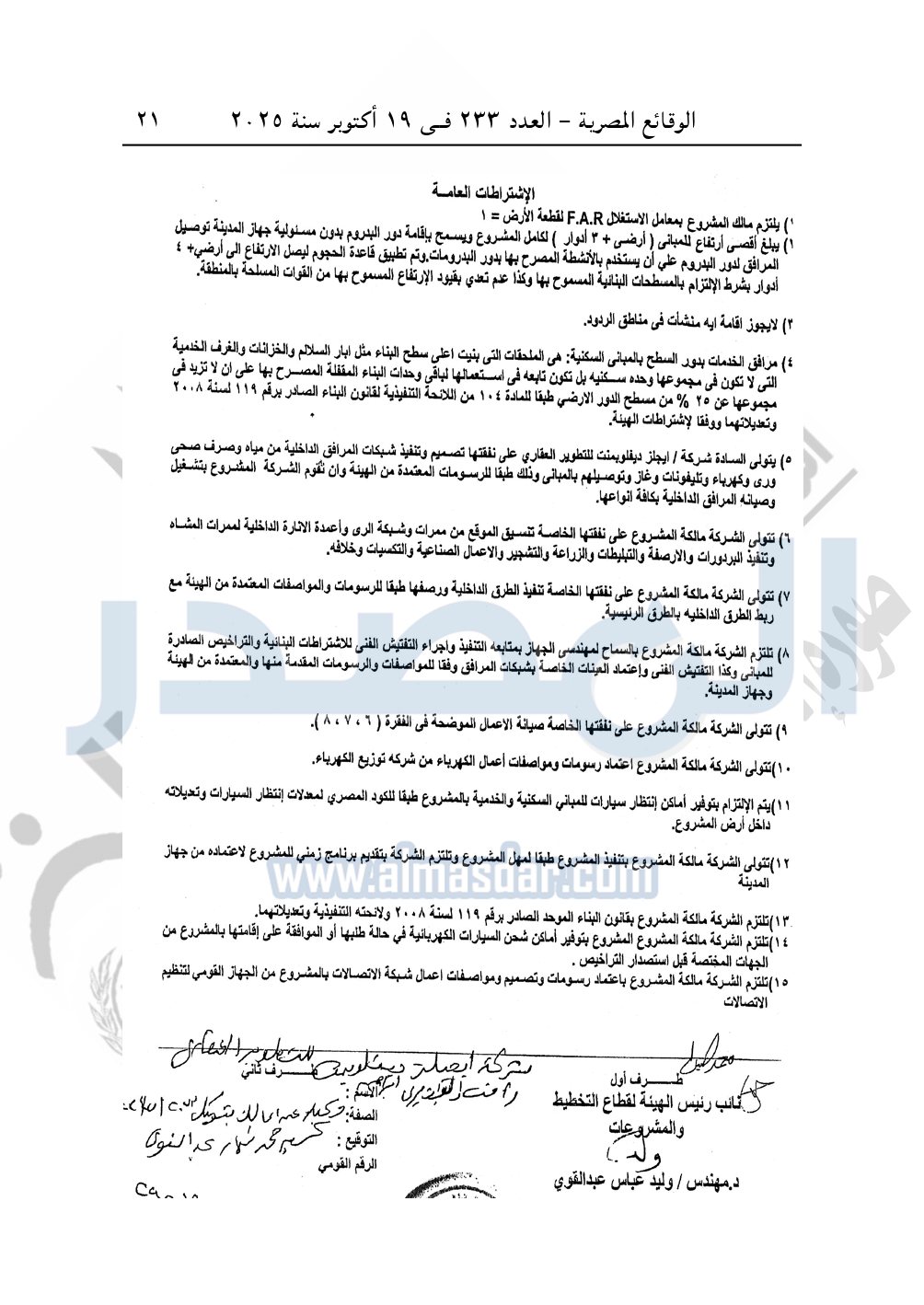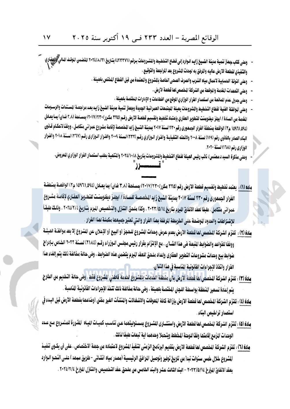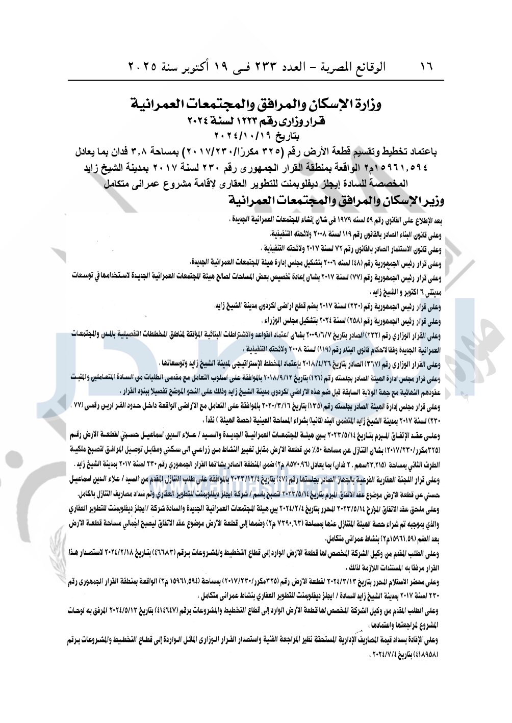 نشرت الوقائع المصرية في العدد 233 الصادر بتاريخ 19 أكتوبر 2025، قرار وزارة الإسكان والمرافق والمجتمعات العمرانية، قرار رقم 1223 لسنة 2024، بشأن اعتماد تخطيط وتقسيم قطعة أرض بمساحة 3.8 فدان بمدينة الشيخ زايد المخصصة لـ إيجلز ديفلوبمنت للتطوير العقاري لإقامة مشروع عمراني متكامل.