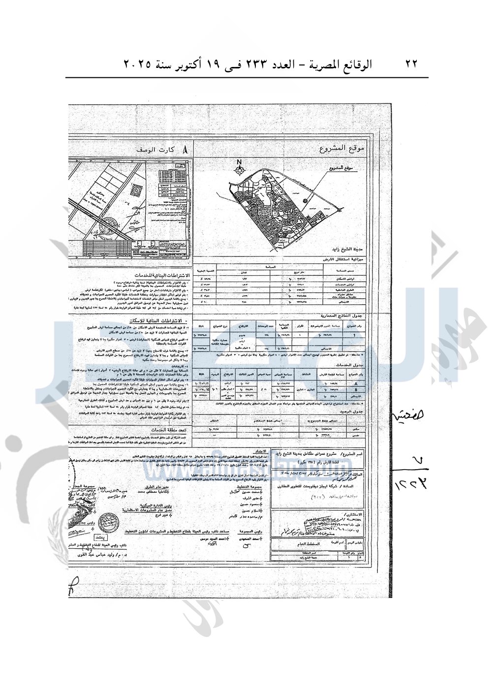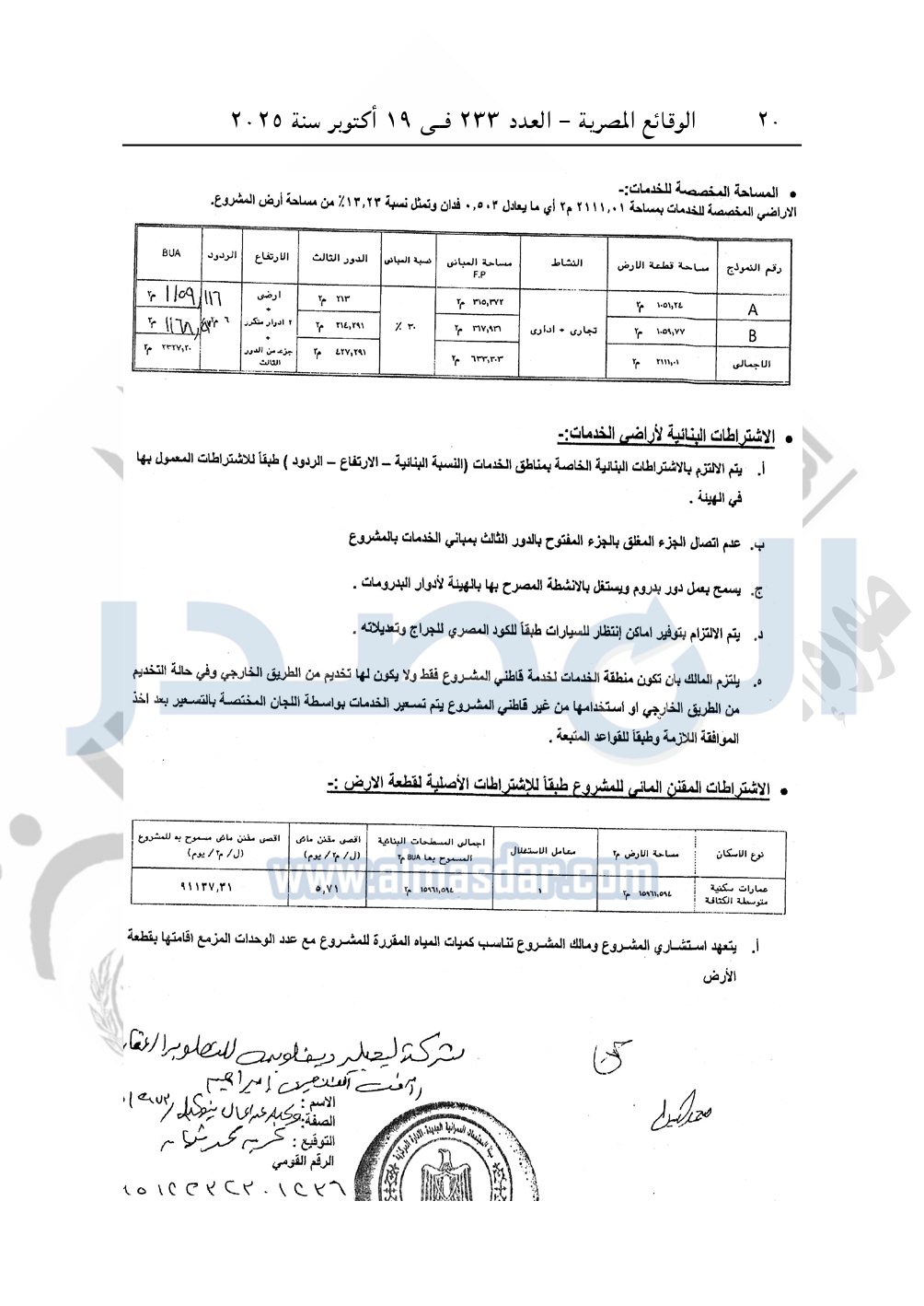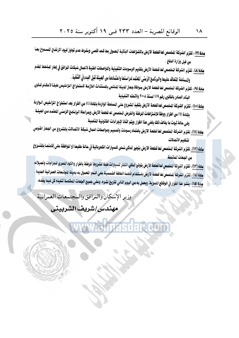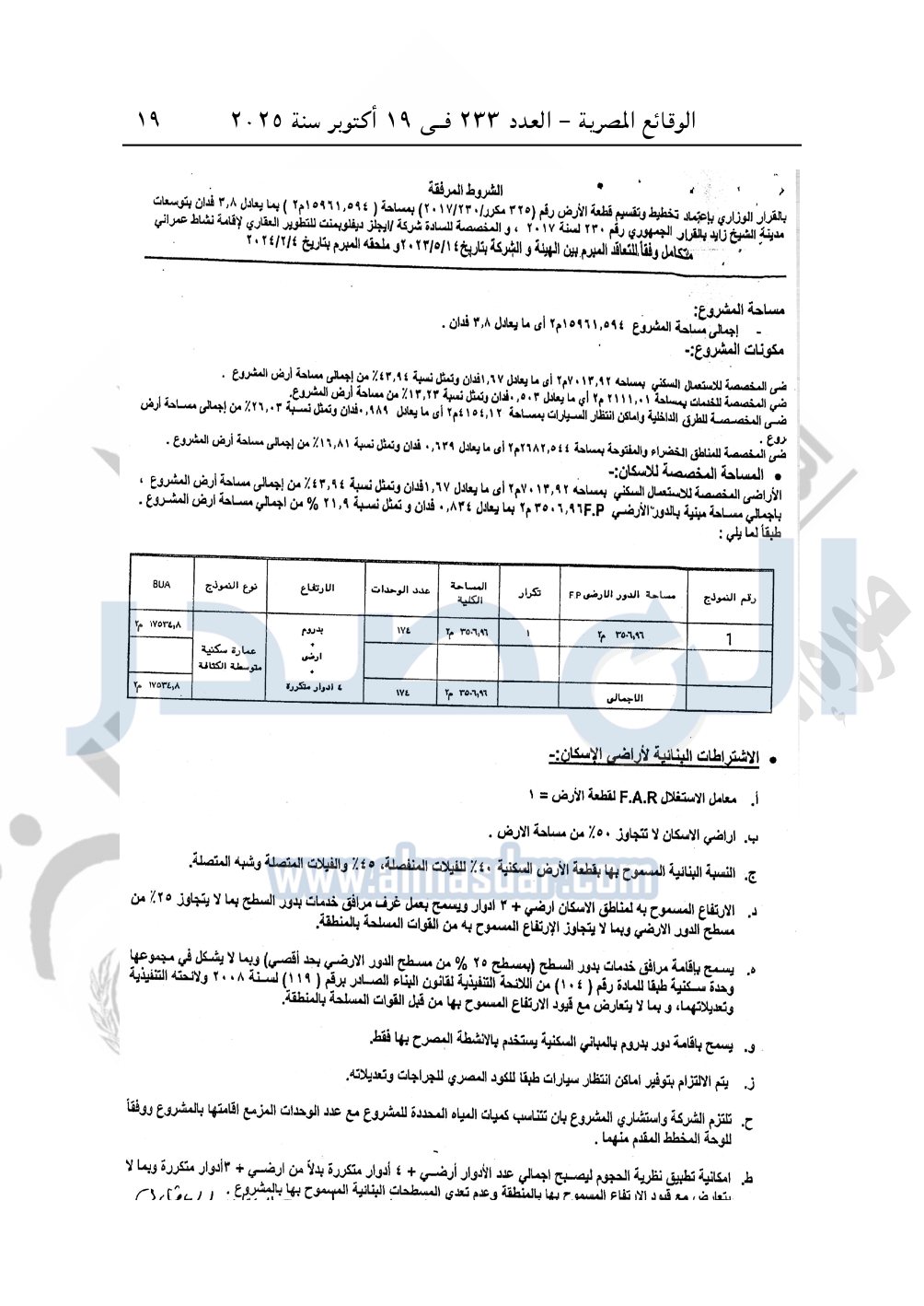 نشرت الوقائع المصرية في العدد 233 الصادر بتاريخ 19 أكتوبر 2025، قرار وزارة الإسكان والمرافق والمجتمعات العمرانية، قرار رقم 1223 لسنة 2024، بشأن اعتماد تخطيط وتقسيم قطعة أرض بمساحة 3.8 فدان بمدينة الشيخ زايد المخصصة لـ إيجلز ديفلوبمنت للتطوير العقاري لإقامة مشروع عمراني متكامل.
