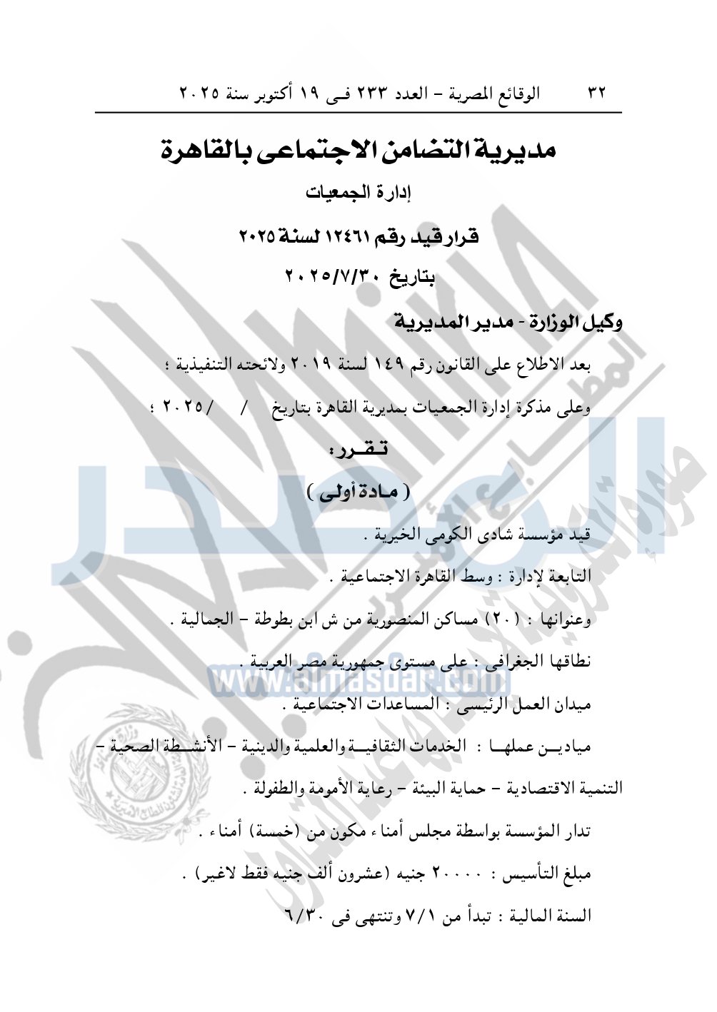 نشرت الوقائع المصرية في العدد 233، بتاريخ 19 أكتوبر 2025، قرار مديرية التضامن الاجتماعي بالقاهرة، قيد رقم 12461 لسنة 2025، بتاريخ 30-7-2025، بشأن قيد مؤسسة شادي الكومى الخيرية.
