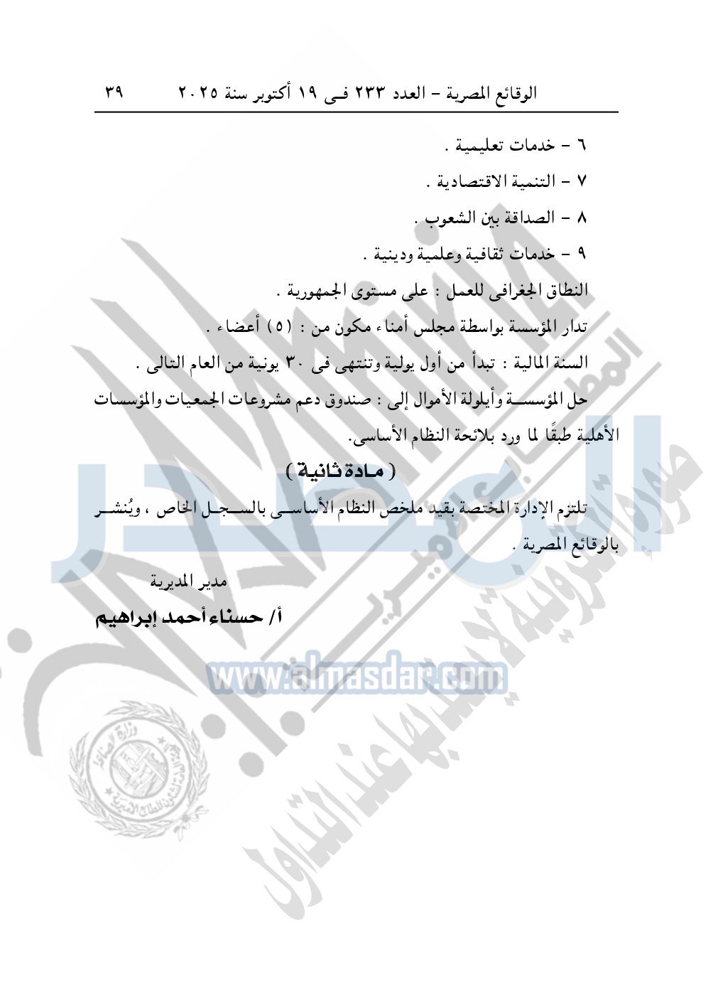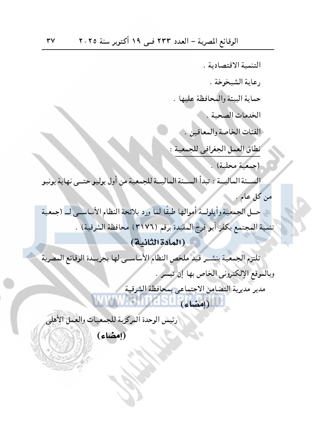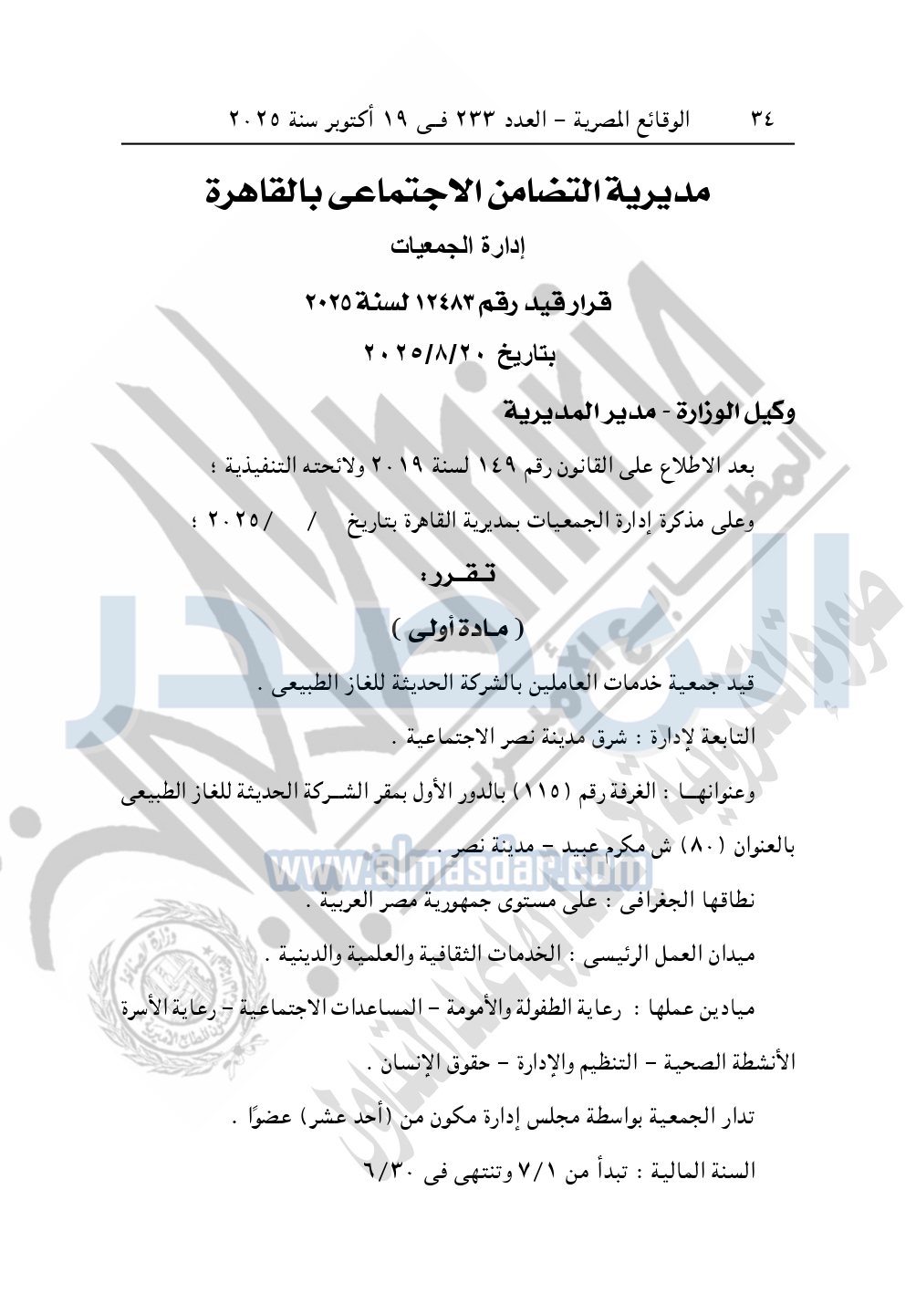 كما نشرت الوقائع المصرية في العدد 233، بتاريخ 19 أكتوبر 2025، قرار مديرية التضامن الاجتماعي بالقاهرة، قيد رقم 12483 لسنة 2025، بتاريخ 20-8-2025، بشأن قيد جمعية خدمات العاملين بالشركة الحديثة للغاز الطبيعي.