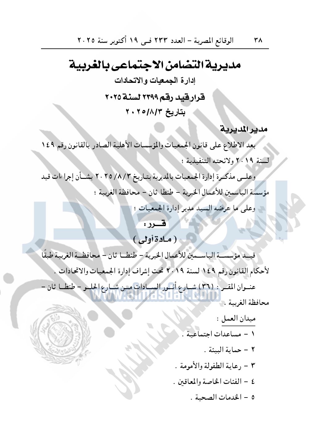 ونشرت الوقائع المصرية في العدد 233، بتاريخ 19 أكتوبر 2025، قرار مديرية التضامن الاجتماعي بالغربية، قيد رقم 2399 لسنة 2025، بتاريخ 3-8-2025، بشأن قيد مؤسسة الياسمين للأعمال الخيرية.