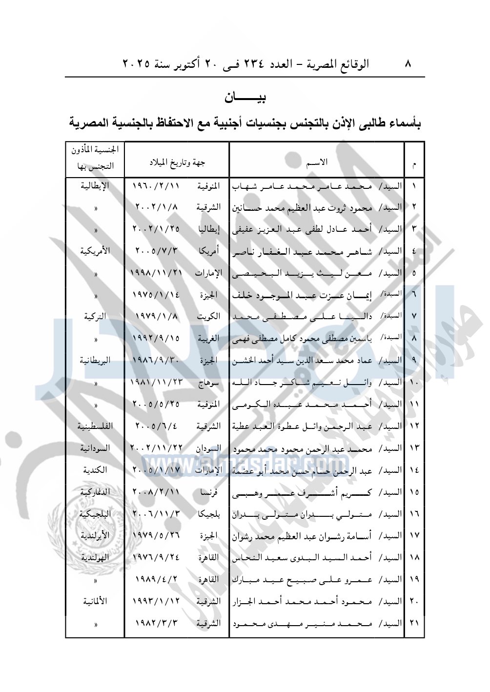 نشرت الوقائع المصرية في العدد 234 الصادر في 20 أكتوبر سنة 2025، قرار وزارة الداخلية، رقم 1685 لسنة 2025، بشأن الإذن للواحد والعشرين مواطن بالحصول على الجنسية الأجنبية مع احتفاظهم بالجنسية المصرية.