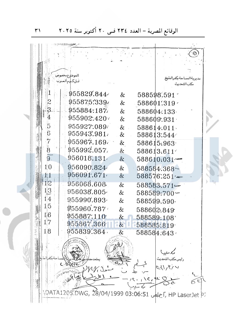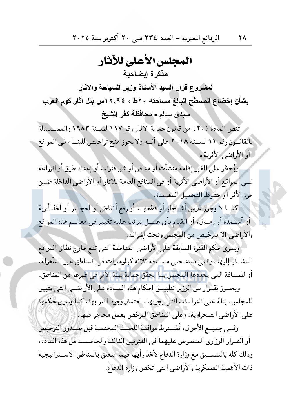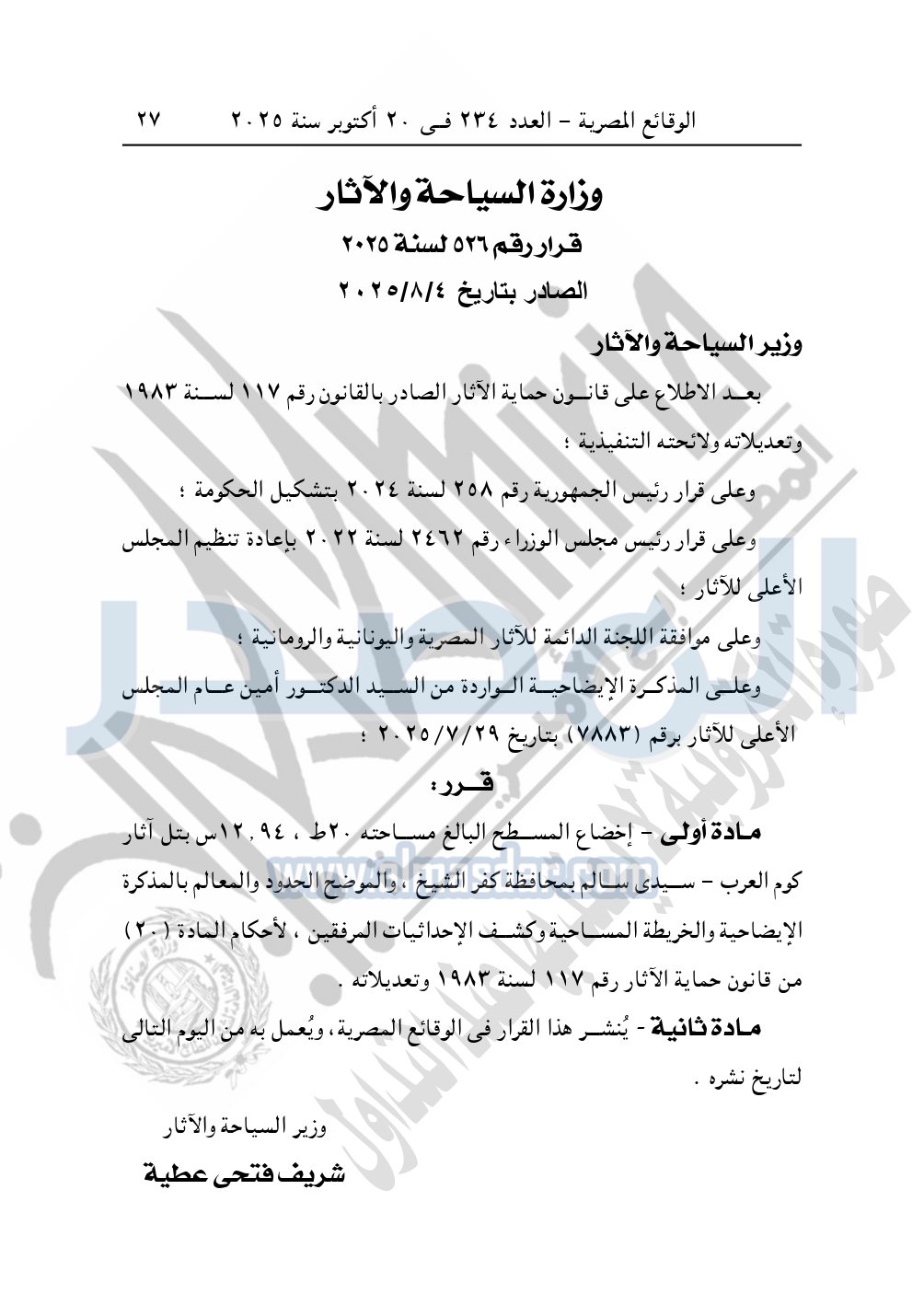 نشرت الوقائع المصرية في العدد 234 الصادر في 20 أكتوبر سنة 2025، قرار وزارة السياحة والآثار، رقم 526 لسنة 2025، الصادر بتاريخ 4-8-2025، بشأن إخضاع قطعة أرض في كفر الشيخ لقانون حماية الآثار.