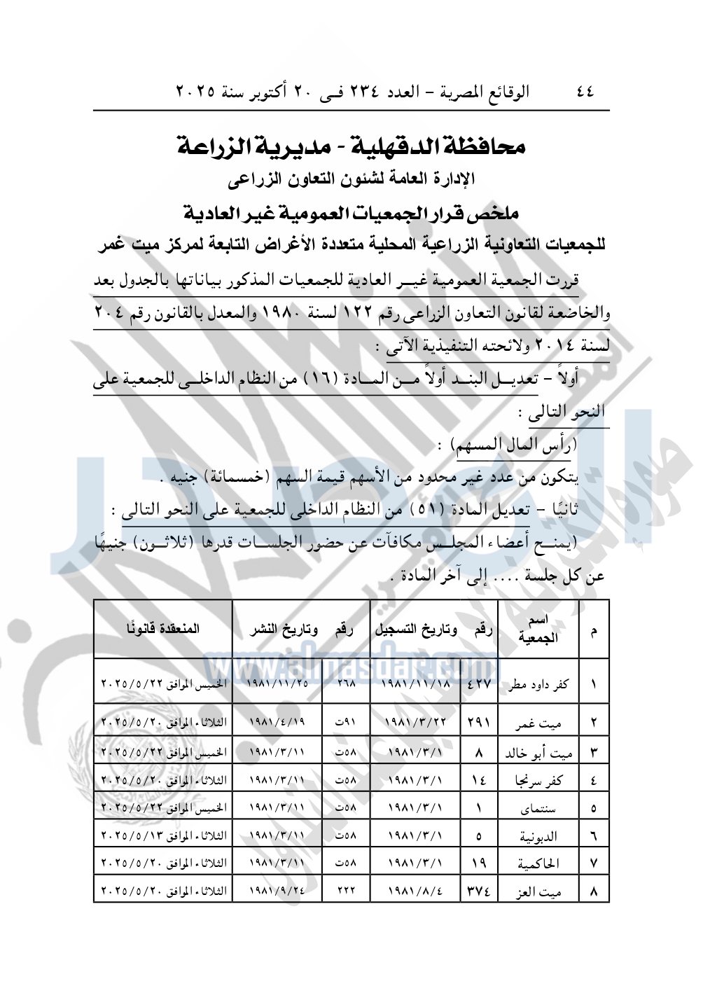 نشرت الوقائع المصرية في العدد 234 الصادر في 20 أكتوبر سنة 2025، قرار مديرية الزراعة - محافظة الدقهلية، الإدارة العامة لشئون التعاون الزراعي، بشأن ملخص قرار الجمعيات العمومية غير العادية للجمعيات التعاونية الزراعية المحلية متعددة الأغراض التابعة لمركز ميت غمر.