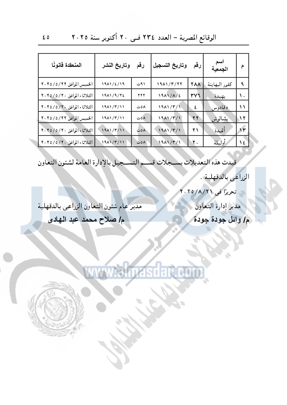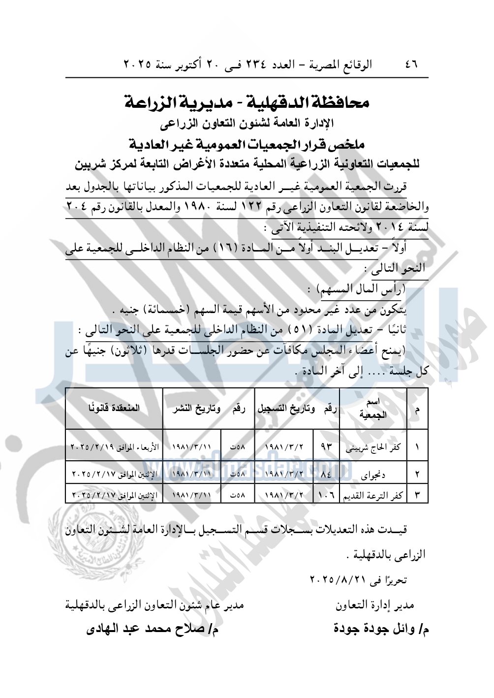 كما نشرت الوقائع المصرية في العدد 234 الصادر في 20 أكتوبر سنة 2025، قرار مديرية الزراعة - محافظة الدقهلية، الإدارة العامة لشئون التعاون الزراعي، بشأن ملخص قرار الجمعيات العمومية غير العادية للجمعيات التعاونية الزراعية المحلية متعددة الأغراض التابعة لمركز شربين.