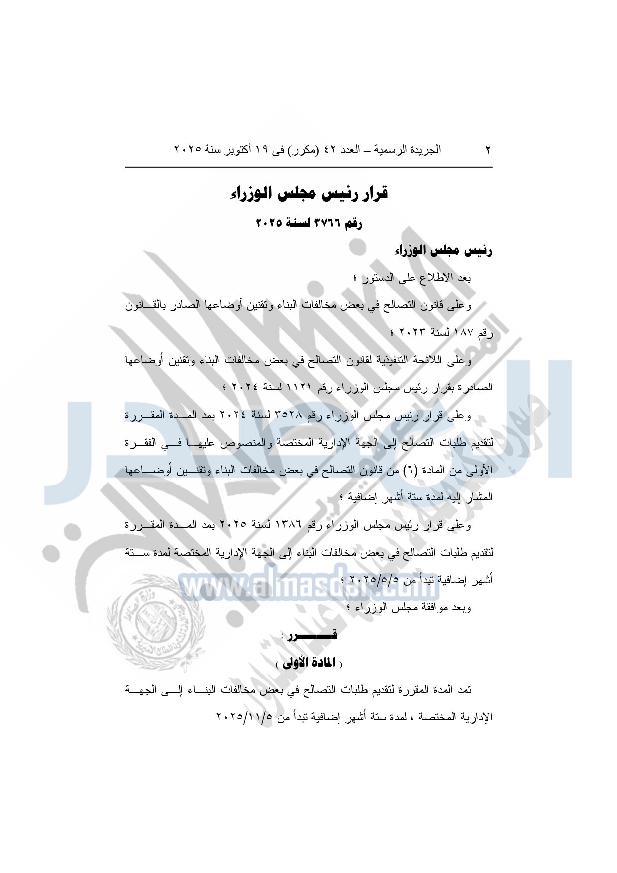 تمد المدة المقررة لتقديم طلبات التصالح في بعض مخالفات البناء إلى الجهة الإدارية المختصة، لمدة ستة أشهر إضافية تبدأ من 5-11-2025.