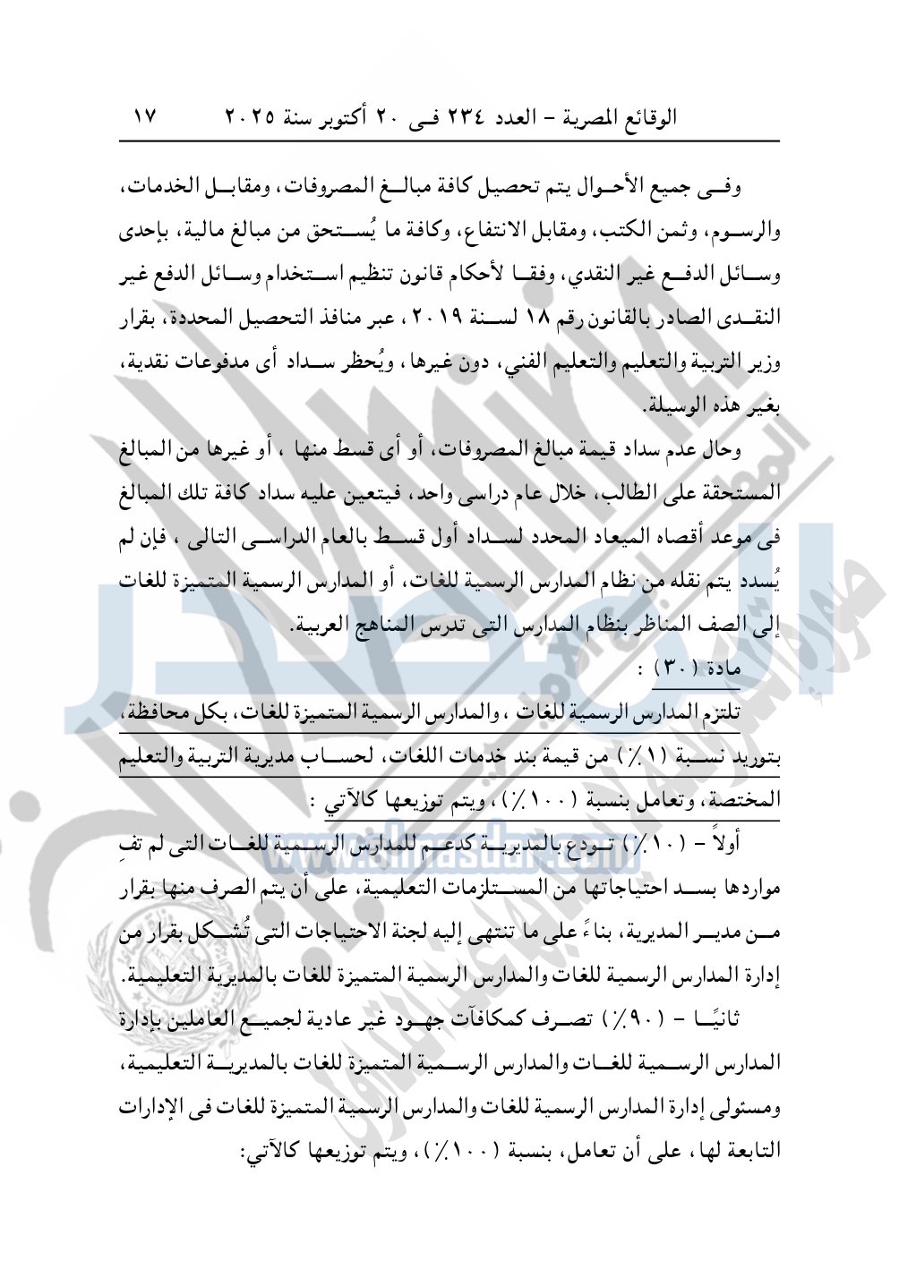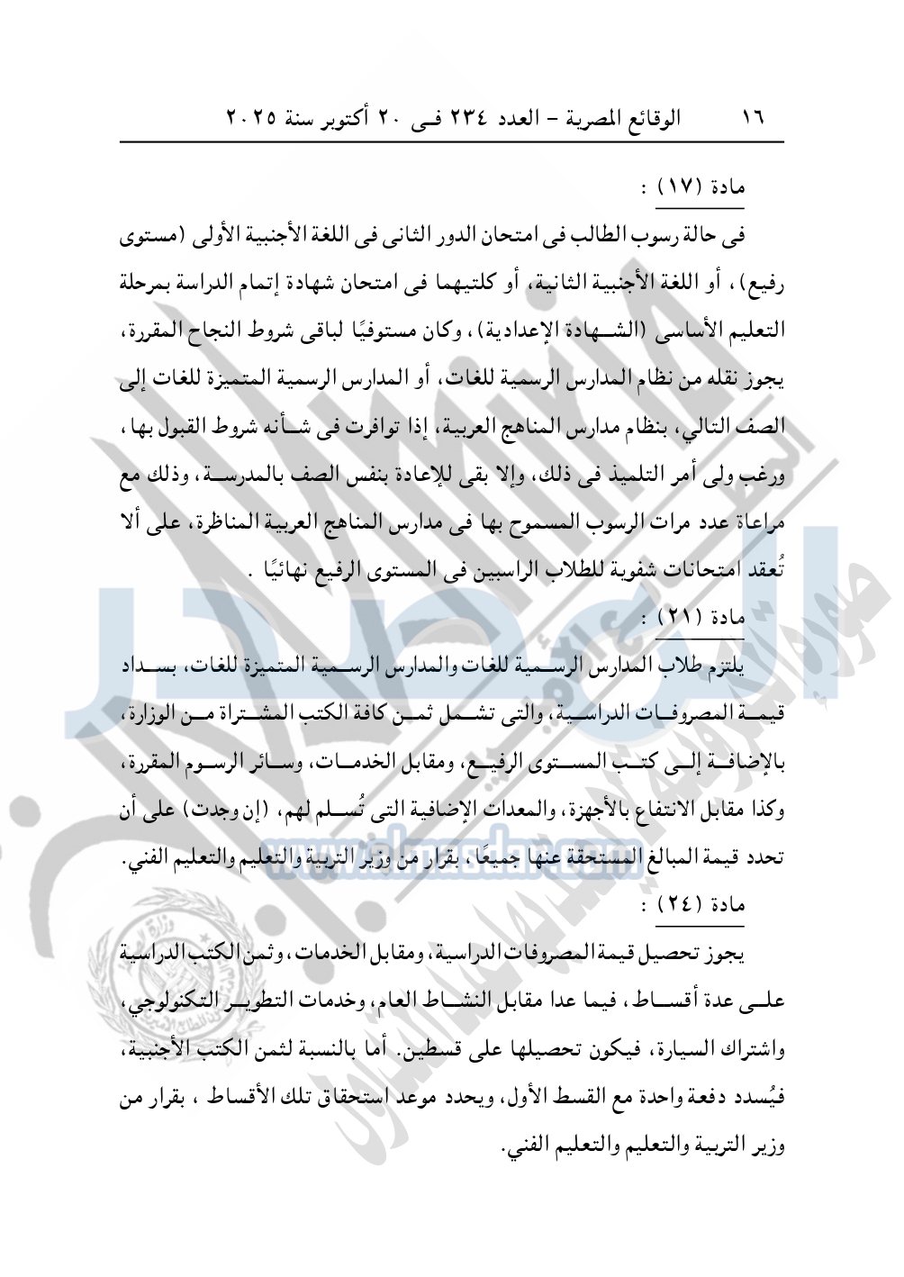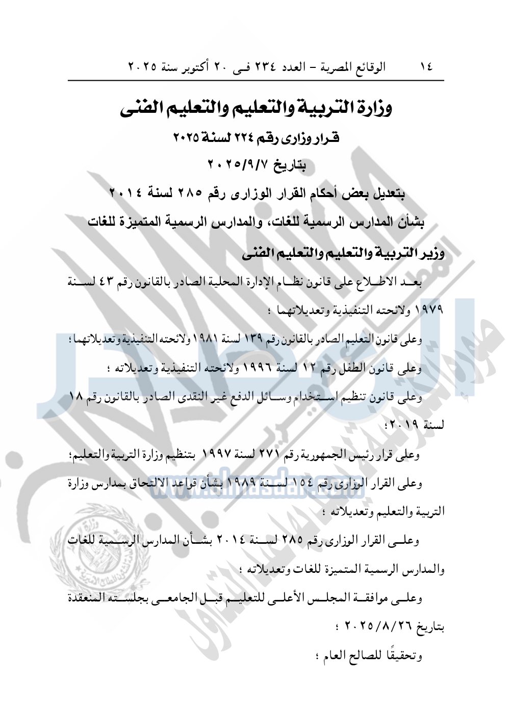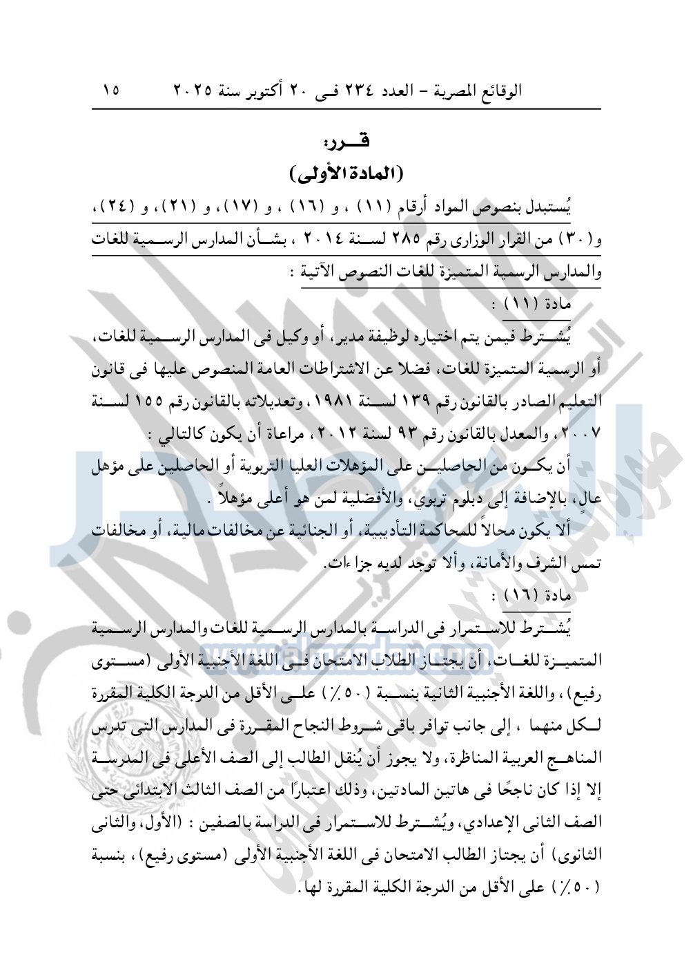 نشرت الوقائع المصرية في العدد 234 الصادر في 20 أكتوبر سنة 2025، قرار وزارة التربية والتعليم والتعليم الفنى، قرار وزاري رقم 224 لسنة 2025، بتاريخ 7-9-2025، بتعديل بعض أحكام القرار الوزارى رقم 285 لسنة 2014، بشأن المدارس الرسمية للغات، والمدارس الرسمية المتميزة للغات.
