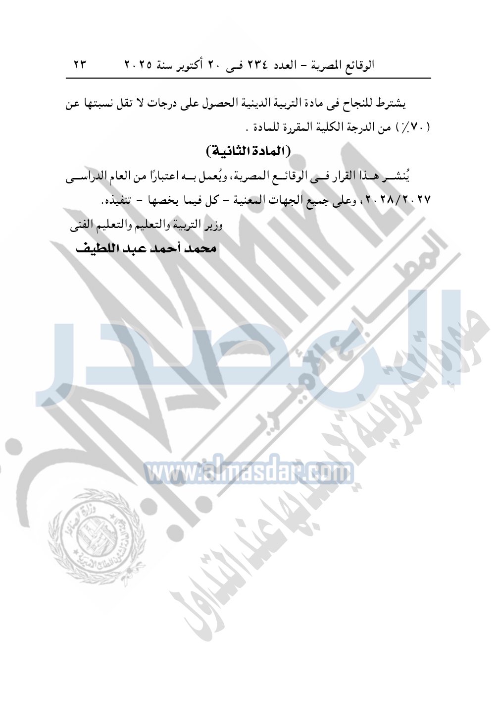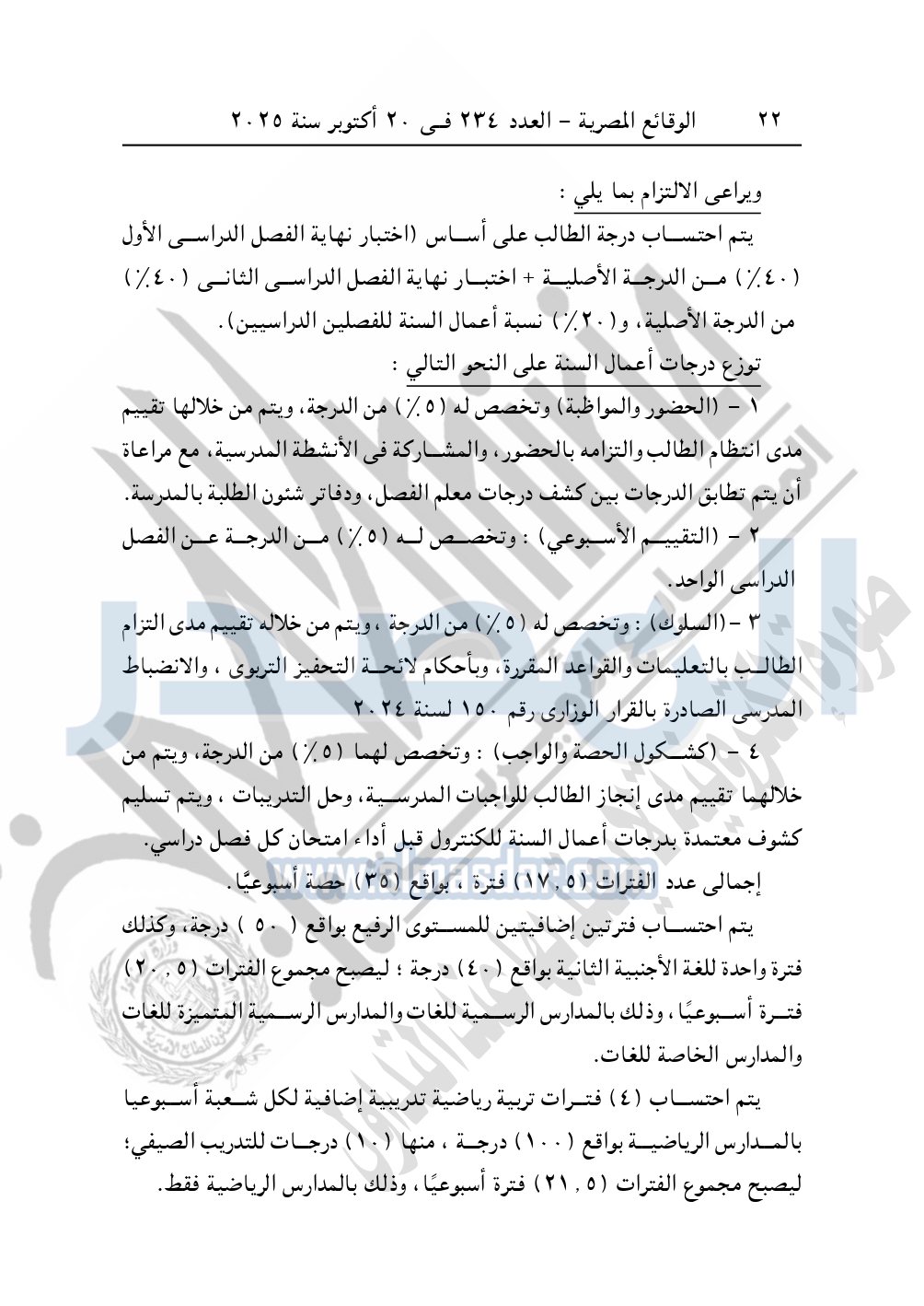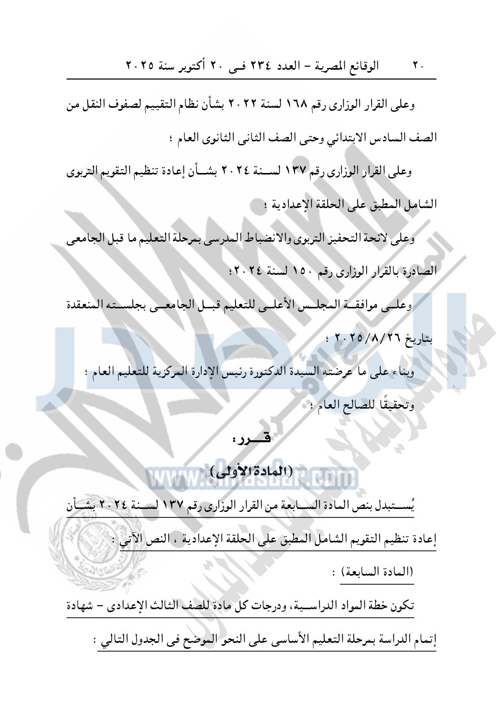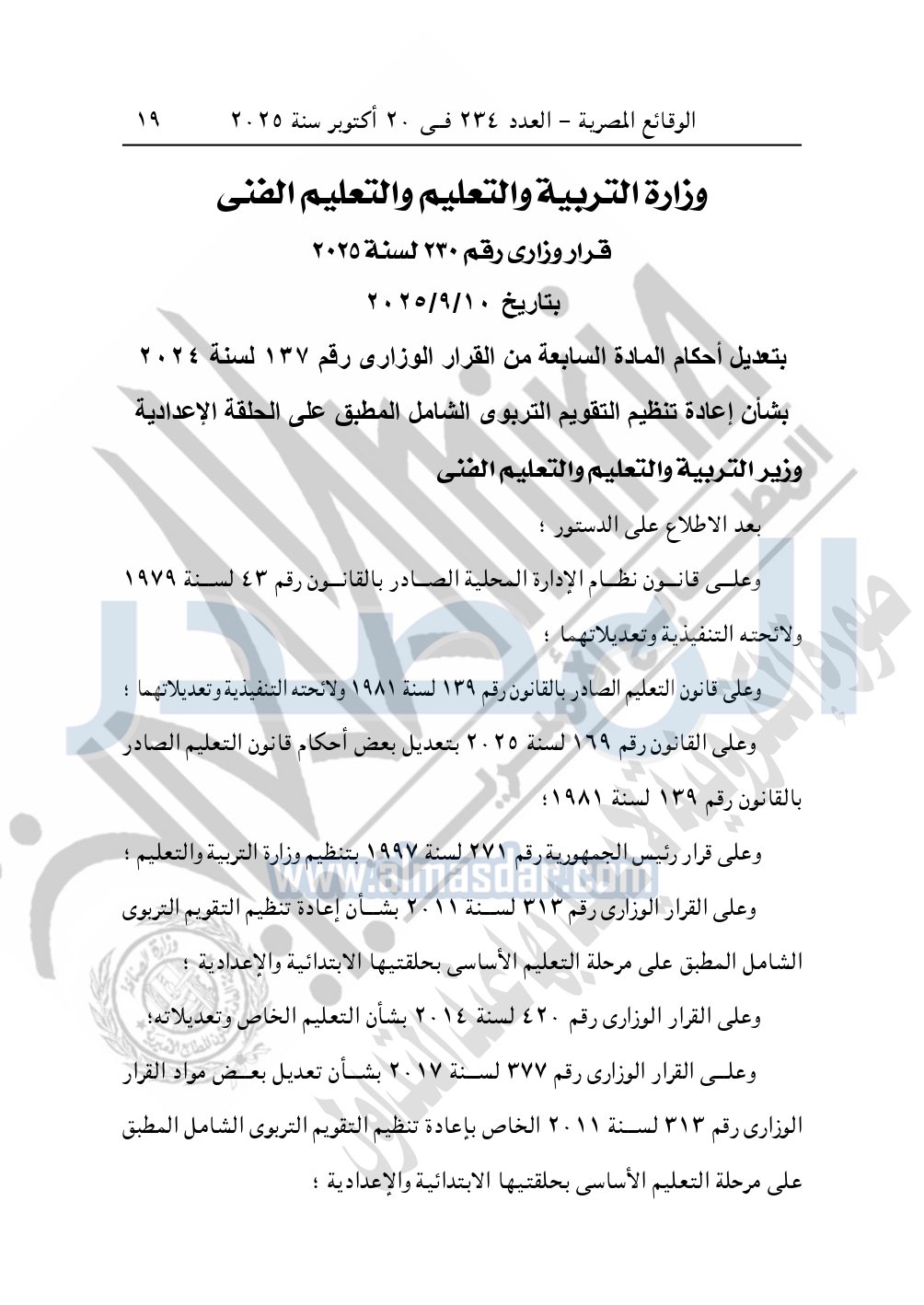 نشرت الوقائع المصرية في العدد 234 الصادر في 20 أكتوبر سنة 2025، قرار وزارة التربية والتعليم والتعليم الفنى، قرار وزاري رقم 230 لسنة 2025، بتاريخ 10-9-2025، بتعديل أحكام المادة السابعة من القرار الوزارى رقم 137 لسنة 2024، بشأن إعادة تنظيم التقويم التربوى الشامل المطبق على الحلقة الإعدادية.