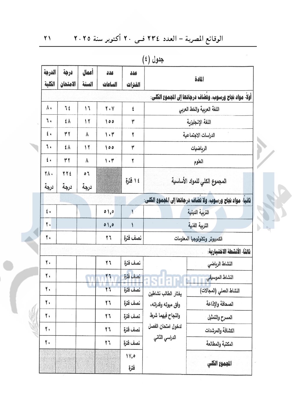 تكون خطة المواد الدراسية، ودرجات كل مادة للصف الثالث الإعدادي – شهادة إتمام الدراسة بمرحلة التعليم الأساسي على النحو الموضح في الجدول التالي: