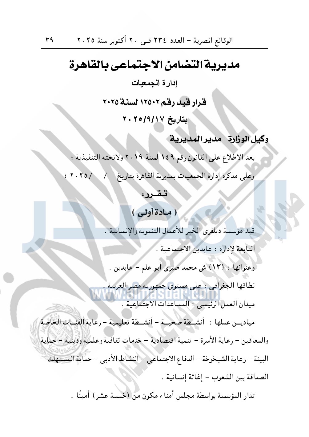كما نشرت الوقائع المصرية في العدد 234، بتاريخ 20 أكتوبر 2025، قرار مديرية التضامن الاجتماعي بالقاهرة، قيد رقم 12502 لسنة 2025، بتاريخ 17-9-2025، بشأن قيد مؤسسة ديلفرى الخير للأعمال التنموية والإنسانية.