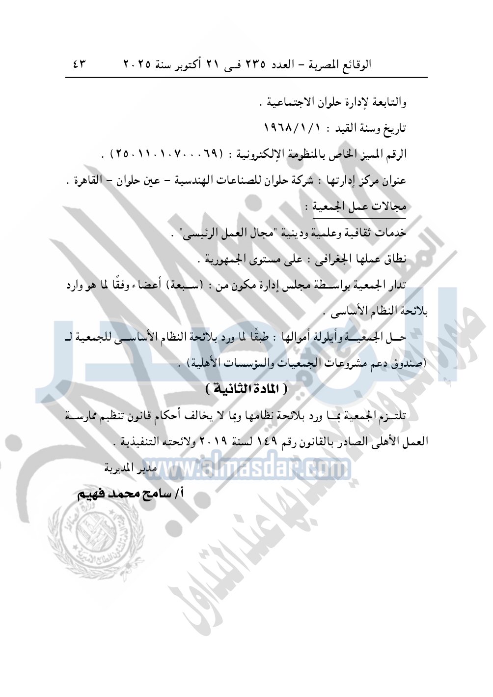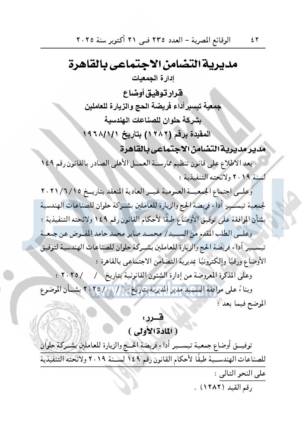 نشرت الوقائع المصرية في العدد 235، في 21 أكتوبر 2025، قرار مديرية التضامن الاجتماعي بالقاهرة، بشأن توفيق أوضاع جمعية تيسير أداء فريضة الحج والزيارة للعاملين، المقيدة برقم "1282"، بتاريخ 1-1-1968.