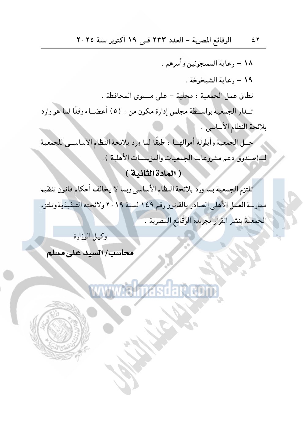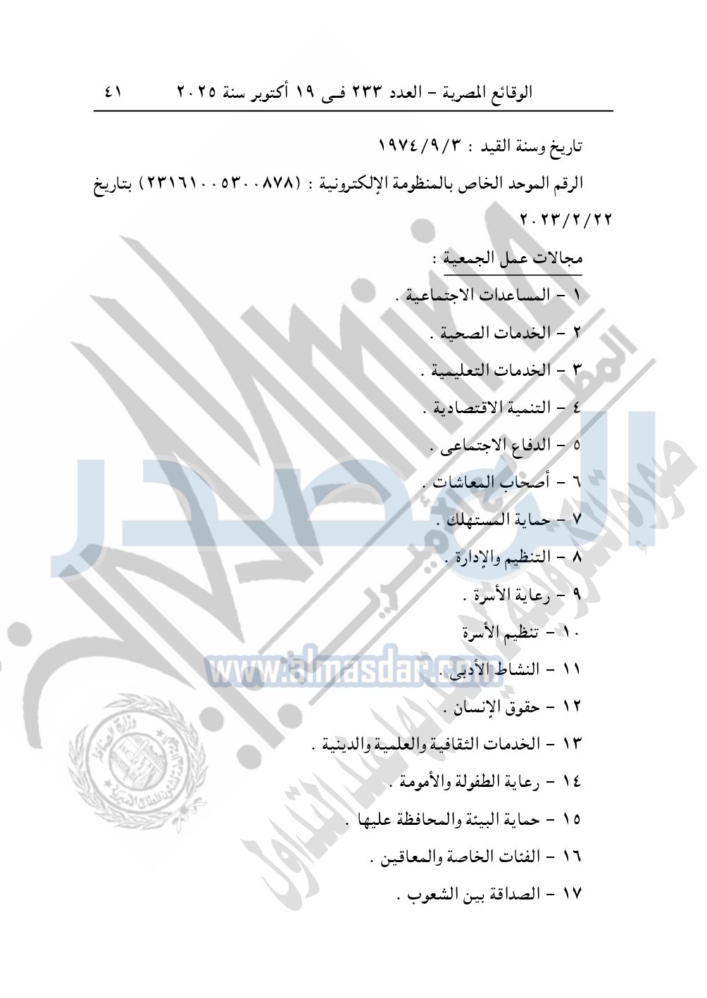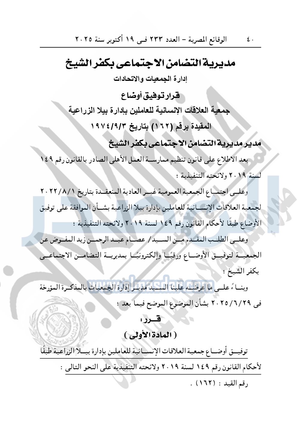 كما نشرت الوقائع المصرية في العدد 235، في 19 أكتوبر 2025، قرار مديرية التضامن الاجتماعي بكفر الشيخ، بشأن توفيق أوضاع جمعية العلافات الإنسانية للعاملين بإدارة بيلا الزراعية، المقيدة برقم "162"، بتاريخ 3-9-1974.