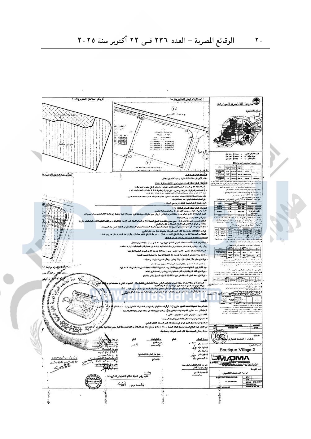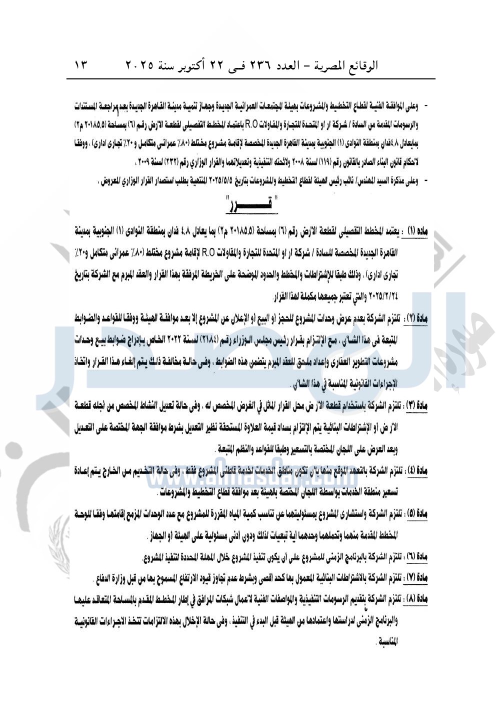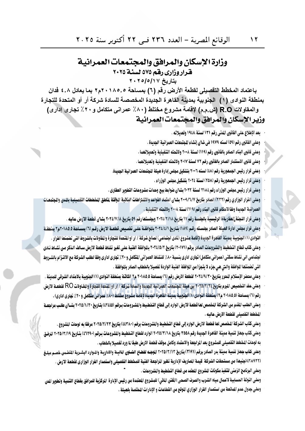 نشرت الوقائع المصرية في العدد 236، بتاريخ 22 أكتوبر 2025، قرار وزارة الإسكان والمرافق والمجتمعات العمرانية، رقم 575 لسنة 2025، بتاريخ 17-5-2025، بشأن اعتماد المخطط التفصيلى لقطعة الأرض رقم "6" بمساحة 20185.5م2 بما يعادل 4.8 فدان بمنطقة النوادى "1" الجنوبية بمدينة القاهرة الجديدة المخصصة لـ شركة أر أو المتحدة للتجارة والمقاولات R.O "ش.م.م" لإقامة مشروع مختلط "80% عمرانی متكامل و20% تجاری اداری".