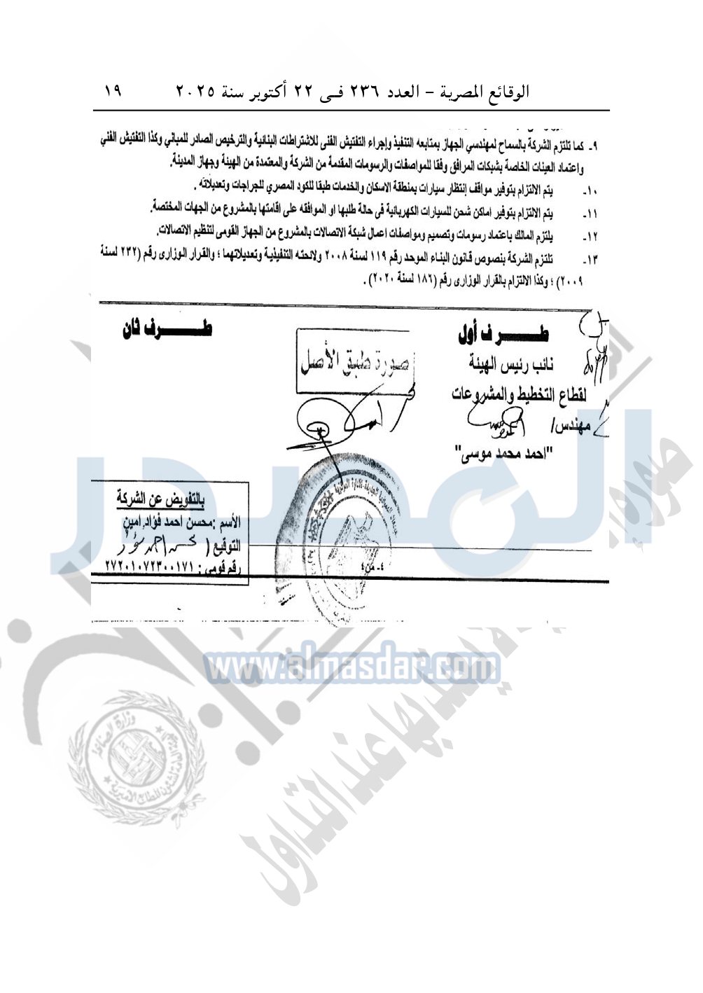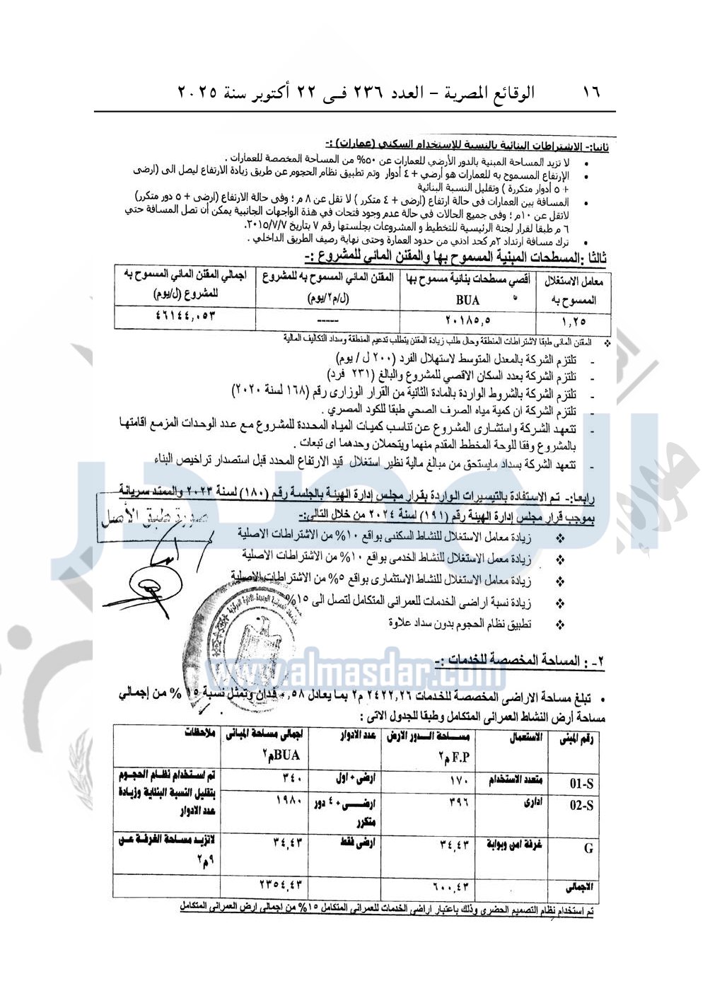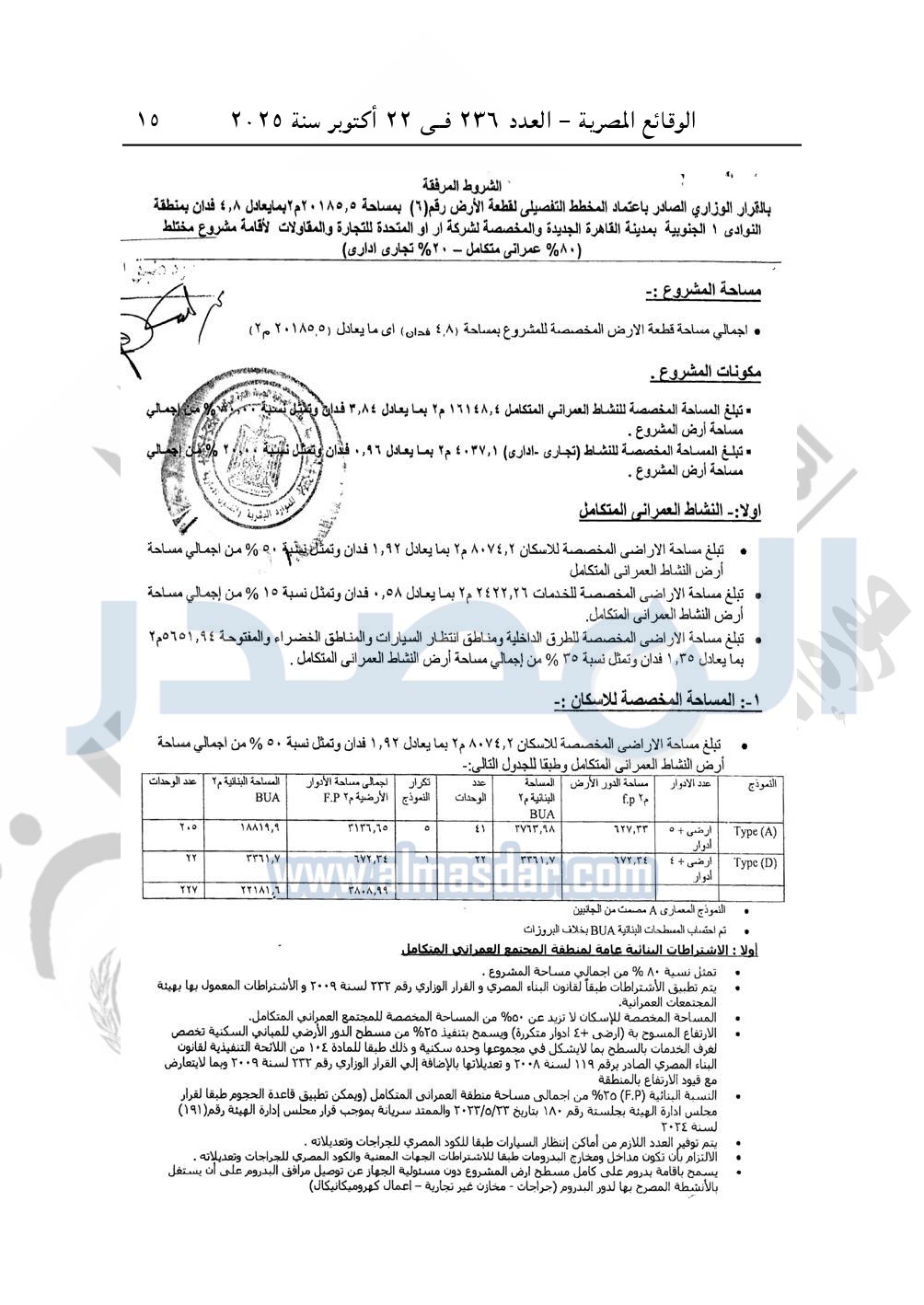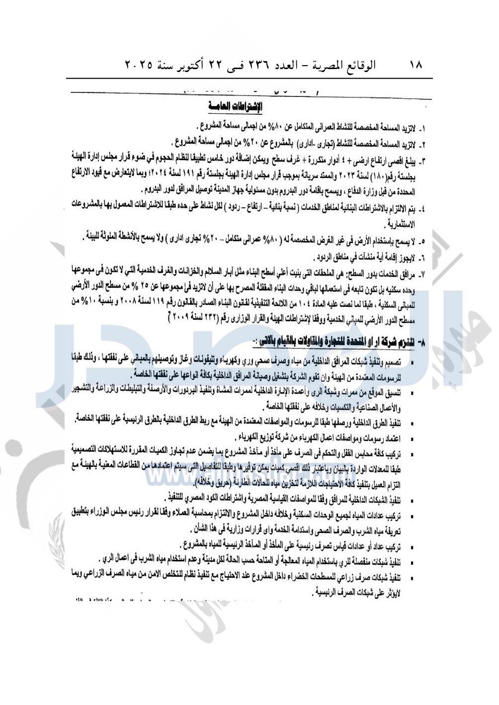 نشرت الوقائع المصرية في العدد 236، بتاريخ 22 أكتوبر 2025، قرار وزارة الإسكان والمرافق والمجتمعات العمرانية، رقم 575 لسنة 2025، بتاريخ 17-5-2025، بشأن اعتماد المخطط التفصيلى لقطعة الأرض رقم "6" بمساحة 20185.5م2 بما يعادل 4.8 فدان بمنطقة النوادى "1" الجنوبية بمدينة القاهرة الجديدة المخصصة لـ شركة أر أو المتحدة للتجارة والمقاولات R.O "ش.م.م" لإقامة مشروع مختلط "80% عمرانی متكامل و20% تجاری اداری".
