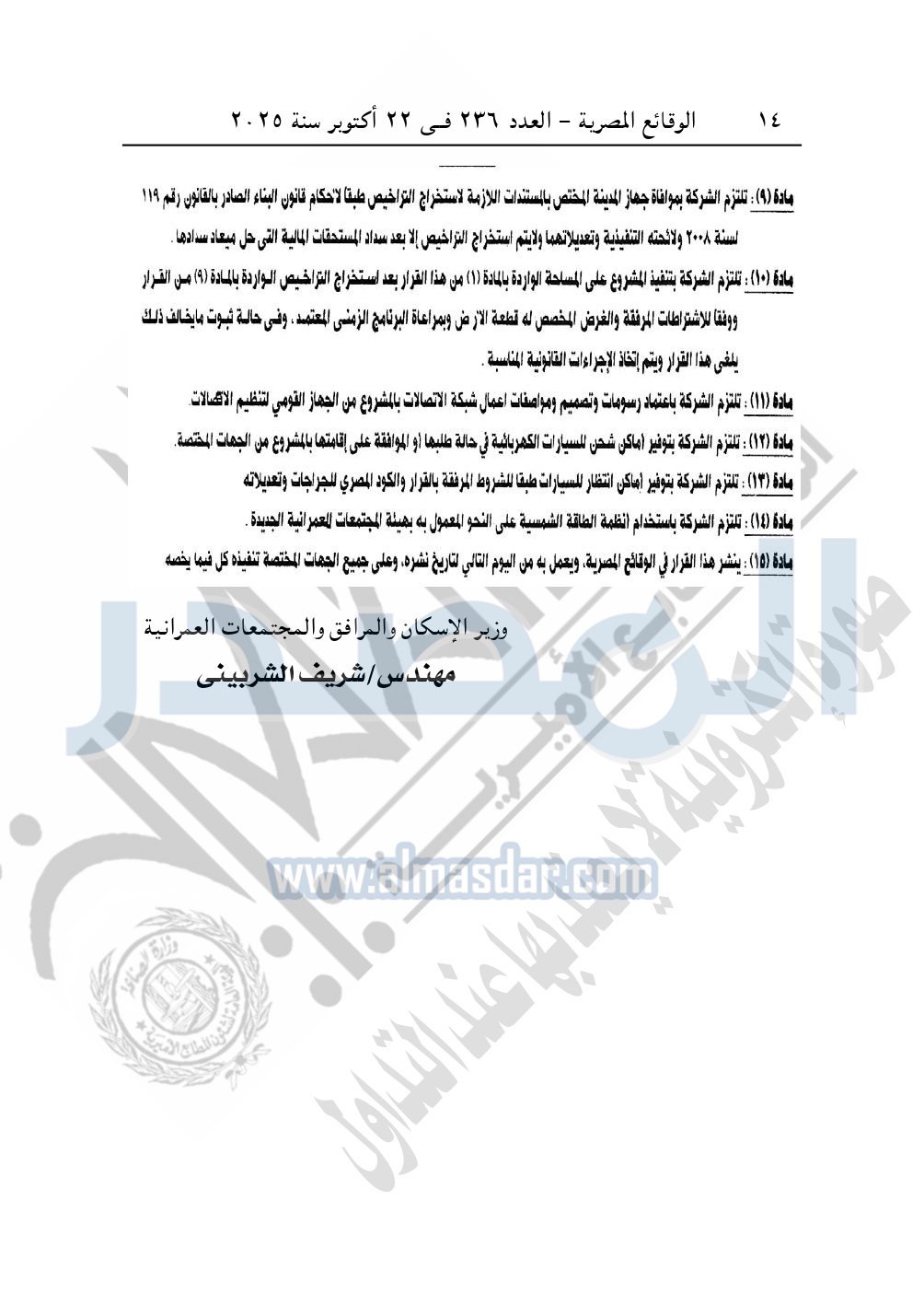 تلتزم الشركة واستشاري المشروع بمسئوليتهما عن تناسب كمية المياه المقررة للمشروع مع عدد الوحدات المزمع إقامتها وفقا للوحة المخطط المقدمة منهما وتحملهما وحدهما اية تبعيات لذلك ودون أدنى مسئولية على الهيئة أو الجهاز.