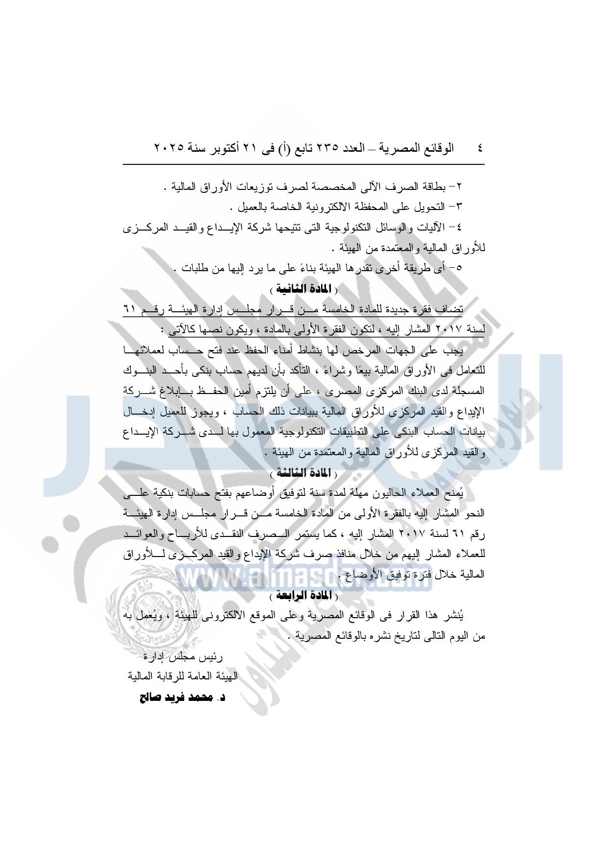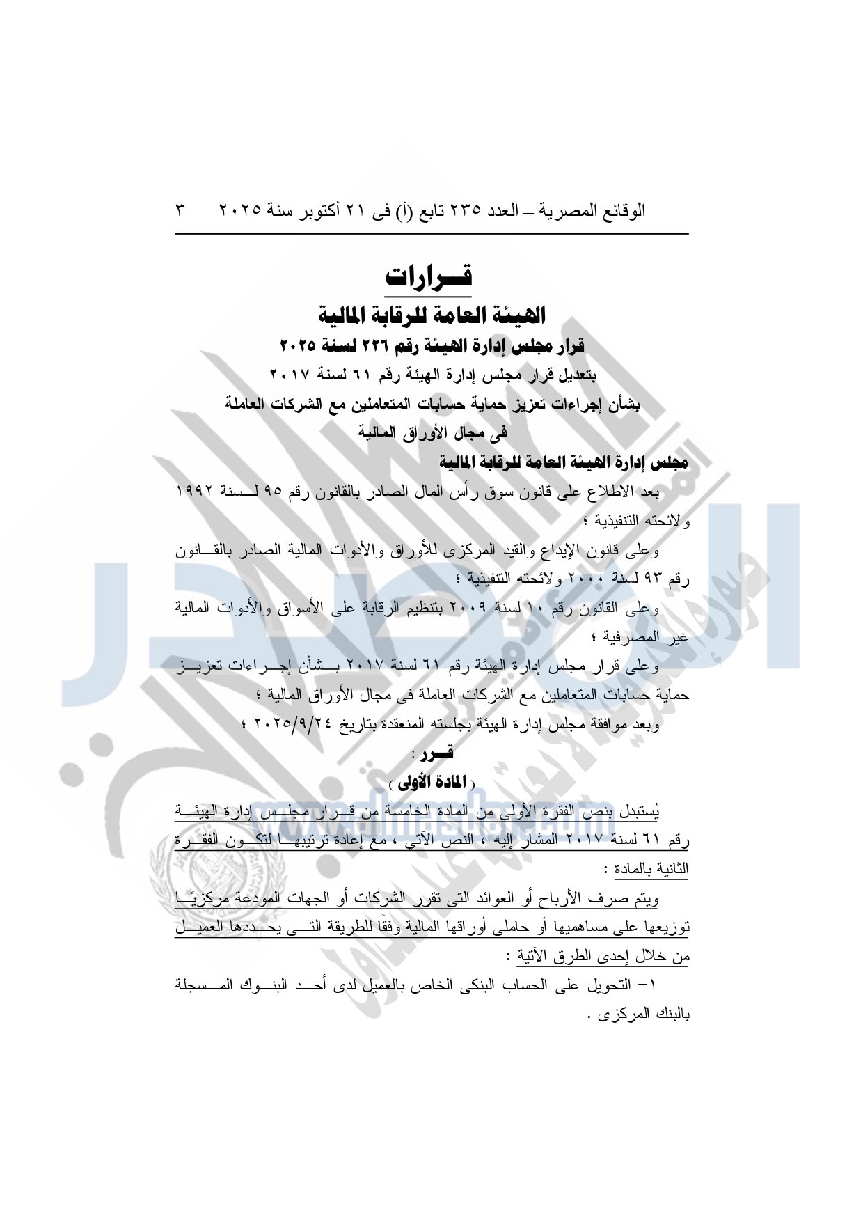 نشرت الوقائع المصرية في العدد 235 تابع "أ"، بتاريخ 21 أكتوبر 2025، قرار الهيئة العامة للرقابة المالية، رقم 226 لسنة 2025، بتعديل قرار مجلس إدارة الهيئة رقم 61 لسنة 2017، بشأن إجراءات تعزيز حماية حسابات المتعاملين مع الشركات العاملة في مجال الأوراق المالية.
